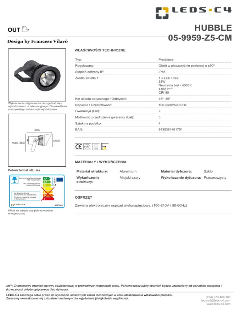 HUBBLE 05-9959-Z5-CM OUT Design by Francesc Vilaró WŁAŚCIWOŚCI TECHNICZNE Wykończenie zdjęcia może nie zgadzać się z wykończeniem nr referencyjnego. Dla określenia rzeczywistego zobacz opis wykończenia. Typ: Projektory Regulowany: Obrót w płaszczyźnie poziomej o ±90º Stopień ochrony IP: IP65 Źródło światła 1: 1 x LED Cree 33W Neutralna biel - 4000K 4162 lm(N) CRI 80 Kąt układu optycznego / Odbłyśnik: 15º, 35º Napięcie / Częstotliwość: 100-240V/50-60Hz Gwarancja (Lat): 2 Możliwość przedłużenia gwarancji (Lat): 5 Sztuk na pudełko: 4 EAN: 8435381461751 MATERIAŁY / WYKOŃCZENIA Pobierz format .ldt / .ies Materiał struktury: Aluminium Materiał dyfuzora: Szkło Wykończenie struktury: Miejski szary Wykończenie dyfuzora: Przezroczysty OSPRZĘT Zawiera elektroniczny osprzęt wielonapięciowy. (100-240V / 50-60Hz) Kliknij na zdjęcie aby pobrać etykietę energetyczną. Lm(N): Znamionowy strumień oprawy oświetleniowej w prawdziwych warunkach pracy. Państwa rzeczywisty strumień będzie uzależniony od warunków otoczenia i skuteczności układu optycznego i/lub dyfuzora. LEDS-C4 zastrzega sobie prawo do wykonania stosownych zmian technicznych w celu udoskonalenia właściwości produktu. Zalecamy skontaktować się z działem handlowym dla wyjaśnienia jakiejkolwiek wątpliwości. (+34) 973 468 100 [email protected] www.leds-c4.com 05-9959 01-02-17