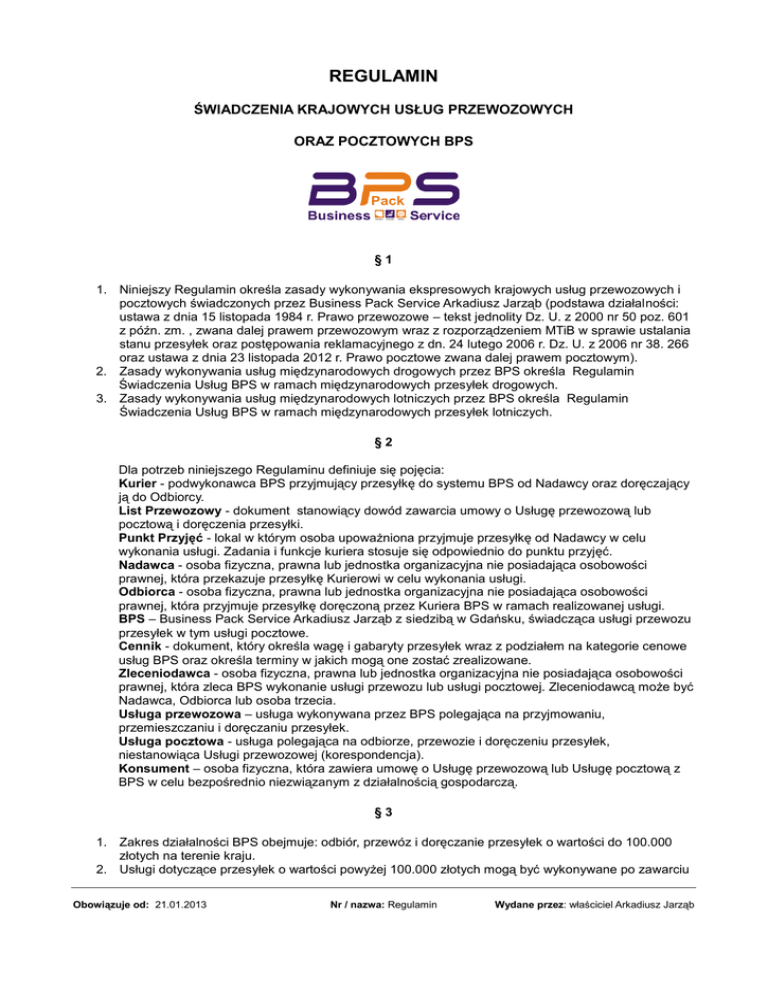 REGULAMIN ŚWIADCZENIA KRAJOWYCH USŁUG PRZEWOZOWYCH ORAZ POCZTOWYCH BPS §1 1. Niniejszy Regulamin określa zasady wykonywania ekspresowych krajowych usług przewozowych i pocztowych świadczonych przez Business Pack Service Arkadiusz Jarząb (podstawa działalności: ustawa z dnia 15 listopada 1984 r. Prawo przewozowe – tekst jednolity Dz. U. z 2000 nr 50 poz. 601 z późn. zm. , zwana dalej prawem przewozowym wraz z rozporządzeniem MTiB w sprawie ustalania stanu przesyłek oraz postępowania reklamacyjnego z dn. 24 lutego 2006 r. Dz. U. z 2006 nr 38. 266 oraz ustawa z dnia 23 listopada 2012 r. Prawo pocztowe zwana dalej prawem pocztowym). 2. Zasady wykonywania usług międzynarodowych drogowych przez BPS określa Regulamin Świadczenia Usług BPS w ramach międzynarodowych przesyłek drogowych. 3. Zasady wykonywania usług międzynarodowych lotniczych przez BPS określa Regulamin Świadczenia Usług BPS w ramach międzynarodowych przesyłek lotniczych. §2 Dla potrzeb niniejszego Regulaminu definiuje się pojęcia: Kurier - podwykonawca BPS przyjmujący przesyłkę do systemu BPS od Nadawcy oraz doręczający ją do Odbiorcy. List Przewozowy - dokument stanowiący dowód zawarcia umowy o Usługę przewozową lub pocztową i doręczenia przesyłki. Punkt Przyjęć - lokal w którym osoba upoważniona przyjmuje przesyłkę od Nadawcy w celu wykonania usługi. Zadania i funkcje kuriera stosuje się odpowiednio do punktu przyjęć. Nadawca - osoba fizyczna, prawna lub jednostka organizacyjna nie posiadająca osobowości prawnej, która przekazuje przesyłkę Kurierowi w celu wykonania usługi. Odbiorca - osoba fizyczna, prawna lub jednostka organizacyjna nie posiadająca osobowości prawnej, która przyjmuje przesyłkę doręczoną przez Kuriera BPS w ramach realizowanej usługi. BPS – Business Pack Service Arkadiusz Jarząb z siedzibą w Gdańsku, świadcząca usługi przewozu przesyłek w tym usługi pocztowe. Cennik - dokument, który określa wagę i gabaryty przesyłek wraz z podziałem na kategorie cenowe usług BPS oraz określa terminy w jakich mogą one zostać zrealizowane. Zleceniodawca - osoba fizyczna, prawna lub jednostka organizacyjna nie posiadająca osobowości prawnej, która zleca BPS wykonanie usługi przewozu lub usługi pocztowej. Zleceniodawcą może być Nadawca, Odbiorca lub osoba trzecia. Usługa przewozowa – usługa wykonywana przez BPS polegająca na przyjmowaniu, przemieszczaniu i doręczaniu przesyłek. Usługa pocztowa - usługa polegająca na odbiorze, przewozie i doręczeniu przesyłek, niestanowiąca Usługi przewozowej (korespondencja). Konsument – osoba fizyczna, która zawiera umowę o Usługę przewozową lub Usługę pocztową z BPS w celu bezpośrednio niezwiązanym z działalnością gospodarczą. §3 1. Zakres działalności BPS obejmuje: odbiór, przewóz i doręczanie przesyłek o wartości do 100.000 złotych na terenie kraju. 2. Usługi dotyczące przesyłek o wartości powyżej 100.000 złotych mogą być wykonywane po zawarciu Obowiązuje od: 21.01.2013 Nr / nazwa: Regulamin Wydane przez: właściciel Arkadiusz Jarząb z BPS odrębnej umowy. §4 1. Aktualny Cennik jest dostępny dla każdego Klienta we wszystkich Punktach Przyjęć oraz u każdego Kuriera. BPS zastrzega sobie prawo dokonywania zmian Cennika w dowolnie wybranym czasie. 2. W przypadku braku akceptacji zmiany cen Zleceniodawcy przysługuje prawo do odstąpienia od umowy. §5 1. Przesyłka może być przyjęta do przewozu w następujący sposób: W Punkcie Przyjęć - Nadawca sam dostarcza przesyłkę; U Nadawcy - przesyłkę odbiera Kurier, na podstawie wcześniejszego zgłoszenia. §6 1. Za jakość opakowania przesyłki odpowiedniego do jej zawartości odpowiada Nadawca. 2. Nadawca jest obowiązany przesyłkę właściwie opakować, a także oddać ją Kurierowi w stanie umożliwiającym jej prawidłowy przewóz i zapewniający, że nie uszkodzi ona innych przesyłek w czasie przewozu, a także wydanie jej bez ubytku i uszkodzenia. W szczególności opakowanie powinno: być odpowiednio zamknięte, uniemożliwiające dostęp do zawartości przesyłki; być odpowiednio wytrzymałe stosownie do wagi i zawartości przesyłki; posiadać zabezpieczenia wewnętrzne, uniemożliwiające przemieszczanie się zawartości przesyłki; posiadać oznakowania świadczące o specjalnym charakterze przesyłki takie jak: „UWAGA NST”, "OSTROŻNIE SZKŁO", "GÓRA" (oznakowanie może być dokonane przez Kuriera lub w Punkcie Przyjęć). 3. BPS może odmówić przyjęcia do przewozu rzeczy, których stan jest wadliwy lub opakowanie jest niedostateczne albo nie mających wymaganego opakowania. BPS nie ponosi odpowiedzialności za szkody wynikłe z braku, niedostateczności lub wadliwości opakowania. 4. W przypadku wykorzystania przez Nadawcę do przewozu przesyłek drobnicowych palet stanowiących własność BPS, a których zwrotu odmówił Odbiorca, koszty z tym związane obciążają Nadawcę przesyłki. §7 1. Nadawca ma obowiązek zamieścić na opakowaniu przesyłki swój adres oraz adres Odbiorcy, które muszą być zgodne z danymi zamieszczonymi w Liście Przewozowym. Jeżeli jest to niemożliwe, przesyłka powinna posiadać inne znaki pozwalające na jej identyfikację (np. taśmy firmowe). 2. Adres Odbiorcy/Nadawcy powinien obowiązkowo zawierać nazwę własną, nazwę ulicy, numer domu i lokalu, numer telefonu, pocztowy kod adresowy, nazwę miejscowości. §8 1. BPS nie przyjmuje do przewozu przesyłek zawierających: gotówkę, papiery wartościowe, inne dokumenty o charakterze płatniczym; przedmioty wartościowe (wyroby jubilerskie, dzieła sztuki, antyki, numizmatyki itp.); broń i amunicję; artykuły szybko psujące się, wymagające specjalnych warunków przewozu; towary chemicznie i biologicznie aktywne; zwierzęta, szczątki ludzkie i zwierzęce; narkotyki i substancje psychotropowe; leki wymagające specjalnych warunków przewozu; inne towary, które swoimi właś