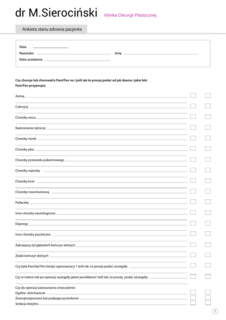 dr M.Sierociński Klinika Chirurgii Plastycznej Ankieta stanu zdrowia pacjenta Data Nazwisko Imię Data urodzenia Czy choruje lub chorował/a Pani/Pan na ( jeśli tak to proszę podać od jak dawna i jakie leki Pani/Pan przyjmuje): Astmę Cukrzycę Choroby serca Nadciśnienie tętnicze Choroby nerek Choroby płuc Choroby przewodu pokarmowego Choroby wątroby Choroby krwi Chorobę nowotworową Padaczkę Inne choroby neurologiczne Depresję Inne choroby psychiczne Zakrzepicę żył głębokich kończyn dolnych Żylaki kończyn dolnych Czy była Pani/był Pan kiedyś operowana/y ? Jeśli tak, to proszę podać szczegóły Czy w trakcie lub po operacji wystąpiły jakieś powikłania? Jeśli tak, to proszę podać szczegóły Czy do operacji zastosowano znieczulenie: Ogólne dotchawicze Zewnątrzoponowe lub podpajęczynówkowe Sedacja dożylna 1 Czy podczas znieczulenia wystąpiły jakieś powikłania? Jeśli tak, to proszę podać szczegóły Czy jest Pani uczulona/Pan uczulony na jakieś leki, pokarmy, środki chemiczne lub inne substancje? Jeśli tak, to czym się objawiają i jakie leki Pani/Pan przyjmuje? Czy miała Pani/miał Pan problemy z krzepnięciem krwi? Czy Pani rodziła (jeśli tak to proszę podać lata porodów)? Czy miesiączkuje Pani regularnie? Czy przyjmuje Pani hormonalne środki antykoncepcyjne lub hormonalną terapię zastępczą? Czy pali Pani/Pan papierosy ? Jeśli tak to od jak dawna i ile? Czy pije Pani/Pan napoje alkoholowe?Jeśli tak to jak często i w jakiej ilości? Podpis pacjenta/pacjentki 2