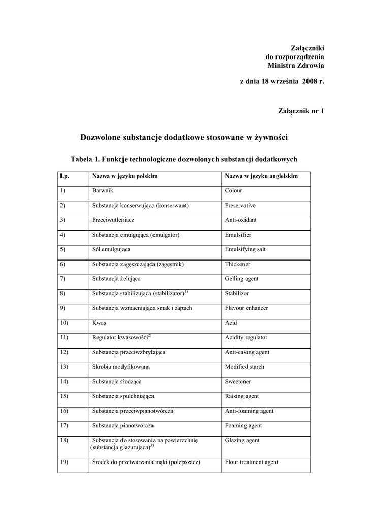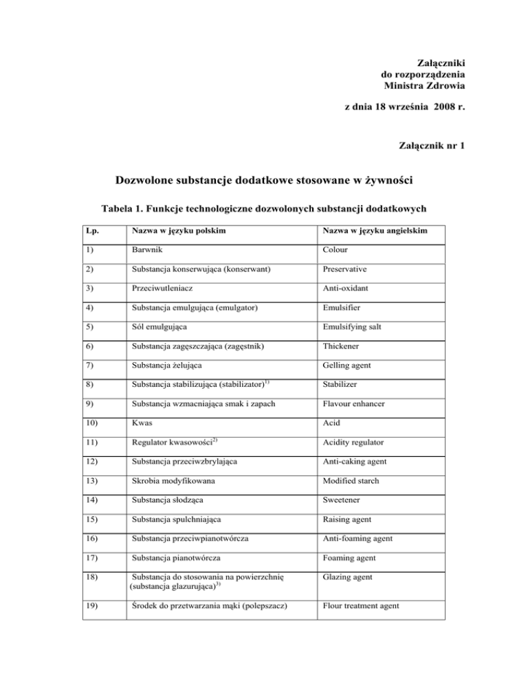 Załączniki do rozporządzenia Ministra Zdrowia z dnia 18 września 2008 r. Załącznik nr 1 Dozwolone substancje dodatkowe stosowane w żywności Tabela 1. Funkcje technologiczne dozwolonych substancji dodatkowych Lp. Nazwa w języku polskim Nazwa w języku angielskim 1) Barwnik Colour 2) Substancja konserwująca (konserwant) Preservative 3) Przeciwutleniacz Anti-oxidant 4) Substancja emulgująca (emulgator) Emulsifier 5) Sól emulgująca Emulsifying salt 6) Substancja zagęszczająca (zagęstnik) Thickener 7) Substancja żelująca Gelling agent 8) Substancja stabilizująca (stabilizator)1) Stabilizer 9) Substancja wzmacniająca smak i zapach Flavour enhancer 10) Kwas Acid 11) Regulator kwasowości2) Acidity regulator 12) Substancja przeciwzbrylająca Anti-caking agent 13) Skrobia modyfikowana Modified starch 14) Substancja słodząca Sweetener 15) Substancja spulchniająca Raising agent 16) Substancja przeciwpianotwórcza Anti-foaming agent 17) Substancja pianotwórcza Foaming agent 18) Substancja do stosowania na powierzchnię (substancja glazurująca)3) Glazing agent 19) Środek do przetwarzania mąki (polepszacz) Flour treatment agent 20) Substancja wiążąca (teksturotwórcza) Firming agent 21) Substancja utrzymująca wilgotność Humectant 22) Sekwestrant (substancja maskująca jony)4) Sequestrant 23) Substancja wypełniająca Bulking agent 24) Gaz nośny Propellent gas 25) Gaz do pakowania Packaging gas 26) Nośnik Carrier 27) Enzym4)5) Enzyme 1) Ta kategoria obejmuje również stabilizatory piany. Substancje z tej kategorii mogą zwiększać lub zmniejszać kwasowość produktu. 3) Ta kategoria obejmuje również substancje poślizgowe. 4) Włączenie tych terminów do niniejszego wykazu nie wpływa na przyszłe decyzje lub wzmianki o nich na etykietach środków spożywczych przeznaczonych dla konsumenta finalnego. 5) Dotyczy tylko enzymów stosowanych jako substancje dodatkowe. 2) Tabela 2. Wykaz dozwolonych substancji dodatkowych Lp. Numer wg Nazwa w języku polskim systemu oznaczeń Unii Europejsk iej Nazwa w języku angielskim 1) E 100 Kurkumina Curcumin 2) E 101 (i) Ryboflawina (i) Riboflavin (ii) Ryboflawiny-5'-fosforan (ii) Riboflavin-5'-phosphate 3) E 102 Tartrazyna Tartrazine 4) E 104 Żółcień chinolinowa Quinoline Yellow 5) E 110 Żółcień pomarańczowa FCF Żółcień pomarańczowa S, Sunset Yellow FCF Orange Yellow S 6) E 120 Koszenila, kwas karminowy, karminy Cochineal, Carminic acid, Carmines 7) E 122 Azorubina, karmoizyna Azorubine, Carmoisine 8) E 123 Amarant Amaranth 9) E 124 Czerwień koszenilowa A, Ponceau 4R, Pąs 4R Cochineal Red A 10) E 127 Erytrozyna Erythrosine 11) E 129 Czerwień Allura AC Allura Red AC 12) E 131 Błękit patentowy V Patent Blue V 13) E 132 Indygotyna, Indygokarmin Indigotine, Indigo carmine 14) E 133 Błękit brylantowy FCF Brilliant Blue FCF 15) E 140 Chlorofile i chlorofiliny Chlorophylls and chlorophyllins (i) Chlorofile (i) Chlorophylls (ii) Chlorofiliny (ii) Chlorophyllins Kompleksy miedziowe chlorofili i chlorofilin Copper complexes of chlorophylls and chlorophyllins (i) Kompleksy miedziowe chlorofili (i) Copper complexe of chlorophylls (ii) Kompleksy miedziowe chlorofilin (ii) Copper complexe of chlorophyllins 16) E 141 17) E 142 Zieleń S Green S 18) E 150a Karmel Plain caramel 19) E 150b Karmel siarczynowy Caustic sulphite caramel 20) E 150c Karmel amoniakalny Ammonia caramel 21) E 150d Karmel amoniakalno-siarczynowy Sulphite ammonia caramel 22) E 151 Czerń brylantowa BN, czerń PN Brilliant Black BN, Black PN 23) E 153 Węgiel roślinny Vegetable carbon 24) E 154 Brąz FK Brown FK 25) E 155 Brąz HT Brown HT 26) E 160a Karoteny Carotenes (i) Mieszanina karotenów (i) Mixed carotenes (ii) Beta-karoten (ii) Beta-carotene 27) E 160b Annato, biksyna, norbiksyna Annato, bixin, norbixin 28) E 160c Ekstrakt z papryki, kapsantyna, kapsorubina Paprika extract, capsanthin, capsorubin 29) E 160d Likopen Lycopene 30) E 160e Beta-apo-8'-karotenal (C 30) Beta-apo-8'-carotenal (C 30) 31) E 160f Ester etylowy kwasu beta-apo-8'karotenowego (C 30) Ethyl ester of beta-apo-8'carotenic acid (C 30) 32) E 161b Luteina Lutein 33) E 161g Kantaksantyna Canthaxanthin 34) E 162 Czerwień buraczana, betanina Beetroot Red, betanin 35) E 163 Antocyjany Anthocyanins 36) E 170 Węglan wapnia Calcium carbonate 37) E 171 Dwutlenek tytanu Titanum dioxide 38) E 172 Tlenki żelaza i wodorotlenki żelaza Iron oxides and hydroxides 39) E 173 Glin Aluminium 40) E 174 Srebro Silver 41) E 175 Złoto Gold 42) E 180 Czerwień litolowa BK Litholrubine BK 43) E 200 Kwas sorbowy Sorbic acid 44) E 202 Sorbinian potasu Potassium sorbate 45) E 203 Sorbinian wapnia Calcium sorbate 46) E 210 Kwas benzoesowy Benzoic acid 47) E 211 Benzoesan sodu Sodium benzoate 48) E 212 Benzoesan potasu Potassium benzoate 49) E 213 Benzoesan wapnia Calcium benzoate 50) E 214 p-Hydroksybenzoesan etylu Ethyl p-hydroxybenzoate 51) E 215 Sól sodowa p-hydroksybenzoesanu etylu Sodium ethyl p-hydroxybenzoate 52) E 218 p-Hydroksybenzoesan metylu Methyl p-hydroxybenzoate 53) E 219 Sól sodowa p-hydroksybenzoesanu metylu Sodium methyl p-hydroxybenzoate 54) E 220 Dwutlenek siarki (bezwodnik kwasu siarkawego) Sulphur dioxide 55) E 221 Siarczyn sodu Sodium sulphite 56) E 222 Wodorosiarczyn sodu Sodium hydrogen sulphite 57) E 223 Pirosiarczyn sodu Sodium metabisulphite 58) E 224 Pirosiarczyn potasu Potassium metabisulphite 59) E 226 Siarczyn wapnia Calcium sulphite 60) E 227 Wodorosiarczyn wapnia Calcium hydrogen sulphite 61) E 228 Wodorosiarczyn potasu Potassium hydrogen sulphite 62) E 231 Ortofenylofenol Orthophenyl phenol 63) E 232 Sól sodowa ortofenylofenolu Sodium orthophenyl phenol 64) E 234 Nizyna Nisin 65) E 235 Natamycyna Natamycin, Pimaricin 66) E 239 Heksametylenoczteroamina Hexamethylene tetramine 67) E 242 Dimetylodiwęglan Dimethyl dicarbonate 68) E 249 Azotyn potasu Potassium nitrite 69) E 250 Azotyn sodu Sodium nitrite 70) E 251 Azotan sodu Sodium nitrate 71) E 252 Azotan potasu Pot