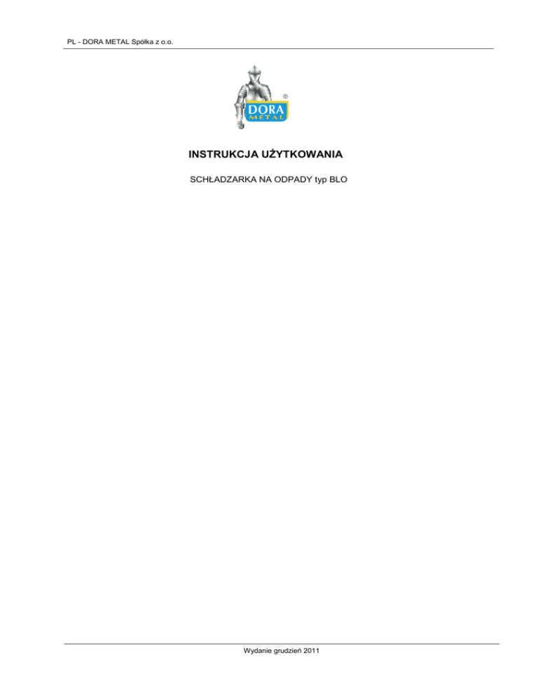 PL - DORA METAL Spółka z o.o. INSTRUKCJA UŻYTKOWANIA SCHŁADZARKA NA ODPADY typ BLO Wydanie grudzień 2011 PL - DORA METAL Spółka z o.o. Tym znakiem oznaczone są informacje o szczególnym znaczeniu dla bezpieczeństwa użytkownika oraz prawidłowej eksploatacji urządzenia. Przed rozpoczęciem pracy z urządzeniem należy dokładnie zaznajomić się z niniejszą instrukcją użytkowania SPIS TREŚCI PRZEZNACZENIE .......................................................................................................3 DZIAŁANIE INSTALACJI CHŁODNICZEJ. ...................................................................3 NASTAWA TEMPERATURY WNĘTRZA .....................................................................3 PRZYGOTOWANIE DO URUCHOMIENIA...................................................................4 PRZYŁĄCZENIE DO INSTALACJI ELEKTRYCZNEJ...................................................4 EKSPLOATACJA .........................................................................................................4 ZASADY PRAWIDŁOWEJ I BEZPIECZNEJ PRACY....................................................4 TRANSPORT ...............................................................................................................5 DANE TECHNICZNE ...................................................................................................5 TABLICZKA ZNAMIONOWA ........................................................................................5 2 schładzarka na odpady PL - DORA METAL Spółka z o.o. . PRZEZNACZENIE Schładzarka przeznaczona jest do krótkotrwałego przechowywania odpadów gastronomicznych takich jak resztki jedzenia, odpadki spożywcze w przeznaczonych do tego pojemnikach oraz likwidowania nieprzyjemnych zapachów. DZIAŁANIE INSTALACJI CHŁODNICZEJ. W urządzeniu odbywa się jednostopniowy, sprężarkowy obieg chłodniczy. Układ chłodniczy wypełniony jest ekologicznym czynnikiem chłodniczym R404A. Elementem rozprężnym jest rurka kapilarna. NASTAWA TEMPERATURY WNĘTRZA Sterownik zaprogramowany jest tak, aby urządzenie osiągało temperaturę wnętrza podaną w danych technicznych. Włączenie zasilania dokonujemy wyłącznikiem klawiszowym znajdującym się na panelu sterującym urządzenia bądź też naciskając przycisk sterownika. Stan załączenia sygnalizowany jest pojawieniem się na wyświetlaczu sterownika wartości temperatury powietrza w komorze. W celu zaprogramowania żądanej temperatury komory należy: Nacisnąć przycisk temperatury. . Obok przycisku zaświeci się kontrolka a na wyświetlaczu pojawi się aktualnie zaprogramowana wartość Naciśnij przycisk , aby zwiększyć wartość temperatury. Naciśnij przycisk , aby zmniejszyć wartość temperatury. Naciśnij ponownie przycisk w celu zatwierdzenia wprowadzonej wartości temperatury. Kontrolka obok przycisku zagaśnie a na wyświetlaczu pojawi się wartość temperatury w komorze chłodzonej. Od tej chwili sterownik rozpocznie realizację nowego programu. Jeżeli po zmianie wartości temperatury przycisk nie zostanie naciśnięty, sterownik po około 5 sekundach samoczynnie wyjdzie z procedury programowania. W takim przypadku nowe ustawienia nie zostaną zapamiętane, a sterownik będzie realizował dotychczasowy program. 1. Rozmrażanie (odszranianie): Podczas pracy urządzenia w regularnych odstępach czasu na wyświetlaczu pojawia się napis dF oznacza to, że urządzenie pracuje w trybie rozmrażania chłodnicy. Cykl rozmrażania oraz czas jego trwania, określa producent urządzenia i użytkownik nie ma wpływu na ten parametr. Jeśli zachodzi potrzeba dodatkowego rozmrożenia chłodnicy, spowodowane trudnymi warunkami pracy urządzenia, należy nacisnąć przycisk . Na wyświetlaczu pojawi się napis dF a obok przycisku zaświeci się kontrolka. Rozmrażanie zostanie zakończone automatycznie po czasie lub osiągnięciu temperatury zaprogramowanej przez producenta. 2. Alarmy: Znaczenie napisów mogących pojawić się na wyświetlaczu: A1 – Uszkodzenie komorowego czujnika temperatury. Sterownik będzie załączał urządzenie w cyklu czasowym, według czasów zaprogramowanych przez producenta. Rozmrażanie będzie funkcjonowało normalnie. W celu usunięcia usterki wezwać serwis. A2 – Uszkodzenie parownikowego czujnika temperatury. Sterownik nie będzie realizował cyklu automatycznego oraz ręcznego rozmrażania. W takim przypadku jedyną możliwością rozmrożenia chłodnicy jest wyłączenie urządzenia i poczekanie na naturalne roztopienie się lodu na chłodnicy. W celu usunięcia usterki wezwać serwis. dF – załączony cykl rozmrażania (patrz punkt ROZMRAŻANIE) Schładzarka na odpady 3 PL - DORA METAL Spółka z o.o. PRZYGOTOWANIE DO URUCHOMIENIA Przed pierwszym uruchomieniem należy usunąć folię ochronną. Powierzchnie zewnętrzne i wewnętrzne umyć ciepłą wodą z dodatkiem środka odtłuszczającego, stosowanego do mycia naczyń kuchennych. Nie należy stosować środków ścierających i innych, które mogłyby zarysować powierzchnię. Do mycia nie używać strumienia wody a jedynie wilgotnej ściereczki. Po umyciu wyrobu, przed podłączeniem do sieci elektrycznej, urządzenie pozostawić do całkowitego wyschnięcia. Urządzenie powinno być ustawione z dala od źródeł ciepła, w miejscu nienarażonym na działanie promieni słonecznych. Poziomowanie urządzenia wykonać poprzez wkręcenie lub wykręcenie nóg regulowanych. Dokładne poziomowanie urządzenia zapobiegnie głośnej pracy sprężarki. PRZYŁĄCZENIE DO INSTALACJI ELEKTRYCZNEJ Urządzenie jest przystosowane do zasilania z sieci 230V 50Hz i powinno być zasilane z osobnego obwodu niskiego napięcia zabezpieczonego bezpiecznikami nie większymi niż 10 A. Urządzenie wyposażone jest w przewód ochronny PE. Przed wymianą przewodu przyłączeniowego należy przewód giętki wyposażyć w odpowiednie końcówki (przyłączenie typu Y). Uruchomienie urządzenia, może nastąp