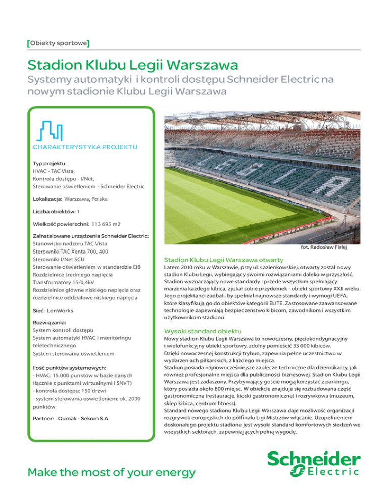 Obiekty sportowe Stadion Klubu Legii Warszawa Systemy automatyki i kontroli dostępu Schneider Electric na nowym stadionie Klubu Legii Warszawa CHARAKTERYSTYKA PROJEKTU Typ projektu HVAC - TAC Vista, Kontrola dostępu - I/Net, Sterowanie oświetleniem - Schneider Electric Lokalizacja: Warszawa, Polska Liczba obiektów: 1 Wielkość powierzchni: 113 695 m2 Zainstalowane urządzenia Schneider Electric: Stanowisko nadzoru TAC Vista Sterowniki TAC Xenta 700, 400 Sterowniki I/Net SCU Sterowanie oświetleniem w standardzie EIB Rozdzielnice średniego napięcia Transformatory 15/0,4kV Rozdzielnice główne niskiego napięcia oraz rozdzielnice oddziałowe niskiego napięcia Sieć: LonWorks Rozwiązania: System kontroli dostępu System automatyki HVAC i monitoringu teletechnicznego System sterowania oświetleniem Ilość punktów systemowych: - HVAC: 15.000 punktów w bazie danych (łącznie z punktami wirtualnymi i SNVT) - kontrola dostępu: 150 drzwi - system sterowania oświetleniem: ok. 2000 punktów Partner: Qumak - Sekom S.A. fot. Radosław Firlej Stadion Klubu Legii Warszawa otwarty Latem 2010 roku w Warszawie, przy ul. Łazienkowskiej, otwarty został nowy stadion Klubu Legii, wybiegający swoimi rozwiązaniami daleko w przyszłość. Stadion wyznaczający nowe standardy i przede wszystkim spełniający marzenia każdego kibica, zyskał sobie przydomek - obiekt sportowy XXII wieku. Jego projektanci zadbali, by spełniał najnowsze standardy i wymogi UEFA, które klasyfikują go do obiektów kategorii ELITE. Zastosowane zaawansowane technologie zapewniają bezpieczeństwo kibicom, zawodnikom i wszystkim użytkownikom stadionu. Wysoki standard obiektu Nowy stadion Klubu Legii Warszawa to nowoczesny, pięciokondygnacyjny i wielofunkcyjny obiekt sportowy, zdolny pomieścić 33 000 kibiców. Dzięki nowoczesnej konstrukcji trybun, zapewnia pełne uczestnictwo w wydarzeniach piłkarskich, z każdego miejsca. Stadion posiada najnowocześniejsze zaplecze techniczne dla dziennikarzy, jak również profesjonalne miejsca dla publiczności biznesowej. Stadion Klubu Legii Warszawa jest zadaszony. Przybywający goście mogą korzystać z parkingu, który posiada około 800 miejsc. W obiekcie znajduje się rozbudowana część gastronomiczna (restauracje, kioski gastronomiczne) i rozrywkowa (muzeum, sklep kibica, centrum fitness). Standard nowego stadionu Klubu Legii Warszawa daje możliwość organizacji rozgrywek europejskich do półfinału Ligi Mistrzów włącznie. Uzupełnieniem doskonałego projektu stadionu jest wysoki standard komfortowych siedzeń we wszystkich sektorach, zapewniających pełną wygodę. Make the most of your energy Obiekty sportowe Stadion Klubu Legii Warszawa Automatyka klimakonwektorów wykorzystuje strefowe sterowniki I/A Series MNL-20RF3. Sterowanie oświetleniem (płyta boiska, iluminacja elewacji, ciągi komunikacyjne) zaprojektowano z użyciem produktów rodziny MTN Schneider Electric, wykorzystujących standard EIB. System kontroli dostępu bazuje na sterownikach i modułach drzwiowych I/Net i obsługuje około 150 przejść w całym obiekcie. Układ zastosowanych rozwiązań pozwala na monitoring stanu systemu elektroenergetycznego w budynku. W tym celu oprócz klasycznych sygnałów podłączanych do sterowników programowalnych wykorzystano analizatory sieci serii PM Schneider Electric z komunikacją ModBus. Rozwiązania Projektując nowoczesny stadion, Klient końcowy szukał rozwiązania, które pozwoli efektywnie zarządzać obiektem, a jednocześnie umożliwi optymalizację kosztów zużycia energii. Jedną z głównych przesłanek decydujących o wyborze systemu była jego niezawodność i możliwość integracji urządzeń różnych, niezależnych producentów. Wykonawca instalacji, Firma Partnerska QumakSekom, zdecydowała się na zastosowanie urządzeń Schneider Electric biorąc pod uwagę ich jakość i możliwości techniczne. Duże znaczenie miała również wiedza i dotychczasowe doświadczenie inżynierów Qumak-Sekom stosujących rozwiązania Schneider Electric, którzy cenią sobie wysoką jakość wsparcia technicznego otrzymywanego od Producenta. Zastosowany system automatyki budynkowej Schneider Electirc zapewnia pełny monitoring i możliwość sterowania większością instalacji teletechnicznych budynku. Układ zbudowany jest w oparciu o wiele rodzin produktowych z oferty Schneider Electric Buildings. Aplikacje sterujące instalacjami węzła cieplnego, system nawadniania i monitoring podgrzewania murawy, monitoring statusu piętrowych rozdzielnic elektrycznych oparte są o swobodnie programowalne sterowniki z rodziny TAC Xenta 700 i TAC Xenta 400. Duży nacisk został położony na pełną współpracę i integrację z użyciem technologii LonWorks. System BMS - TAC Vista - posiadający w bazie danych około 15 000 punktów, komunikuje się z większością urządzeń w budynku z wykorzystaniem bazy LNS. Dzięki bezpośrednim połączeniom poprzez sieć LON z urządzeniami różnych producentów (np. centrale wentylacyjne SVEGON, szafy klimatyzacji precyzyjnej Emmerson, pompy Wilo, agregaty chłodnicze Carrier), uzyskano pełną integrację różnych systemów, która zapewnia obsłudze technicznej możliwość prowadzenia optymalnego serwisu i szybkę reakcję na sytuacje awaryjne. Zastosowanie protokułu LonTalk oraz urządzeń Schneider Electric znacznie przyspieszyło prace związane z uruchomieniem BMS oraz pozwoliło na prezentację informacji, które w klasycznych rozwiązaniach byłyby niedostępne dla Użytkowania. “Sukcesem w realizacji projektu było zainstalowanie i uruchomienie systemu sterowania oświetleniem płyty boiska, stref zewnętrznych oraz systemu automatyki i sterowania. Docelowo będzie to ponad 1000 opraw o łącznej mocy ponad 1 MW. Wielkość instalacji systemu automatyki i sterowania porównywalna jest do dużej galerii handlowej z monitoringiem sygnałów z analizatorów sieci” Wojciech Miłuński Kierownik k