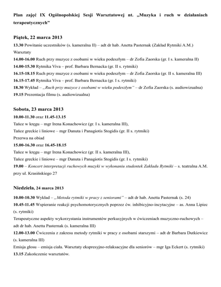 Plan zajęć IX Ogólnopolskiej Sesji Warsztatowej nt. „Muzyka i ruch w działaniach terapeutycznych” Piątek, 22 marca 2013 13.30 Powitanie uczestników (s. kameralna II) – adt dr hab. Anetta Pasternak (Zakład Rytmiki A.M.) Warsztaty 14.00-16.00 Ruch przy muzyce z osobami w wieku podeszłym – dr Zofia Zaorska (gr. I s. kameralna II) 14.00-15.30 Rytmika Viva – prof. Barbara Bernacka (gr. II s. rytmiki) 16.15-18.15 Ruch przy muzyce z osobami w wieku podeszłym – dr Zofia Zaorska (gr. II s. kameralna III) 16.15-17.45 Rytmika Viva – prof. Barbara Bernacka (gr. I s. rytmiki) 18.30 Wykład – „Ruch przy muzyce z osobami w wieku podeszłym” – dr Zofia Zaorska (s. audiowizualna) 19.15 Prezentacja filmu (s. audiowizualna) Sobota, 23 marca 2013 10.00-11.30 oraz 11.45-13.15 Tańce w kręgu – mgr Irena Konachowicz (gr. I s. kameralna III), Tańce greckie i liniowe – mgr Danuta i Panagiotis Stogidis (gr. II s. rytmiki) Przerwa na obiad 15.00-16.30 oraz 16.45-18.15 Tańce w kręgu – mgr Irena Konachowicz (gr. II s. kameralna III), Tańce greckie i liniowe – mgr Danuta i Panagiotis Stogidis (gr. I s. rytmiki) 19.00 – Koncert interpretacji ruchowych muzyki w wykonaniu studentek Zakładu Rytmiki – s. teatralna A.M. przy ul. Krasińskiego 27 Niedziela, 24 marca 2013 10.00-10.30 Wykład – „Metoda rytmiki w pracy z seniorami” – adt dr hab. Anetta Pasternak (s. 24) 10.45-11.45 Wspieranie reakcji psychomotorycznych poprzez ćw. inhibicyjno-incytacyjne – as. Anna Lipiec (s. rytmiki) Terapeutyczne aspekty wykorzystania instrumentów perkusyjnych w ćwiczeniach muzyczno-ruchowych – adt dr hab. Anetta Pasternak (s. kameralna III) 12.00-13.00 Ćwiczenia z zakresu metody rytmiki w pracy z osobami starszymi – adt dr Barbara Dutkiewicz (s. kameralna III) Emisja głosu – emisja ciała. Warsztaty ekspresyjno-relaksacyjne dla seniorów – mgr Iga Eckert (s. rytmiki) 13.15 Zakończenie warsztatów.
