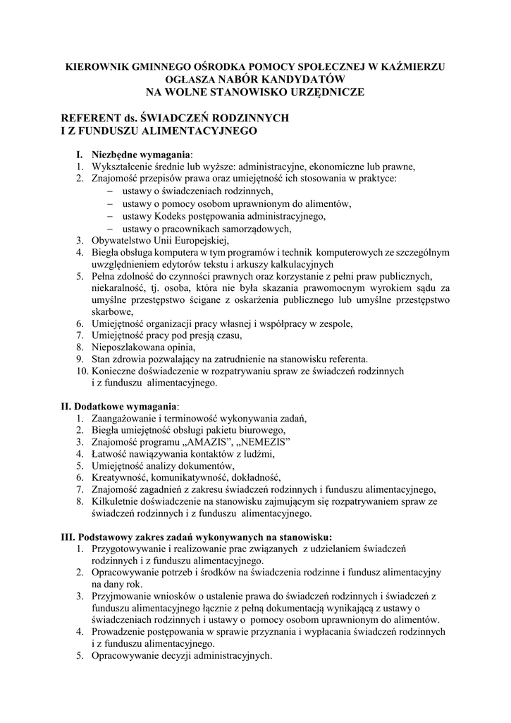 KIEROWNIK GMINNEGO OŚRODKA POMOCY SPOŁECZNEJ W KAŹMIERZU OGŁASZA NABÓR KANDYDATÓW NA WOLNE STANOWISKO URZĘDNICZE REFERENT ds. ŚWIADCZEŃ RODZINNYCH I Z FUNDUSZU ALIMENTACYJNEGO I. Niezbędne wymagania: 1. Wykształcenie średnie lub wyższe: administracyjne, ekonomiczne lub prawne, 2. Znajomość przepisów prawa oraz umiejętność ich stosowania w praktyce: ustawy o świadczeniach rodzinnych, ustawy o pomocy osobom uprawnionym do alimentów, ustawy Kodeks postępowania administracyjnego, ustawy o pracownikach samorządowych, 3. Obywatelstwo Unii Europejskiej, 4. Biegła obsługa komputera w tym programów i technik komputerowych ze szczególnym uwzględnieniem edytorów tekstu i arkuszy kalkulacyjnych 5. Pełna zdolność do czynności prawnych oraz korzystanie z pełni praw publicznych, niekaralność, tj. osoba, która nie była skazania prawomocnym wyrokiem sądu za umyślne przestępstwo ścigane z oskarżenia publicznego lub umyślne przestępstwo skarbowe, 6. Umiejętność organizacji pracy własnej i współpracy w zespole, 7. Umiejętność pracy pod presją czasu, 8. Nieposzlakowana opinia, 9. Stan zdrowia pozwalający na zatrudnienie na stanowisku referenta. 10. Konieczne doświadczenie w rozpatrywaniu spraw ze świadczeń rodzinnych i z funduszu alimentacyjnego. II. Dodatkowe wymagania: 1. Zaangażowanie i terminowość wykonywania zadań, 2. Biegła umiejętność obsługi pakietu biurowego, 3. Znajomość programu „AMAZIS”, „NEMEZIS” 4. Łatwość nawiązywania kontaktów z ludźmi, 5. Umiejętność analizy dokumentów, 6. Kreatywność, komunikatywność, dokładność, 7. Znajomość zagadnień z zakresu świadczeń rodzinnych i funduszu alimentacyjnego, 8. Kilkuletnie doświadczenie na stanowisku zajmującym się rozpatrywaniem spraw ze świadczeń rodzinnych i z funduszu alimentacyjnego. III. Podstawowy zakres zadań wykonywanych na stanowisku: 1. Przygotowywanie i realizowanie prac związanych z udzielaniem świadczeń rodzinnych i z funduszu alimentacyjnego. 2. Opracowywanie potrzeb i środków na świadczenia rodzinne i fundusz alimentacyjny na dany rok. 3. Przyjmowanie wniosków o ustalenie prawa do świadczeń rodzinnych i świadczeń z funduszu alimentacyjnego łącznie z pełną dokumentacją wynikającą z ustawy o świadczeniach rodzinnych i ustawy o pomocy osobom uprawnionym do alimentów. 4. Prowadzenie postępowania w sprawie przyznania i wypłacania świadczeń rodzinnych i z funduszu alimentacyjnego. 5. Opracowywanie decyzji administracyjnych. 6. Sporządzanie list wypłat świadczeniobiorców, przelewów bankowych, przekazów oraz przesyłek pocztowych. 7. Terminowe przyznawanie i realizowanie świadczeń. 8. Prowadzenie rejestru wniosków wydawanych decyzji oraz teczek z dokumentacją świadczeniobiorców. 9. Wykonywanie wszystkich czynności związanych z obsługą programu komputerowego AMAZIS i NEMEZIS. 10. Wykonywanie wszelkich sprawozdań świadczeń rodzinnych i funduszu alimentacyjnego. 11. Weryfikacja i aktualizacja świadczeń rodzinnych i świadczeń z funduszu alimentacyjnego. 12. Gospodarowanie środkami budżetowymi będącymi w dyspozycji danego stanowiska pracy i kontrolowanie prawidłowości ich wykorzystania. 13. Comiesięczne przygotowywanie zapotrzebowania na świadczenia rodzinne i fundusz alimentacyjny oraz przekazywanie danych do projekty budżetu na kolejny rok. 14. Archiwizowanie dokumentacji. 15. Prowadzenie teczek spraw świadczeniobiorców zgodnie z instrukcja kancelaryjną. 16. Niezależnie od powyższego kierownik Ośrodka może zlecić wykonywanie innych czynności służbowych nie objętych niniejszym zakresem czynności lecz związanych z wykonywanymi zadaniami oraz pomocą społeczną. 17. Przygotowywanie korespondencji do wysyłki. 18. Obsługuje sprzęt biurowy (komputer, kserokopiarkę, drukarkę itp.) wyłącznie w celach służbowych. IV. Informacja o warunkach pracy na danym stanowisku: 1. miejsce wykonywania pracy: Gminny Ośrodek Pomocy Społecznej w Kaźmierzu przy ul. Szamotulskiej 20c, 2. stanowisko pracy: referent ds. świadczeń rodzinnych i funduszu alimentacyjnego, 3. czas pracy: pełen etat na czas określony z możliwością przedłużenia, 4. praca od stycznia 2016 r. V. Wymagane dokumenty: 1. podanie o przyjęcie do pracy z dokładnym adresem, telefonem oraz adresem e-mail., CV ze zdjęciem, 2. kserokopie dokumentów poświadczających posiadane wykształcenie, 3. inne dodatkowe dokumenty o posiadanych kwalifikacjach i umiejętnościach, 4. kwestionariusz osobowy dla osób ubiegających się o zatrudnienie, 5. kopie świadectw pracy, 6. oświadczenie kandydata o posiadaniu pełnej zdolności do czynności prawnych oraz korzystaniu z pełni praw publicznych i o braku skazania prawomocnym wyrokiem sądu za umyślne przestępstwo ścigane z oskarżenia publicznego oraz umyślne przestępstwo skarbowe, po zatrudnieniu konieczny będzie oryginał zapytania o udzielenie informacji o osobie 7. oświadczenia o wyrażeniu zgody na przetwarzanie danych osobowych do celów rekrutacji zgodnie z ustawą z dnia 29 sierpnia 1997r. o ochronie danych osobowych, 8. oświadczenie o braku przeciwwskazań zdrowotnych do zatrudnienia na stanowisku, na które prowadzony jest nabór, 9. w przypadku osób nieposiadających obywatelstwa polskiego – dokument potwierdzający znajomość języka polskiego. VI. Określenie terminu i miejsca składania dokumentów: 1. Oferty zawierające wymienione dokumenty proszę składać osobiście lub droga pocztową na adres: Gminny Ośrodek Pomocy Społecznej 64-530 Kaźmierz ul. Szamotulska 20c w terminie do dnia 16 listopada 2015 r. do godz. 15:00 w zamkniętej kopercie z dopiskiem: 2. „Konkurs na stanowisko referenta ds. świadczeń rodzinnych i funduszu alimentacyjnego w Gminnym Ośrodku Pomocy Społecznej w Kaźmierzu” - decyduje data wpływu do Ośrodka. 3. Termin otwarcia ofert: 17 listopad 2015 r. 4. Oferty, które wpłyną po terminie nie będą rozpatrywane.