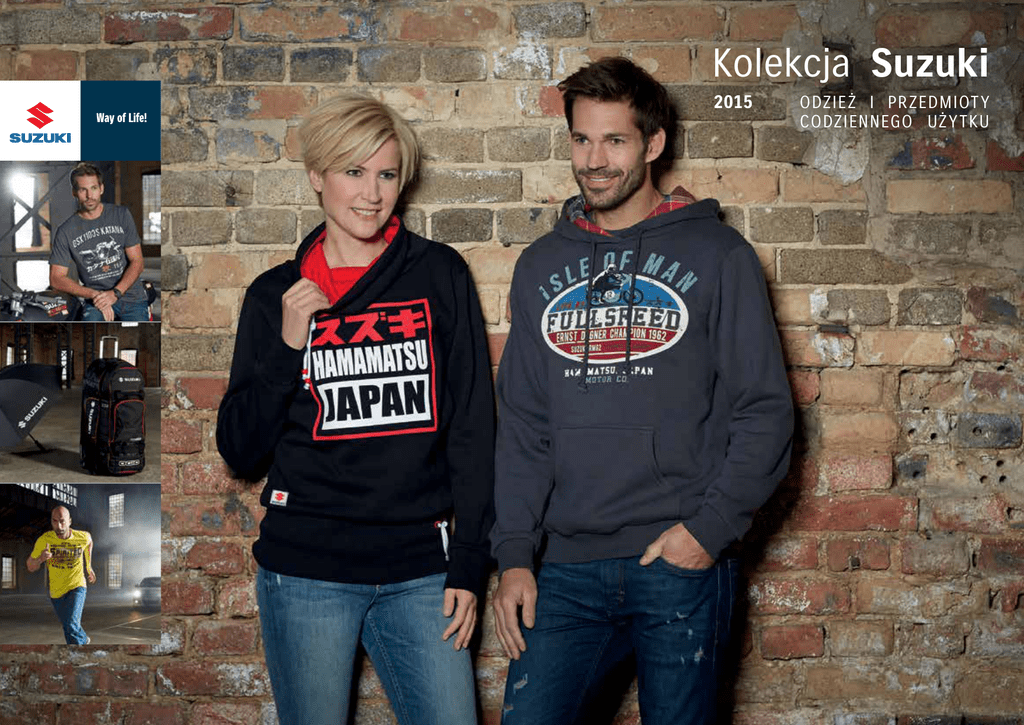 Kolekcja Suzuki 2015 1 ODZIEŻ I PR ZEDMIOT Y CODZIENNEGO UŻY TKU JUŻ JEST. KOLEKCJA SUZUKI 2015. PREZENTUJEMY NOWĄ KOLEKCJĘ SUZUKI PRZEZNACZONĄ DLA ZESPOŁÓW ORAZ INDYWIDUALNYCH FANÓW MARKI. KOLEKCJĘ INSPIROWANĄ ŚWIATŁAMI WIELKIEGO MIASTA, NIEKOŃCZĄCYMI SIĘ SERPENTYNAMI DRÓG, TORAMI WYŚCIGOWYMI I FASCYNUJĄCYMI BEZDROŻAMI ŚWIATA OFF-ROAD. Jak zwykle możesz liczyć na wysokiej jakości materiały, bezkompromisowo solidne wykonanie i prostą, sportową elegancję. Kolekcja Suzuki łączy miłośników Suzuki na całym świecie, zarówno profesjonalistów, jak i amatorów. 04 | MODA I DZIEDZICTWO 24 | V-STROM Najnowsza linia sportowej odzieży Suzuki do codziennego użytku. Priorytetem jak zawsze jest znakomita jakość i perfekcyjne wykonanie. Niezwykłe wzornictwo znajduje odzwierciedlenie w każdym przedmiocie tej kolekcji. Stylowa czerń w połączeniu z niepowtarzalną, legendarną sylwetką V-Stroma jest certyfikatem autentyczności. 14 | KOLEKCJA KEVINA SCHWANTZA 26 | PRZEDMIOTY CODZIENNEGO UŻYTKU Jest nam niezwykle miło przedstawić kolekcję Kevina Schwantza, zaprojektowaną przy jego osobistym udziale. Dostosowane specjalnie do Twojego stylu życia – entuzjaści Suzuki znajdą tu przedmioty przydatne na co dzień, jak również przeznaczone na specjalne okazje. Idealne na prezent, albo po prostu by sprawić sobie przyjemność. 16 | DZIECI Pogodna i wesoła moda dziecięca. Wywoła uśmiech również na twarzach dorosłych. 20 | WINTER Dłuży ci się czas oczekiwania na wiosnę? Odzież kolekcji zimowej jest nie tylko ciepła, ale także świetnie się prezentuje. 32 | JAZDA Podróżuj bezpiecznie. Bez względu na pogodę. 34 | ROZMIARY Które pasują. Nasza kolekcja odzieży została stworzona dla każdego. Sprawdź w tabeli, jaki rozmiar jest najlepszy dla Ciebie. 22 | VITARA Codzienna, sportowa odzież i akcesoria dla miłośników Vitary. 2 3 MODA I DZIEDZICTWO NAJNOWSZA LINIA SPORTOWEJ ODZIEŻY SUZUKI DO CODZIENNEGO UŻYTKU. PRIORYTETEM JAK ZAWSZE JEST ZNAKOMITA JAKOŚĆ I PERFEKCYJNE WYKONANIE. JEST NIE TYLKO WYGODNA, ALE TEŻ ŚWIETNIE SIĘ PREZENTUJE. JEŚLI POSZUKUJESZ CZEGOŚ W STYLU SUZUKI, Z ORIENTALNYM, JAPOŃSKIM AKCENTEM – Z PEWNOŚCIĄ ZNAJDZIESZ TO TUTAJ. Kolekcja na rok 2015 zawiera w swoich genach dziedzictwo słynnych motocykli oraz legendarnych zwycięstw w wyścigach motocyklowych. Nie wyłączając sukcesów licznych fanów z całego świata, którzy kochają Suzuki. Trochę tradycji, szczypta nowoczesności i moc benzyny płynącej w żyłach. 04 MODA I DZIEDZICTWO 5 6 BLUZA ISLE OF MAN Z KAPTUREM KOSZULKA ISLE OF MAN KOSZULKA GSX-R RETRO KOSZULKA GSX1100S KATANA Szara bluza Isle of Man z kapturem, z podszewką w kratę typu tartan (tylko kaptur), dla upamiętnienia zwycięstwa Ernsta Degnera w wyścigu TT na wyspie Man w 1962 roku oraz zdobycia mistrzostwa świata w klasie 50 cc w barwach Suzuki, 80% bawełna, 20% poliester. S/M/L/XL/XXL 990F0-HHM01-rozmiar Koszulka Isle of Man w kolorze brązowego melanżu, wzór retro, doskonale pasuje do bluzy Isle of Man z kapturem, 65% bawełna, 35% poliester. S/M/L/XL/XXL 990F0-HTS11-rozmiar Biała koszulka GSX-R retro, z aplikacją „wyścigową” w trzech odcieniach niebieskiego, ponadczasowy rarytas dla fana GSX-R-a, 100% bawełna. S/M/L/XL/XXL 990F0-HTS12-rozmiar Koszulka retro w kolorze szarego melanżu, stylowy ubiór nie tylko dla posiadaczy i fanów jednego z najbardziej niezwykłych motocykli-legend jakie kiedykolwiek powstały, 100% bawełna. S/M/L/XL/XXL 990F0-HTS13-rozmiar KOSZULA SPIRITED Z DŁUGIM RĘKAWEM KOSZULKA HAMAMATSU KOSZULKA WORLD CHAMPION KOSZULKA Z MOTYWEM DEKORACYJNYM ZBIORNIKA PALIWA TM 250 Ciemnoniebieska koszula Spirited z długim rękawem, z wyściółką na łokciach i czerwonym, kontrastowym szwem, nadrukami oraz naszywką japońskiej formuły 1, 100% bawełna. S/M/L/XL/XXL 990F0-FTS16-rozmiar Czarna koszulka Hamamatsu, z czerwonym i białym nadrukiem, może stać się Twoim codziennym towarzyszem, 100% bawełna. S/M/L/XL/XXL 990F0-FTS15-rozmiar Wzór retro upamiętniający nagrody Producenta Roku zdobywane przez Suzuki w latach 70-tych, 100% bawełna. S/M/L/XL/XXL 990F0-HTS02-rozmiar Biała, z zielonym wzorem inspirowanym motywem umieszczonym na zbiorniku paliwa mistrzowskiego modelu motocykla crossowego TM250 z 1974 roku, 100% bawełna. S/M/L/XL/XXL 990F0-HTS03-rozmiar 7 8 9 10 KOSZULKA ENGINEERED4LIFE CZERWONA KOSZULKA ENGINEERED4LIFE SZARY MELANŻ KOSZULKA ENGINEERED4LIFE SZARA CZAPKA ENGINEERED4LIFE Czerwona wersja jednej z trzech koszulek Engineered4Life – z wszywanymi detalami i kolorowym nadrukiem, 100% bawełna. S/M/L/XL/XXL 990F0-FTS12-rozmiar Wersja w kolorze szarego melanżu jednej z trzech koszulek Engineered4Life – z wszywanymi detalami i kolorowym nadrukiem, 65% bawełna, 35% poliester. S/M/L/XL/XXL 990F0-FTS14-rozmiar Ciemnoszara wersja jednej z trzech koszulek Engineered4Life – z wszywanymi detalami i kolorowym nadrukiem, 100% bawełna. S/M/L/XL/XXL 990F0-FTS13-rozmiar Szara czapka z daszkiem, z haftowanym napisem Engineered4Life, 100% bawełna. ROZMIAR UNIWERSALNY 990F0-FCP06-000 KOSZULKA SPIRITED ŻÓŁTA KOSZULKA SPIRITED NIEBIESKA KOSZULKA SPIRITED CZARNA KOSZULKA MĘSKA MOTOR CO Żółto-niebieska wersja jednej z trzech koszulek Spirited, z kolorowym nadrukiem, 100% bawełna. S/M/L/XL/XXL 990F0-FTS09-rozmiar Niebiesko-żółta wersja jednej z trzech koszulek Spirited, z kolorowym nadrukiem, 100% bawełna. S/M/L/XL/XXL 990F0-FTS10-rozmiar Czarno-zielona wersja jednej z trzech koszulek Spirited, z kolorowym nadrukiem, 100% bawełna. S/M/L/XL/XXL 990F0-FTS11-rozmiar Czerwona koszulka z rękawami typu raglan, z żółtym i białym nadrukiem, detale wykończone żółtym szwem, 100% bawełna. S/M/L/XL/XXL 990F0-FTS03-rozmiar 11 CZAPKA BEJSBOLÓWKA MOTOR CO KOSZULKA DAMSKA ENGINEERED4LIFE CZARNA KOSZULKA DAMSKA ENGINEERED4LIFE NIEBIESKA Czarno-różowa wersja damskiej koszulki Engineered4Life, 100% bawełna. XS/S/M/L/XL 990F0-FTL05-roz