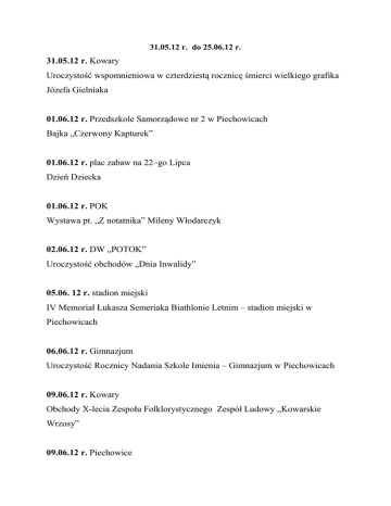 31.05.12 r. do 25.06.12 r. 31.05.12 r. Kowary Uroczystość wspomnieniowa w czterdziestą rocznicę śmierci wielkiego grafika Józefa Gielniaka 01.06.12 r. Przedszkole Samorządowe nr 2 w Piechowicach Bajka „Czerwony Kapturek” 01.06.12 r. plac zabaw na 22–go Lipca Dzień Dziecka 01.06.12 r. POK Wystawa pt. „Z notatnika” Mileny Włodarczyk 02.06.12 r. DW „POTOK” Uroczystość obchodów „Dnia Inwalidy” 05.06. 12 r. stadion miejski IV Memoriał Łukasza Semeriaka Biathlonie Letnim – stadion miejski w Piechowicach 06.06.12 r. Gimnazjum Uroczystość Rocznicy Nadania Szkole Imienia – Gimnazjum w Piechowicach 09.06.12 r. Kowary Obchody X-lecia Zespołu Folklorystycznego Zespół Ludowy „Kowarskie Wrzosy” 09.06.12 r. Piechowice V edycja Bike Maraton 2012 11.06.12 r. Hotel Mercury w J.Górze XXXI Konferencja Krajowa SGP ERN w Hotelu Mercurym w Jeleniej Górze 12.06.12 r. Caritas w Piechowicach „Ognisko Integracyjne” – Akademia PoŜytecznie Spędzonego Czasu – na terenie Caritasu w Piechowicach 12.06.12 r. Mysłakowice Podsumowanie współzawodnictwa sportowego powiatu jeleniogórskiego za rok szkolny 2011/2012 14-15.06.12 r. Karpacz Konferencja „Energetyczno - Samorządowa” w hotelu Dziki Potok w Karpaczu ul. Myśliwska 22 15.06.12 r. Przedszkole Samorządowe nr 1 w Piechowicach „Kubusiowe Zabawy” Dzień Rodziny - piątek 16.06.12 r. Przedszkole Samorządowe nr 2 ENDYRO - JUNIOR – Rowerowy Rajd z przeszkodami - Przedszkole Samorządowe nr 2 18.06.12 r. sala konferencyjna w Urzędzie Miasta Nadanie tytułu Honorowego Obywatela Miasta 18.06.12 r. Muzeum Karkonoskie w Jeleniej Górze Otwarcie wystawy „Śląskie malarstwo pejzaŜowe 2 poł. XIX i 1 poł. XX w.” 19.06.12 r. Szkoła Podstawowa nr 1 Zachowaj Trzeźwy Umysł Klas I-III 22.06.12 r. Przedszkole Samorządowe nr 1 w Piechowicach Uroczystość zakończenia Starszaków 22.06.12 r. Pałac w Bukowcu 22 Zarząd Związku Gmin Karkonoskich Referat Gospodarki Nieruchomościami i Ochrony Środowiska: I. ZłoŜono: - 2 wnioski do Starostwa Powiatowego o wydanie zezwolenia na wycięcie drzew z terenu stanowiącego własność Gminy Miejskiej Piechowice. II. Podpisano: 1. Umowy notarialne: - sprzedaŜy pomieszczeń po lokalu nr 3 o pow. 24,96m2 w budynku przy ul. ŚnieŜnej nr 6 na poprawę warunków zagospodarowania lokalu nr 4 (cena sprzedaŜy 23.800,00zł), - sprzedaŜy działki nr 164/1 o pow. 135m2 połoŜonej przy ul. Nadrzecznej (cena sprzedaŜy brutto 6.642,00zł), - umowa zamiany nieruchomości gruntowych o pow. po 34m2 przy ul. Ciasnej nr 4 (umowa nieodpłatna - równa wartość zamienianych nieruchomości). 2. 11 umów dzierŜaw. III. Sporządzono: 1. 1 wykaz nieruchomości przeznaczonych do sprzedaŜy, 2. 1 wykaz nieruchomości przeznaczonych do dzierŜawy, IV. Przygotowano: 1. 2 Zarządzenie w sprawie przeznaczenia do dzierŜawy nieruchomości stanowiących własność Gminy Miejskiej Piechowice. 2. 2 Zarządzenia w sprawie przeznaczenia do sprzedaŜy nieruchomości stanowiących własność Gminy Miejskiej Piechowice. 3. 1 Zarządzenia w sprawie nie wykonania przysługującego Gminie Miejskiej Piechowice prawa pierwokupu nieruchomości połoŜonej w Piechowicach przy ul Turystycznej. V. Wydano. 1. 4 wypis i wyrys z planu zagospodarowania przestrzennego, 2. 8 zaświadczeń o przeznaczeniu nieruchomości w planie zagospodarowania przestrzennego, 3. 2 decyzje zatwierdzające podział nieruchomości, 4. 2 postanowienie w sprawie zgodności wstępnego projektu podziału nieruchomości z ustaleniami miejscowego planu zagospodarowania przestrzennego, 5. 1 zawiadomienia o nadaniu numeru porządkowego budynku, 6. 1 decyzji w sprawie wydania zezwolenia na wycinkę drzew. Referat Gospodarki Przestrzennej i Infrastruktury Komunalnej: 1.Kontynuowanie procedury związanej z projektem miejscowego planu zagospodarowania przestrzennego dla Piastowa – dla obszaru połoŜonego przy drodze krajowej nr 3 w pobliŜu stacji paliw ( uzgodnienia z Generalną Dyrekcją Dróg Krajowych i Autostrad) oraz przygotowanie projektu zmiany planu zagospodarowania przestrzennego dla obszarów przewidzianych w projekcie II etapu Karkonoskiego Systemu Wodociągów i Kanalizacji, do uchwalenia. 2.Przygotowanie i podpisanie umowy na wykonanie opracowań planistycznych w 2012 roku. 3.Nadzór nad odbudową dwóch mostów oraz zabudowy regulacyjnej na terenie jednostki strukturalnej Piastów, realizowaną w ramach usuwania skutków klęsk Ŝywiołowych ( promesa z dnia 14 marca 2012) oraz przygotowanie dokumentacji i złoŜenie wniosku do Ministra Spraw Wewnętrznych i Administracji, poprzedzającego zawarcie umowy. 4. Wybór i przygotowanie oraz podpisanie umowy z wykonawca inwentaryzacji budowlanej budynku stanowiącego siedzibę Urzędu Miasta ora budynku Miejskiego Ośrodka pomocy Społecznej. 5.BieŜąca współpraca z Zakładem Usług Komunalnych celem wykonania niezbędnych prac na terenie Gminy, w tym zmiana oznakowania ulic, naprawa cząstkowa nawierzchni dróg, udroŜnienia przepustów i studzienek kanalizacji deszczowej, remont ulicy Turystycznej. 6.Przygotowanie i złoŜenie zaŜalenia do Ministra kultury i Dziedzictwa Narodowego na postanowienie Wojewódzkiego Konserwatora Zabytków w sprawie negatywnej opinii odnośnie projektu miejscowego planu dla obszaru przy ulicy Siewnej. 7.Przygotowanie prezentacji dotyczącej przedsięwzięć budowlanych wykonanych przez Gminę w 2011 roku.. 8.Projekt „Renowacja wielorodzinnych budynków mieszkalnych Gminy Miejskiej Piechowice” w ramach Regionalnego Programu Operacyjnego. Przeprowadzenie zamówienia publicznego i wybór wykonawcy. 9. Programu Współpracy Transgranicznej Polska – Saksonia. Tytuł projektu: "Drogi do szkła i granitu” – szlak przeŜyć między Karkonoszami a Pogórzem ŁuŜyckim (Piechowice - Demitz-Thumitz) Przygotowanie dokumentacji projektowej - wykonawczej . Realizacja zamówień publicznych na usługi w ramach projektu. 10.„Chcemy być lepsi”