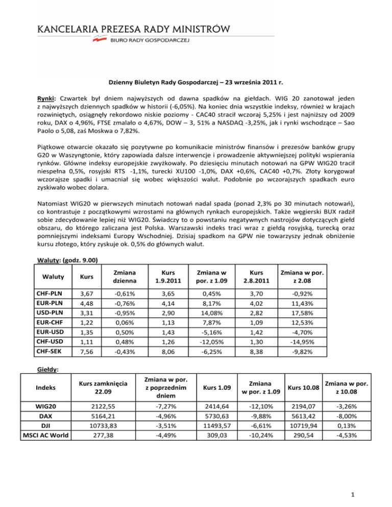 Dzienny Biuletyn Rady Gospodarczej – 23 września 2011 r. Rynki: Czwartek był dniem najwyższych od dawna spadków na giełdach. WIG 20 zanotował jeden z najwyższych dziennych spadków w historii (-6,05%). Na koniec dnia wszystkie indeksy, również w krajach rozwiniętych, osiągnęły rekordowo niskie poziomy - CAC40 stracił wczoraj 5,25% i jest najniższy od 2009 roku, DAX o 4,96%, FTSE zmalało o 4,67%, DOW – 3, 51% a NASDAQ -3,25%, jak i rynki wschodzące – Sao Paolo o 5,08, zaś Moskwa o 7,82%. Piątkowe otwarcie okazało się pozytywne po komunikacie ministrów finansów i prezesów banków grupy G20 w Waszyngtonie, który zapowiada dalsze interwencje i prowadzenie aktywniejszej polityki wspierania rynków. Główne indeksy europejskie zwyżkowały. Po dziesięciu minutach notowań na GPW WIG20 tracił niespełna 0,5%, rosyjski RTS -1,1%, turecki XU100 -1,0%, DAX +0,6%, CAC40 +0,7%. Złoty korygował wczorajsze spadki i umacniał się wobec większości walut. Podobnie po wczorajszych spadkach euro zyskiwało wobec dolara. Natomiast WIG20 w pierwszych minutach notowań nadal spada (ponad 2,3% po 30 minutach notowań), co kontrastuje z początkowymi wzrostami na głównych rynkach europejskich. Także węgierski BUX radził sobie zdecydowanie lepiej niż WIG20. Świadczy to o powstaniu negatywnych nastrojów dotyczących giełd obszaru, do którego zaliczana jest Polska. Warszawski indeks traci wraz z giełdą rosyjską, turecką oraz pomniejszymi indeksami Europy Wschodniej. Dzisiaj spadkom na GPW nie towarzyszy jednak obniżenie kursu złotego, który zyskuje ok. 0,5% do głównych walut. Waluty: (godz. 9.00) Waluty Kurs Zmiana dzienna Kurs 1.9.2011 Zmiana w por. z 1.09 Kurs 2.8.2011 Zmiana w por. z 2.08 CHF-PLN EUR-PLN USD-PLN EUR-CHF EUR-USD CHF-USD CHF-SEK 3,67 4,48 3,31 1,22 1,35 1,11 7,56 -0,61% -0,76% -0,95% 0,06% 0,50% 0,48% -0,43% 3,65 4,14 2,90 1,13 1,43 1,26 8,06 0,45% 8,17% 14,08% 7,87% -5,16% -12,05% -6,25% 3,70 4,02 2,82 1,09 1,42 1,30 8,38 -0,92% 11,43% 17,58% 12,53% -4,70% -14,95% -9,82% Giełdy: Indeks Kurs zamknięcia 22.09 Zmiana w por. z poprzednim dniem Kurs 1.09 Zmiana w por. z 1.09 Kurs 10.08 Zmiana w por. z 10.08 WIG20 DAX DJI MSCI AC World 2122,55 5164,21 10733,83 277,38 -7,27% -4,96% -3,51% -4,49% 2414,64 5730,63 11493,57 309,03 -12,10% -9,88% -6,61% -10,24% 2194,07 5613,42 10719,94 290,54 -3,26% -8,00% 0,13% -4,53% 1 UE: European Banking Authority zdementował informacje podawane przez Financial Times jakoby szefowie państw i rządów zdecydowali się na szybsze dokapitalizowanie 16 banków europejskich. Decyzja dokapitalizowania oraz jej tempo są znane od lipca, gdy opublikowano wyniki stress testów i się nie zmieni oznajmiła EBA. Nie wiadomo również, których banków operacja miałaby dotyczyć. Chodzi przede wszystkim o dziewięć banków, które testu nie przeszły oraz o głównie średnie banki, które ledwo go zaliczyły. Dane: Włoski rząd obniżył prognozy wzrostu PKB w roku 2011. Gospodarka rozwijać ma się w tempie 0,7% w 2011 roku i 0,6% w 2012. MFW uznaje je i tak za zbyt optymistyczne przewidując wzrost PKB we Włoszech o 0,6% w 2011 roku i jedynie 0,3% w kolejnym. Komisja Europejska podała wstępne dane dotyczące indeksu zaufania konsumentów za miesiąc wrzesień. KE przewiduje, iż indeks ten obniży się znacznie z -16,8 do - 19 pkt dla całej Unii oraz z -16,5 do -18,5 pkt w strefie euro. Komentarz Mateusza Morawieckiego (BZ WBK): Rynki mocno zareagowały na informacje z USA i Europy, które wzmogły obawy przed recesją. Inwestorzy nie ufają w moc nowego programu ratunkowego amerykańskiej Rezerwy Federalnej. Niepokoi ich również spadek indeksów aktywności przemysłowej w Niemczech i całej strefie euro, obniżenie ratingów ośmiu włoskim bankom oraz słabe dane o rynku pracy w USA. Do tego dochodzi wciąż napięta atmosfera wokół kryzysu zadłużeniowego Grecji i obawy o jego wpływ na całą strefę euro. Ta sytuacja odbija się na złotym, którego kurs w stosunku do euro przebił granicę poziomu 4,50. Złoty w krótkiej perspektywie może się jeszcze osłabiać, jest jednak szansa, że pod koniec miesiąca jego kurs wobec euro spadnie do ok. 4,44. Współpraca: Departament Analiz Strategicznych KPRM i Departament Polityki Ekonomicznej MSZ 2