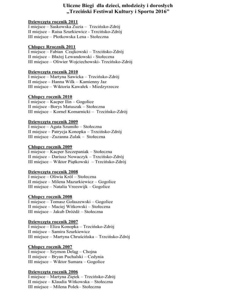 Uliczne Biegi dla dzieci, młodzieży i dorosłych „Trzciński Festiwal Kultury i Sportu 2016” Dziewczęta rocznik 2011 I miejsce – Saskowska Zuzia – Trzcińsko-Zdrój II miejsce – Raisa Szurkiewicz - Trzcińsko-Zdrój III miejsce – Płotkowska Lena - Stołeczna Chłopcy Rrocznik 2011 I miejsce – Fabian Czajkowski – Trzcińsko-Zdrój II miejsce – Błażej Lewandowski - Stołeczna III miejsce – Oliwier Wojciechowski- Trzcińsko-Zdrój Dziewczęta rocznik 2010 I miejsce – Martyna Sawicka – Trzcińsko-Zdrój II miejsce – Hanna Wilk – Kamienny Jaz III miejsce – Wiktoria Kawałek - Miedzyrzecze Chłopcy rocznik 2010 I miejsce – Kacper Ilin – Gogolice II miejsce –Borys Matuszak – Stołeczna III miejsce – Kornel Komarnicki – Trzcińsko-Zdrój Dziewczęta rocznik 2009 I miejsce – Agata Szumiło – Stołeczna II miejsce – Patrycja Konopka – Trzcińsko-Zdrój III miejsce –Zuzanna Zulak – Stołeczna Chłopcy rocznik 2009 I miejsce – Kacper Szczepaniak – Stołeczna II miejsce – Dariusz Nowaczyk – Trzcińsko-Zdrój III miejsce – Wiktor Piątkowski – Trzcińsko-Zdrój Dziewczęta rocznik 2008 I miejsce – Oliwia Król – Stołeczna II miejsce – Milena Mazurkiewicz – Gogolice III miejsce – Natalia Vreeswijk – Gogolice Chłopcy rocznik 2008 I miejsce – Tomasz Gołaszewski – Gogolice II miejsce – Maciej Witkowski – Stołeczna III miejsce – Jakub Dróżdź – Stołeczna Dziewczęta rocznik 2007 I miejsce – Eliza Konopka – Trzcińsko-Zdrój II miejsce – Samira Szurkiewicz III miejsce – Martyna Chruścińska – Trzcińsko-Zdrój Chłopcy rocznik 2007 I miejsce – Szymon Deląg – Chojna II miejsce – Bryan Puchalski – Cedynia III miejsce – Wiktor Sumara – Gogolice Dziewczęta rocznik 2006 I miejsce – Martyna Ziętek – Trzcińsko-Zdrój II miejsce – Klaudia Witkowska – Stołeczna III miejsce – Milena Polek– Stołeczna Chłopcy rocznik 2006 I miejsce – Jan Łukaczewski – Stołeczna II miejsce – Kacper Różycki– Chojna III miejsce – Kacper Kroczyński– Stołeczna Dziewczęta rocznik 2005 I miejsce – Oliwia Urban – Gogolice II miejsce – Wiktoria Papińska – Trzcińsko-Zdrój III miejsce – Joanna Mikuć – Gogolice Chłopcy rocznik 2005 I miejsce – Krzysztof Saskowski – Trzcińsko-Zdrój II miejsce – Dawid Nowak – Stołeczna III miejsce – Oskar Szczepaniak – Stołeczna Dziewczęta rocznik 2004 I miejsce – Weronika Łyczko – Gogolice II miejsce – Nadia Nowak – Stołeczna III miejsce – Natalia Wiącek – Gogolice Chłopcy rocznik 2004 I miejsce – Michał Wałowski – Trzcińsko-Zdrój II miejsce – Artur Dźanojan – Trzcińsko-Zdrój III miejsce – Norbert Jaszczyszyn – Stołeczna Dziewczęta rocznik 2003 I miejsce –Zuzanna Korycka – Trzcińsko-Zdrój II miejsce – Wiktoria Kasica – Trzcińsko-Zdrój III miejsce – Gabriela Wojciechowska – Trzcińsko-Zdrój Chłopcy rocznik 2003 I miejsce – Bartosz Mikuć – Gogolice II miejsce – Mateusz Orzarowski – Gogolice III miejsce –Gabriel Łysiak – Gogolice Dziewczęta rocznik 2002 I miejsce – Klaudia Hybiak – Gimnazjum Góralice II miejsce – Katarzyna Sosnowska – Gimnazjum Góralice III miejsce – Paula Babicz – Gimnazjum Góralice Chłopcy rocznik 2002 I miejsce – Wojciech Pogorzelski – Szczecin II miejsce – Grzegorz Sikora III miejsce – Karol Wierzbiński– Gimnazjum Góralice Dziewczęta rocznik 2001 I miejsce – Weronika Witorzeńć – Gimnazjum Góralice II miejsce – Zuzanna Dróżdż – Gimnazjum Góralice III miejsce – Klaudia Kotus – Gimnazjum Góralice Chłopcy rocznik 2001 I miejsce – Patryk Makarewicz – Gimnazjum Góralice II miejsce – Damian Przewłocki – Gimnazjum Góralice III miejsce – Paweł Olchówka – Gimnazjum Góralice Chłopcy rocznik 2000 I miejsce – Oskar Łyczko – Gimnazjum Góralice II miejsce – Patryk Konopka – Gimnazjum Góralice III miejsce- Adam Wiącek – Gimnazjum Góralice BIEG INTEGRACYJNY I miejsce – Witold Wilczek II miejsce – Stanisław Reguła III miejsce – Danuta Żabińska , Aleksander Waś