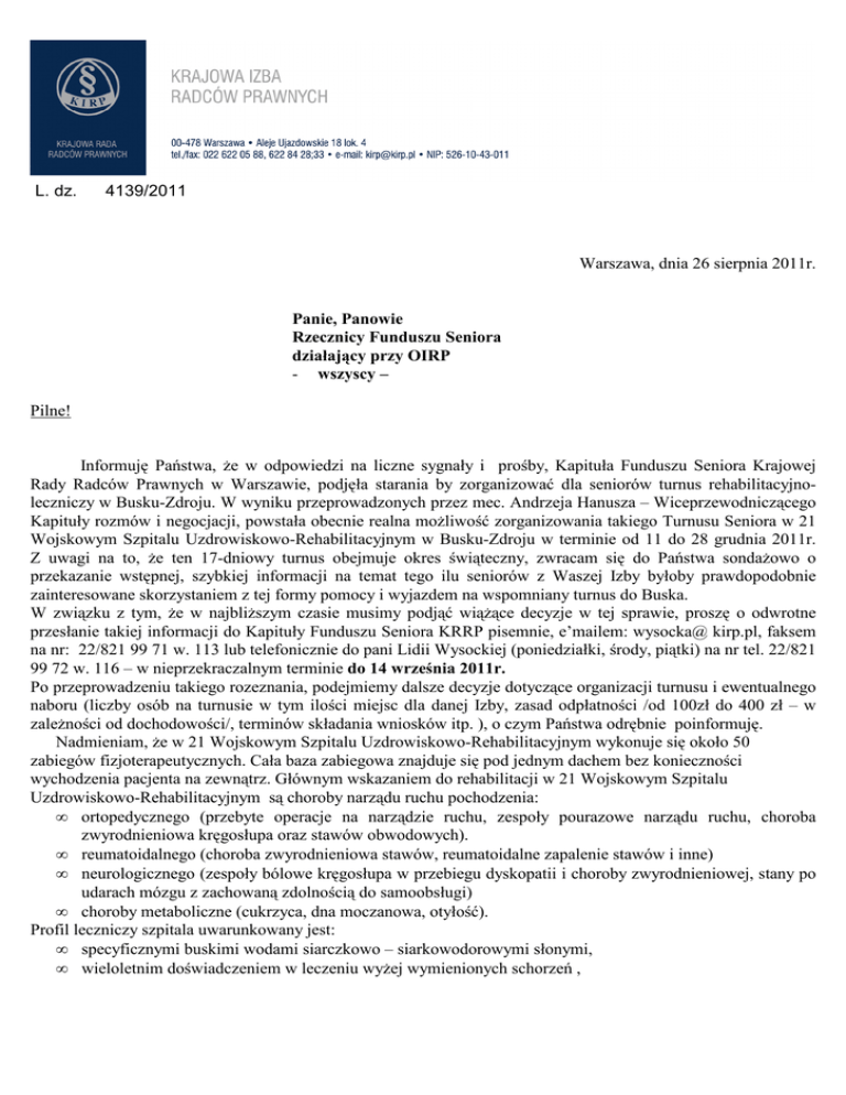 L. dz. 4139/2011 Warszawa, dnia 26 sierpnia 2011r. Panie, Panowie Rzecznicy Funduszu Seniora działający przy OIRP - wszyscy – Pilne! Informuję Państwa, że w odpowiedzi na liczne sygnały i prośby, Kapituła Funduszu Seniora Krajowej Rady Radców Prawnych w Warszawie, podjęła starania by zorganizować dla seniorów turnus rehabilitacyjnoleczniczy w Busku-Zdroju. W wyniku przeprowadzonych przez mec. Andrzeja Hanusza – Wiceprzewodniczącego Kapituły rozmów i negocjacji, powstała obecnie realna możliwość zorganizowania takiego Turnusu Seniora w 21 Wojskowym Szpitalu Uzdrowiskowo-Rehabilitacyjnym w Busku-Zdroju w terminie od 11 do 28 grudnia 2011r. Z uwagi na to, że ten 17-dniowy turnus obejmuje okres świąteczny, zwracam się do Państwa sondażowo o przekazanie wstępnej, szybkiej informacji na temat tego ilu seniorów z Waszej Izby byłoby prawdopodobnie zainteresowane skorzystaniem z tej formy pomocy i wyjazdem na wspomniany turnus do Buska. W związku z tym, że w najbliższym czasie musimy podjąć wiążące decyzje w tej sprawie, proszę o odwrotne przesłanie takiej informacji do Kapituły Funduszu Seniora KRRP pisemnie, e’mailem: wysocka@ kirp.pl, faksem na nr: 22/821 99 71 w. 113 lub telefonicznie do pani Lidii Wysockiej (poniedziałki, środy, piątki) na nr tel. 22/821 99 72 w. 116 – w nieprzekraczalnym terminie do 14 września 2011r. Po przeprowadzeniu takiego rozeznania, podejmiemy dalsze decyzje dotyczące organizacji turnusu i ewentualnego naboru (liczby osób na turnusie w tym ilości miejsc dla danej Izby, zasad odpłatności /od 100zł do 400 zł – w zależności od dochodowości/, terminów składania wniosków itp. ), o czym Państwa odrębnie poinformuję. Nadmieniam, że w 21 Wojskowym Szpitalu Uzdrowiskowo-Rehabilitacyjnym wykonuje się około 50 zabiegów fizjoterapeutycznych. Cała baza zabiegowa znajduje się pod jednym dachem bez konieczności wychodzenia pacjenta na zewnątrz. Głównym wskazaniem do rehabilitacji w 21 Wojskowym Szpitalu Uzdrowiskowo-Rehabilitacyjnym są choroby narządu ruchu pochodzenia: • ortopedycznego (przebyte operacje na narządzie ruchu, zespoły pourazowe narządu ruchu, choroba zwyrodnieniowa kręgosłupa oraz stawów obwodowych). • reumatoidalnego (choroba zwyrodnieniowa stawów, reumatoidalne zapalenie stawów i inne) • neurologicznego (zespoły bólowe kręgosłupa w przebiegu dyskopatii i choroby zwyrodnieniowej, stany po udarach mózgu z zachowaną zdolnością do samoobsługi) • choroby metaboliczne (cukrzyca, dna moczanowa, otyłość). Profil leczniczy szpitala uwarunkowany jest: • specyficznymi buskimi wodami siarczkowo – siarkowodorowymi słonymi, • wieloletnim doświadczeniem w leczeniu wyżej wymienionych schorzeń , • doświadczoną, profesjonalną kadrą medyczną którą tworzą lekarze specjaliści, doktorzy i magistrowie rehabilitacji i fizjoterapii, fizjoterapeuci licencjonowani, technicy fizjoterapii, masażyści, pielęgniarki zabiegowi balneologii, terapeuta zajęciowy, psycholog, • odpowiednio wyposażoną w urządzenia diagnostyczne i treningowe bazą zabiegową do kinezyterapii miejscowej i ogólnej ( 4 sale do gimnastyki indywidualnej, basen rehabilitacyjny, sala do gimnastyki ogólno-usprawniającej) • pełnym wyposażeniem w urządzenia do fizykoterapii ( elektroterapii, magnetoterapii, termoterapii – krioterapii, światłolecznictwa, ultradźwięków) • dobrze rozwiniętą bazą do hydroterapii. Niewątpliwą atrakcją leczniczą są Buskie wody siarczkowo -siarkowodorowe słone, popularnie zwane siarką. Stanowią one wieloskładnikowy układ jonów, cząstek o różnorodnych właściwościach fizycznych i chemicznych. Zasadniczym składnikiem leczniczym buskich wód mineralnych jest siarkowodór i produkty jego dysocjacji czyli siarczki i wodorosiarczki. Średnie stężenie siarki w przeliczeniu na jon siarczkowy ( S2) wynosi około 40 mg/l, jest to jedno z najwyższych stężeń jonów siarczkowych w wodzie mineralnej w Europie. Licząc na szybką odpowiedź, przekazuję serdeczne koleżeńskie pozdrowienia! Z wyrazami szacunku! Przewodniczący Kapituły Funduszu Seniora Marek Skierczyński