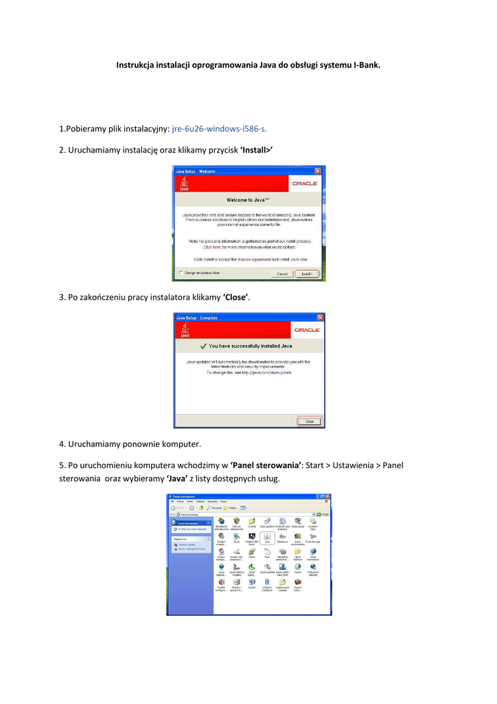 Instrukcja instalacji oprogramowania Java do obsługi systemu I-Bank. 1.Pobieramy plik instalacyjny: jre-6u26-windows-i586-s. 2. Uruchamiamy instalację oraz klikamy przycisk ‘Install>’ 3. Po zakończeniu pracy instalatora klikamy ‘Close’. 4. Uruchamiamy ponownie komputer. 5. Po uruchomieniu komputera wchodzimy w ‘Panel sterowania’: Start > Ustawienia > Panel sterowania oraz wybieramy ‘Java’ z listy dostępnych usług. 6. Widoczne mamy okno ‘Java Control Panel’ . Wybieramy zakładkę ‘Update’ oraz odznaczamy ‘Check for Updates automatically’. 7. Następnie wyskoczy okno gdzie zaznaczymy ‘ Never check’ 8. Zapisujemy ustawienia poprzez przycisk ‘Apply’ , następnie ‘OK’ 9. Uruchamiamy ponownie komputer. System Bankowości Elektronicznej powinien działać bezproblemowo.
