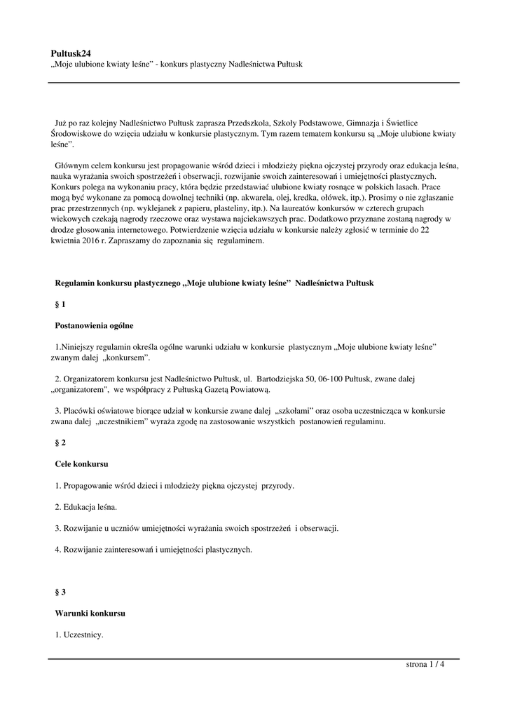 Pultusk24 „Moje ulubione kwiaty leśne” - konkurs plastyczny Nadleśnictwa Pułtusk Już po raz kolejny Nadleśnictwo Pułtusk zaprasza Przedszkola, Szkoły Podstawowe, Gimnazja i Świetlice Środowiskowe do wzięcia udziału w konkursie plastycznym. Tym razem tematem konkursu są „Moje ulubione kwiaty leśne”. Głównym celem konkursu jest propagowanie wśród dzieci i młodzieży piękna ojczystej przyrody oraz edukacja leśna, nauka wyrażania swoich spostrzeżeń i obserwacji, rozwijanie swoich zainteresowań i umiejętności plastycznych. Konkurs polega na wykonaniu pracy, która będzie przedstawiać ulubione kwiaty rosnące w polskich lasach. Prace mogą być wykonane za pomocą dowolnej techniki (np. akwarela, olej, kredka, ołówek, itp.). Prosimy o nie zgłaszanie prac przestrzennych (np. wyklejanek z papieru, plasteliny, itp.). Na laureatów konkursów w czterech grupach wiekowych czekają nagrody rzeczowe oraz wystawa najciekawszych prac. Dodatkowo przyznane zostaną nagrody w drodze głosowania internetowego. Potwierdzenie wzięcia udziału w konkursie należy zgłosić w terminie do 22 kwietnia 2016 r. Zapraszamy do zapoznania się regulaminem. Regulamin konkursu plastycznego „Moje ulubione kwiaty leśne” Nadleśnictwa Pułtusk §1 Postanowienia ogólne 1.Niniejszy regulamin określa ogólne warunki udziału w konkursie plastycznym „Moje ulubione kwiaty leśne” zwanym dalej „konkursem”. 2. Organizatorem konkursu jest Nadleśnictwo Pułtusk, ul. Bartodziejska 50, 06-100 Pułtusk, zwane dalej „organizatorem", we współpracy z Pułtuską Gazetą Powiatową. 3. Placówki oświatowe biorące udział w konkursie zwane dalej „szkołami” oraz osoba uczestnicząca w konkursie zwana dalej „uczestnikiem” wyraża zgodę na zastosowanie wszystkich postanowień regulaminu. §2 Cele konkursu 1. Propagowanie wśród dzieci i młodzieży piękna ojczystej przyrody. 2. Edukacja leśna. 3. Rozwijanie u uczniów umiejętności wyrażania swoich spostrzeżeń i obserwacji. 4. Rozwijanie zainteresowań i umiejętności plastycznych. §3 Warunki konkursu 1. Uczestnicy. strona 1 / 4 Pultusk24 „Moje ulubione kwiaty leśne” - konkurs plastyczny Nadleśnictwa Pułtusk a) Konkurs organizowany jest w 4 kategoriach: przedszkola, klasy 1-3 szkoły podstawowej, klasy 4-6 szkoły podstawowej, gimnazja. b) Do konkursu mogą przystąpić dzieci i młodzież ze szkół, przedszkoli i świetlic środowiskowych położonych w zasięgu terytorialnym Nadleśnictwa Pułtusk. c) Warunkiem uczestnictwa w konkursie jest pisemne lub e-mailowe zgłoszenie skierowane do Nadleśnictwa w terminie do 22 kwietnia 2016 r. 2. Czas trwania konkursu. a) Ogłoszenie konkursu – kwiecień 2016 r. b) Rozstrzygnięcie i przyznanie nagród - czerwiec 2016 r. c) Uroczyste wręczenie nagród - czerwiec 2016 r. 3. Etapy kwalifikacji prac i tryb wyłaniania laureatów. a) I etap konkursu polega na analizie i selekcji prac przeprowadzanej samodzielnie w zgłoszonych placówkach. Każda szkoła nominuje do II etapu 5 prac z każdej kategorii. Zgłoszone placówki dostarczą prace do siedziby Nadleśnictwa w terminie do 25 maja 2016 r. b) II etap konkursu polega na analizie i wyborze najlepszych prac w każdej z kategorii wiekowej przez komisję powołaną przez Nadleśniczego Nadleśnictwa Pułtusk. c) Dodatkowo, z prac zakwalifikowanych do II etapu, publiczność wybierze trzy prace w drodze głosowania internetowego. d) Podsumowanie konkursu połączone z wystawą prac konkursowych oraz wręczeniem nagród odbędzie się w czerwcu 2016 r. w miejscu wyznaczonym przez Nadleśnictwo. 4. Kryteria wyboru prac. a) pomysłowość i oryginalność pracy, b) estetyka wykonania i nakład pracy, c) zgodność pracy z tytułem konkursu, 5.Warunki głosowania internetowego. a) w głosowaniu mogą uczestniczyć wszyscy. b) każda osoba biorąca udział w głosowaniu może oddać tylko jeden głos na jednego z uczestników. c) informacje dotyczące warunków głosowania umieszczona zostanie na stronie internetowej Nadleśnictwa Pułtusk oraz w Pułtuskiej Gazecie Powiatowej w terminie do 25 maja 2016 r. strona 2 / 4 Pultusk24 „Moje ulubione kwiaty leśne” - konkurs plastyczny Nadleśnictwa Pułtusk §4 Informacje dotyczące prac konkursowych 1. Technika wykonania prac- dowolna (np. akwarela, olej, kredka, ołówek, itp.). Nie przysyłać prac przestrzennych. 2. Obowiązują wyłącznie prace indywidualne. 3. Dopuszczalny format pracy dla przedszkoli i klas 1-3 szkoły podstawowej- A4, dla klas 4-6 szkoły podstawowejA3 i gimnazjów – A2. 4. Każda praca powinna zawierać na odwrocie imię i nazwisko autora, klasę , nazwę i adres szkoły oraz tytuł pracy. Do każdej pracy należy dołączyć załącznik podpisany przez rodziców/ prawnych opiekunów ( załącznik nr 1). §5 Nagrody 1. Nagrody zostaną przyznane za zajęcie I, II, III miejsca w każdej z wymienionej kategorii. 2. W każdej kategorii mogą być przyznane po 2 nagrody dodatkowe, jako wyróżnienia w formie dyplomu lub książki. 3. Zostaną przyznane trzy " Nagrody publiczności" w wyniku głosowania internetowego. 4. Zgodnie z art. 21 ust. 1 pkt. 68 Ustawy o podatku dochodowym od osób fizycznych jednorazowa wartość tych nagród nie przekroczy kwoty 760,00 zł na osobę. 1) Nagrodami będą: Kategoria Przedszkola - za zajęcie I miejsca – gra, zestaw plastyczny, długopisy żelowe, puzzle, układanka edukacyjna - za zajęcie II miejsca – gra, gra planszowa, długopisy żelowe, puzzle, układanka edukacyjna, kredki - za zajęcie III miejsca – gra, puzzle, mazaki Kategoria klasa 1-3 szkoły podstawowe - za zajęcie I miejsca – plecak, piłka, portfel, saszetka - za zajęcie II miejsca – plecak, torba na ramię strona 3 / 4 Pultusk24 „Moje ulubione kwiaty leśne” - konkurs plastyczny Nadleśnictwa Pułtusk - za zajęcie III miejsca – plecak Kategoria klasy 4-6 szkoły podstawowej - za zajęcie I miejsca – tablet - za zajęcie 