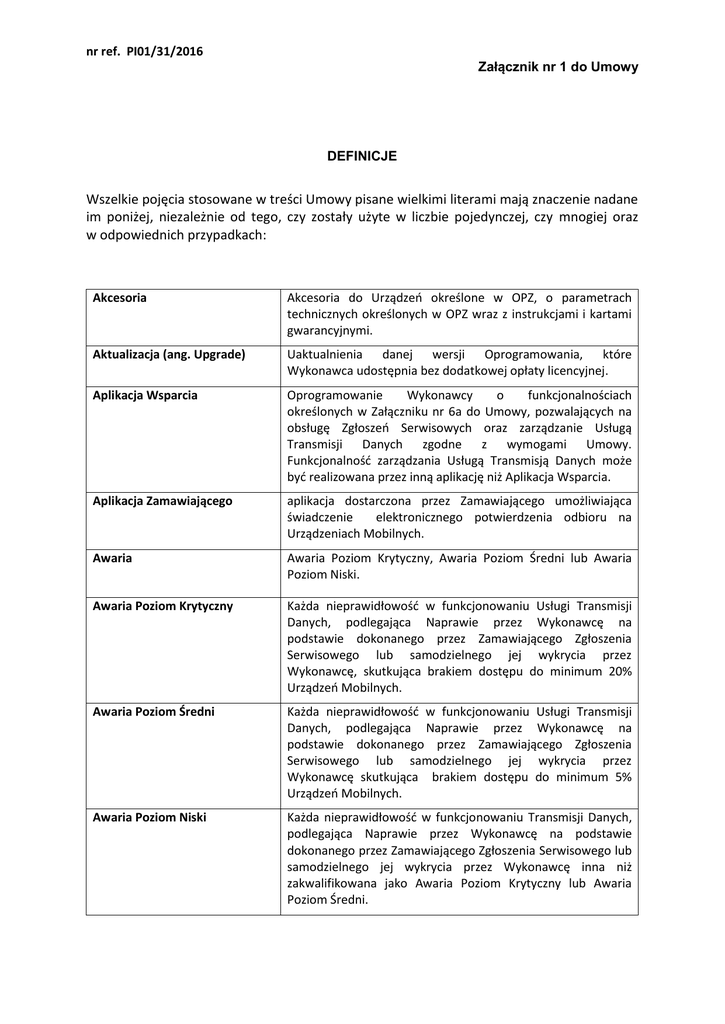 nr ref. PI01/31/2016 Załącznik nr 1 do Umowy DEFINICJE Wszelkie pojęcia stosowane w treści Umowy pisane wielkimi literami mają znaczenie nadane im poniżej, niezależnie od tego, czy zostały użyte w liczbie pojedynczej, czy mnogiej oraz w odpowiednich przypadkach: Akcesoria Akcesoria do Urządzeń określone w OPZ, o parametrach technicznych określonych w OPZ wraz z instrukcjami i kartami gwarancyjnymi. Aktualizacja (ang. Upgrade) Uaktualnienia danej wersji Oprogramowania, które Wykonawca udostępnia bez dodatkowej opłaty licencyjnej. Aplikacja Wsparcia Oprogramowanie Wykonawcy o funkcjonalnościach określonych w Załączniku nr 6a do Umowy, pozwalających na obsługę Zgłoszeń Serwisowych oraz zarządzanie Usługą Transmisji Danych zgodne z wymogami Umowy. Funkcjonalność zarządzania Usługą Transmisją Danych może być realizowana przez inną aplikację niż Aplikacja Wsparcia. Aplikacja Zamawiającego aplikacja dostarczona przez Zamawiającego umożliwiająca świadczenie elektronicznego potwierdzenia odbioru na Urządzeniach Mobilnych. Awaria Awaria Poziom Krytyczny, Awaria Poziom Średni lub Awaria Poziom Niski. Awaria Poziom Krytyczny Każda nieprawidłowość w funkcjonowaniu Usługi Transmisji Danych, podlegająca Naprawie przez Wykonawcę na podstawie dokonanego przez Zamawiającego Zgłoszenia Serwisowego lub samodzielnego jej wykrycia przez Wykonawcę, skutkująca brakiem dostępu do minimum 20% Urządzeń Mobilnych. Awaria Poziom Średni Każda nieprawidłowość w funkcjonowaniu Usługi Transmisji Danych, podlegająca Naprawie przez Wykonawcę na podstawie dokonanego przez Zamawiającego Zgłoszenia Serwisowego lub samodzielnego jej wykrycia przez Wykonawcę skutkująca brakiem dostępu do minimum 5% Urządzeń Mobilnych. Awaria Poziom Niski Każda nieprawidłowość w funkcjonowaniu Transmisji Danych, podlegająca Naprawie przez Wykonawcę na podstawie dokonanego przez Zamawiającego Zgłoszenia Serwisowego lub samodzielnego jej wykrycia przez Wykonawcę inna niż zakwalifikowana jako Awaria Poziom Krytyczny lub Awaria Poziom Średni. Czas Reakcji Czas, jaki upłynął od przekazania Zgłoszenia Serwisowego przez Zamawiającego do czasu potwierdzenia przez Wykonawcę otrzymania zgłoszenia i zmianie jego statusu przez Wykonawcę na „Przyjęte”. Dokumentacja Dokumentacja opracowana przez Wykonawcę w ramach realizacji Umowy, w tym Dokumentacja Powykonawcza. Dokumentacja Powykonawcza Dokument przygotowany przez Wykonawcę, zawierający opis skonfigurowanej i uruchomionej Aplikacji Wsparcia, szczegółowo opisany w zał. nr 6 a do Umowy. Dzień Roboczy Każdy dzień od poniedziałku do piątku z wyłączeniem dni ustawowo wolnych od pracy w Rzeczpospolitej Polskiej. Harmonogram Harmonogram Wdrożenia przygotowany przez Wykonawcę w ramach Projektu Technicznego. Interfejs API (Application Interfejs programistyczny aplikacji – rozumiany jako ściśle Programming Interface) określony zestaw reguł i ich opisów, w jaki programy komunikują się między sobą. API definiuje się na poziomie kodu źródłowego dla takich składników oprogramowania jak np. aplikacje, biblioteki czy system operacyjny. Zadaniem API jest dostarczenie odpowiednich specyfikacji podprogramów, struktur danych, klas obiektów i wymaganych protokołów komunikacyjnych. Karta SIM (Subscriber Identity Karta elektroniczna z wbudowaną pamięcią i mikroprocesorem Module) umożliwiająca dostęp do Usługi Transmisji Danych świadczonych przez Wykonawcę, z którą związane są: numer abonencki (numer MSISDN), osobisty numer identyfikacyjny (PIN) oraz kod odblokowujący (PUK), dostarczana przez Wykonawcę do Lokalizacji Zamawiającego. Koordynatorzy Umowy Osoby wskazane w Umowie, uprawnione do koordynacji i kontroli wykonywania Umowy, a w szczególności generowania Zgłoszeń Serwisowych. Konteneryzacja Możliwość utworzenia na Urządzeniu Mobilnym wydzielonych obszarów: służbowego i prywatnego bezpiecznie odseparowanych od siebie, które zdalnie zarządzane są przez System MDM. Licencja Licencja (lub odpowiednio sublicencja) na korzystanie z Oprogramowania oraz Konteneryzacji, w tym licencja (lub odpowiednio sublicencja) umożliwiająca włączenie dostarczonych przez Wykonawcę Urządzeń do Systemu MDM Zamawiającego. List Przewozowy List przewozowy wystawiany przez doręczyciela oraz podpisywany przez osobę upoważnioną przez Zamawiającego, potwierdzający dostarczenie w ramach realizacji Umowy Urządzeń, Akcesoriów i Kart SIM. Lokalizacje Miejsca dostarczenia Urządzeń, Akcesoriów i Kart SIM oraz miejsca odbioru Urządzeń, Akcesoriów, Kart SIM w ramach Zgłoszenia Serwisowego, które zostaną wskazane przez 2 Zamawiającego podczas prac nad Projektem Technicznym. Naprawa Usunięcie Awarii lub Wady. Numer MSISDN (Mobile międzynarodowy numer wywoławczy wg standardu ISDN Subscriber International powiązany w systemie HLR z numerem Karty SIM. Integrated Services Digital Network Number) NBD Next Business Day – następny Dzień Roboczy Oferta Oferta Wykonawcy złożona w postępowaniu o udzielenie Zamówienia na „Dostawę Urządzeń typu tablet z akcesoriami oraz Transmisją Danych, Urządzeń Signature Padów i licencji na Oprogramowanie dla Poczty Polskiej S.A.” Okres Rozliczeniowy Okres jednego miesiąca kalendarzowego, za który dokonywane są rozliczenia z tytułu realizacji Usługi Transmisji Danych i Usług Pogwarancyjnych. Oprogramowanie Aplikacja Wsparcia oraz programy komputerowe dostarczane przez Wykonawcę, niezbędne do prawidłowego i niezakłóconego funkcjonowania Urządzeń, w tym gwarantujące współpracę i kompatybilność Urządzeń z Systemem MDM i elementami infrastruktury informatycznej Zamawiającego. Oprogramowanie obejmuje elementy oprogramowanie FAMOC zlokalizowane na Urządzeniach. Oprogramowanie Części Klienckiej Oprogramowanie instalowane na Urządzeniach Mobilnych lub Urządzeniach Własnych. OPZ Opis przedmiotu zamówienia w p