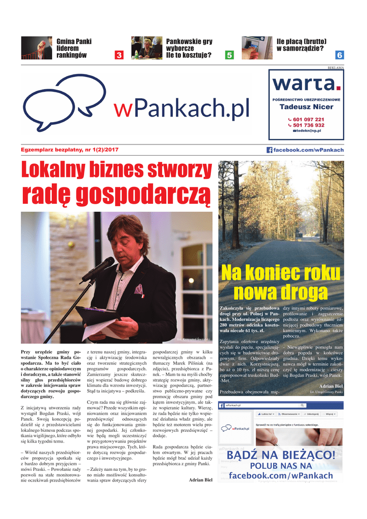 Gmina Panki liderem rankingów 3 Pankowskie gry wyborcze Ile to kosztuje? 5 Ile płacą (brutto) w samorządzie? 6 REKLAMA Egzemplarz bezpłatny, nr 1(2)/2017 facebook.com/wPankach Lokalny biznes stworzy radę gospodarczą Na koniec roku nowa droga Zakończyła się przebudowa drogi przy ul. Polnej w Pankach. Modernizacja liczącego 280 metrów odcinka kosztowała niecałe 61 tys. zł. fot. Krzysztof Świtalski Przy urzędzie gminy powstanie Społeczna Rada Gospodarcza. Ma to być ciało o charakterze opiniodawczym i doradczym, a także stanowić silny głos przedsiębiorców w zakresie inicjowania spraw dotyczących rozwoju gospodarczego gminy. Z inicjatywą utworzenia rady wystąpił Bogdan Praski, wójt Panek. Swoją koncepcją podzielił się z przedstawicielami lokalnego biznesu podczas spotkania wigilijnego, które odbyło się kilka tygodni temu. – Wśród naszych przedsiębiorców propozycja spotkała się z bardzo dobrym przyjęciem – mówi Praski. – Powołanie rady pozwoli na stałe monitorowanie oczekiwań przedsiębiorców z terenu naszej gminy, integrację i aktywizację środowiska oraz tworzenie strategicznych programów gospodarczych. Zamierzamy jeszcze skuteczniej wspierać budowę dobrego klimatu dla wzrostu inwestycji. Stąd ta inicjatywa – podkreśla. Czym rada ma się głównie zajmować? Przede wszystkim opiniowaniem oraz inicjowaniem przedsięwzięć odnoszących się do funkcjonowania gminnej gospodarki. Jej członkowie będą mogli uczestniczyć w przygotowywaniu projektów prawa miejscowego. Tych, które dotyczą rozwoju gospodarczego i inwestycyjnego. – Zależy nam na tym, by to grono miało możliwość konsultowania spraw dotyczących sfery gospodarczej gminy w kilku newralgicznych obszarach – tłumaczy Marek Pilśniak (na zdjęciu), przedsiębiorca z Panek. – Mam tu na myśli choćby strategię rozwoju gminy, aktywizację gospodarczą, partnerstwo publiczno-prywatne czy promocję obszaru gminy pod kątem inwestycyjnym, ale także wspieranie kultury. Wierzę, że rada będzie nie tylko wspierać działania władz gminy, ale będzie też motorem wielu prorozwojowych przedsięwzięć – dodaje. Rada gospodarcza będzie ciałem otwartym. W jej pracach będzie mógł brać udział każdy przedsiębiorca z gminy Panki. Adrian Biel dzy innymi roboty pomiarowe, profilowanie i zagęszczenie podłoża oraz wyrównanie istniejącej podbudowy tłuczniem kamiennym. Wykonano także pobocza. Zapytania ofertowe urzędnicy wysłali do pięciu, specjalizujących się w budownictwie drogowym, firm. Odpowiedziały dwie z nich. Korzystniejszą, bo aż o 10 tys. zł niższą cenę zaproponował truskolaski Bud-Met. - Niewątpliwie pomogła nam dobra pogoda w końcówce grudnia. Dzięki temu wykonawca mógł w terminie zakończyć tę modernizację - cieszy się Bogdan Praski, wójt Panek. Przebudowa obejmowała mię- fot. Urząd Gminy Panki Adrian Biel BĄDŹ NA BIEŻĄCO! POLUB NAS NA facebook.com/wPankach 2 Nie bądź obojętny, pomóż dziecku wyzdrowieć 11 lutego w Pankach odbędzie się koncert charytatywny. Cały dochód z imprezy zostanie przeznaczony na dalsze leczenie padaczki lekoopornej u 9-letniego Kacpra z Konieczek. Z epilepsją Kacper Macherzyński zmaga się od piątego miesiąca życia. Od samego początku jest intensywnie rehabilitowany. Dzięki determinacji jaką przejawia i ogromu pracy jaką wykonał, dziś uczęszcza do pierwszej klasy szkoły podstawowej. Jednak nasilająca się choroba, jak i ograniczenia związane z leczeniem w kraju, skutecznie przeszkadzają mu w dalszym rozwoju. W ostatnim czasie pojawiła się szansa na skuteczne leczenie chłopca za granicą. By to było możliwe, konieczne jest zgromadzenie niebagatelnej kwoty. Koszt całej terapii lekarze oszacowali na kwotę pomiędzy 300-500 tys. złotych. To suma, która przekracza możliwości finansowe rodziny 9-latka. Na szczęście pomocną dłoń wyciągnęła lokalna społeczność i 11 lutego w hali sportowej w Pankach odbędzie się dedykowany Kacprowi koncert charytatywny. Impreza, na której licytowane będą między innymi piłki i koszulki z autografem Jakuba Błaszczykowskiego, to już trzecia edycja z cyklu. Wydarzenie, które jest wspólną inicjatywą Bogdana Praskiego, wójta Panek oraz Jarosława Wójcika - przedsiębiorcy, społecznika i jednocześnie muzyka - na stałe wpisało się już w kalendarz cyklicznych imprez w gminie. - Co roku gramy dla innej, potrzebującej pomocy osoby mówi wójt Praski. - W lutym będziemy zbierać pieniądze dla Kacpra Macherzyńskiego, by pomóc jego rodzinie zgromadzić jak najwięcej środków na leczenie. Zachęcam wszystkich mieszkańców do solidarności z naszym młodszym sąsiadem i włączenie się gremialnie w tą akcję. Jeśli tylko jest szansa na skuteczną rehabilitację dla Kacpra, to wspólnie musimy chłopcu pomóc - zachęca. fot. Shutterstock Początek imprezy zaplanowano na godz. 16.00. Jak przekonują organizatorzy, program będzie na tyle bogaty, że z pewnością każdy znajdzie coś interesującego dla siebie. Zarówno koncerty jak i wydarzenia urozmaicające występy artystów, potrwają do późnych godzin wieczornych. dzie jednak mogło wystąpić. Z prostego powodu, chodzi o ograniczenia czasowe. Planujemy też między innymi występ orkiestry i pokazy taekwondo. Myślę, że liczbę samych wykonawców ograniczymy do czterech kapel. Wszystko okaże się w najbliższych dniach podkreśla. - Jest olbrzymie zainteresowanie tą imprezą - cieszy się Jarosław Wójcik. - Na chwilę obecną zgłosiło się do nas już sześć zespołów. Aż tyle nie bę- Jeśli ktoś już dziś chciałby pomóc Kacprowi, także ma taką możliwość. W każdej chwili można kierować wpłaty na konto Fundacji Dzieciom „Zdążyć z pomocą” o numerze: 15 1060 0076 0000 3310 0018 2615, opatrzonej tytułem przelewu 30448 Macherzyński Kacper. Warto także przy rozliczaniu swojego PIT-u przekazać dla chłopca 1 proc. po