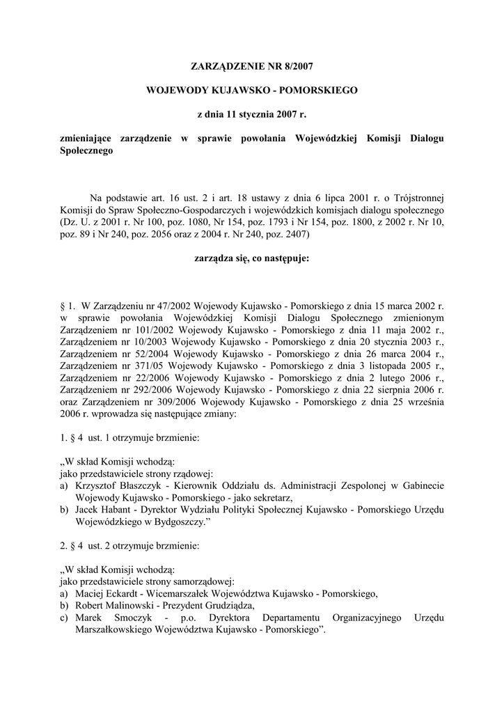 ZARZĄDZENIE NR 8/2007 WOJEWODY KUJAWSKO - POMORSKIEGO z dnia 11 stycznia 2007 r. zmieniające zarządzenie w sprawie powołania Wojewódzkiej Komisji Dialogu Społecznego Na podstawie art. 16 ust. 2 i art. 18 ustawy z dnia 6 lipca 2001 r. o Trójstronnej Komisji do Spraw Społeczno-Gospodarczych i wojewódzkich komisjach dialogu społecznego (Dz. U. z 2001 r. Nr 100, poz. 1080, Nr 154, poz. 1793 i Nr 154, poz. 1800, z 2002 r. Nr 10, poz. 89 i Nr 240, poz. 2056 oraz z 2004 r. Nr 240, poz. 2407) zarządza się, co następuje: § 1. W Zarządzeniu nr 47/2002 Wojewody Kujawsko - Pomorskiego z dnia 15 marca 2002 r. w sprawie powołania Wojewódzkiej Komisji Dialogu Społecznego zmienionym Zarządzeniem nr 101/2002 Wojewody Kujawsko - Pomorskiego z dnia 11 maja 2002 r., Zarządzeniem nr 10/2003 Wojewody Kujawsko - Pomorskiego z dnia 20 stycznia 2003 r., Zarządzeniem nr 52/2004 Wojewody Kujawsko - Pomorskiego z dnia 26 marca 2004 r., Zarządzeniem nr 371/05 Wojewody Kujawsko - Pomorskiego z dnia 3 listopada 2005 r., Zarządzeniem nr 22/2006 Wojewody Kujawsko - Pomorskiego z dnia 2 lutego 2006 r., Zarządzeniem nr 292/2006 Wojewody Kujawsko - Pomorskiego z dnia 22 sierpnia 2006 r. oraz Zarządzeniem nr 309/2006 Wojewody Kujawsko - Pomorskiego z dnia 25 września 2006 r. wprowadza się następujące zmiany: 1. § 4 ust. 1 otrzymuje brzmienie: „W skład Komisji wchodzą: jako przedstawiciele strony rządowej: a) Krzysztof Błaszczyk - Kierownik Oddziału ds. Administracji Zespolonej w Gabinecie Wojewody Kujawsko - Pomorskiego - jako sekretarz, b) Jacek Habant - Dyrektor Wydziału Polityki Społecznej Kujawsko - Pomorskiego Urzędu Wojewódzkiego w Bydgoszczy.” 2. § 4 ust. 2 otrzymuje brzmienie: „W skład Komisji wchodzą: jako przedstawiciele strony samorządowej: a) Maciej Eckardt - Wicemarszałek Województwa Kujawsko - Pomorskiego, b) Robert Malinowski - Prezydent Grudziądza, c) Marek Smoczyk - p.o. Dyrektora Departamentu Organizacyjnego Marszałkowskiego Województwa Kujawsko - Pomorskiego”. Urzędu 3. § 6 otrzymuje brzmienie: „Obsługę organizacyjną Komisji zapewnia Biuro Wojewódzkiej Komisji Dialogu Społecznego Kujawsko - Pomorskiego Urzędu Wojewódzkiego w Bydgoszczy, znajdujące się w strukturze Gabinetu Wojewody Kujawsko - Pomorskiego”. § 2. Zarządzenie wchodzi w Ŝycie z dniem podpisania. WOJEWODA KUJAWSKO - POMORSKI ZBIGNIEW HOFFMANN UZASADNIENIE Zmiana podyktowana jest koniecznością dostosowania treści Zarządzenia nr 47/2002 Wojewody Kujawsko - Pomorskiego z dnia 15 marca 2002 r. w sprawie powołania Wojewódzkiej Komisji Dialogu Społecznego, zmienionego Zarządzeniem nr 101/2002 Wojewody Kujawsko - Pomorskiego z dnia 11 maja 2002 r., Zarządzeniem nr 10/2003 Wojewody Kujawsko - Pomorskiego z dnia 20 stycznia 2003 r., Zarządzeniem nr 52/2004 Wojewody Kujawsko - Pomorskiego z dnia 26 marca 2004 r., Zarządzeniem nr 371/05 Wojewody Kujawsko - Pomorskiego z dnia 3 listopada 2005 r., Zarządzeniem nr 22/2006 Wojewody Kujawsko - Pomorskiego z dnia 2 lutego 2006 r., Zarządzeniem nr 292/2006 Wojewody Kujawsko - Pomorskiego z dnia 22 sierpnia 2006 r. oraz Zarządzeniem nr 309/2006 Wojewody Kujawsko - Pomorskiego z dnia 25 września 2006 r., do aktualnej struktury organizacyjnej oraz zmian personalnych po stronie przedstawicieli strony rządowej oraz samorządowej. W związku z reorganizacją struktury Kujawsko - Pomorskiego Urzędu Wojewódzkiego w Bydgoszczy, Wojewoda Kujawsko - Pomorski Pan Zbigniew Hoffmann powołał Kierownika Oddziału ds. Administracji Zespolonej w Gabinecie Wojewody Kujawsko - Pomorskiego Pana Krzysztofa Błaszczyka jako przedstawiciela strony rządowej sekretarza WKDS. Obsługą organizacyjną Wojewódzkiej Komisji Dialogu Społecznego zajmować się będzie Biuro WKDS znajdujące się w strukturze Gabinetu Wojewody Kujawsko-Pomorskiego. Ponadto, do Wojewody Kujawsko-Pomorskiego wpłynął wniosek Marszałka Województwa Kujawsko - Pomorskiego Pana Piotra Całbeckiego, o odwołanie Pana Waldemara Achramowicza, Pana Eugeniusza Lewandowskiego oraz Pana Ryszarda Muchewicza ze składu Wojewódzkiej Komisji Dialogu Społecznego oraz powołanie w skład WKDS przedstawicieli strony samorządowej w osobach Wicemarszałka Województwa Kujawsko - Pomorskiego Pana Macieja Eckardta, Prezydenta Grudziądza Pana Roberta Malinowskiego oraz p.o. Dyrektora Departamentu Organizacyjnego Urzędu Marszałkowskiego Województwa Kujawsko - Pomorskiego Pana Marka Smoczyka. W związku z powyŜszym spełnione zostały przesłanki formalne określone w § 5 ust. 2 rozporządzenia Prezesa Rady Ministrów z dnia 22 lutego 2002 r. w sprawie wojewódzkich komisji dialogu społecznego, co uzasadnia dokonanie ww. zmian.
