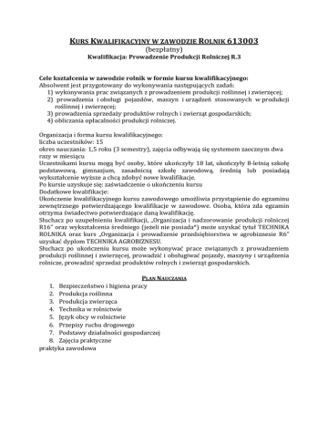 KURS KWALIFIKACYJNY W ZAWODZIE ROLNIK 613003 (bezpłatny) Kwalifikacja: Prowadzenie Produkcji Rolniczej R.3 Cele kształcenia w zawodzie rolnik w formie kursu kwalifikacyjnego: Absolwent jest przygotowany do wykonywania następujących zadań: 1) wykonywania prac związanych z prowadzeniem produkcji roślinnej i zwierzęcej; 2) prowadzenia i obsługi pojazdów, maszyn i urządzeń stosowanych w produkcji roślinnej i zwierzęcej; 3) prowadzenia sprzedaży produktów rolnych i zwierząt gospodarskich; 4) obliczania opłacalności produkcji rolniczej. Organizacja i forma kursu kwalifikacyjnego: liczba uczestników: 15 okres nauczania: 1,5 roku (3 semestry), zajęcia odbywają się systemem zaocznym dwa razy w miesiącu Uczestnikami kursu mogą być osoby, które ukończyły 18 lat, ukończyły 8-letnią szkołę podstawową, gimnazjum, zasadniczą szkołę zawodową, średnią lub posiadają wykształcenie wyższe a chcą zdobyć nowe kwalifikacje. Po kursie uzyskuje się: zaświadczenie o ukończeniu kursu Dodatkowe kwalifikacje: Ukończenie kwalifikacyjnego kursu zawodowego umożliwia przystąpienie do egzaminu zewnętrznego potwierdzającego kwalifikacje w zawodowe. Osoba, która zda egzamin otrzyma świadectwo potwierdzające daną kwalifikację. Słuchacz po uzupełnieniu kwalifikacji, „Organizacja i nadzorowanie produkcji rolniczej R16” oraz wykształcenia średniego (jeżeli nie posiada*) może uzyskać tytuł TECHNIKA ROLNIKA oraz kurs „Organizacja i prowadzenie przedsiębiorstwa w agrobiznesie R6” uzyskać dyplom TECHNIKA AGROBIZNESU. Słuchacz po ukończeniu kursu może wykonywać prace związanych z prowadzeniem produkcji roślinnej i zwierzęcej, prowadzić i obsługiwać pojazdy, maszyny i urządzenia rolnicze, prowadzić sprzedaż produktów rolnych i zwierząt gospodarskich. PLAN NAUCZANIA 1. Bezpieczeństwo i higiena pracy 2. Produkcja roślinna 3. Produkcja zwierzęca 4. Technika w rolnictwie 5. Język obcy w rolnictwie 6. Przepisy ruchu drogowego 7. Podstawy działalności gospodarczej 8. Zajęcia praktyczne praktyka zawodowa