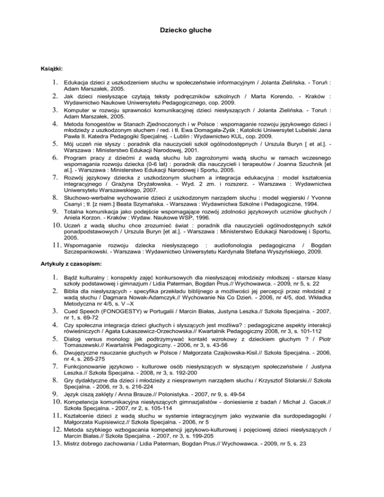 Dziecko głuche Książki: 1. 2. 3. 4. 5. 6. 7. 8. 9. 10. 11. Edukacja dzieci z uszkodzeniem słuchu w społeczeństwie informacyjnym / Jolanta Zielińska. - Toruń : Adam Marszałek, 2005. Jak dzieci niesłyszące czytają teksty podręczników szkolnych / Marta Korendo. - Kraków : Wydawnictwo Naukowe Uniwersytetu Pedagogicznego, cop. 2009. Komputer w rozwoju sprawności komunikacyjnej dzieci niesłyszących / Jolanta Zielińska. - Toruń : Adam Marszałek, 2005. Metoda fonogestów w Stanach Zjednoczonych i w Polsce : wspomaganie rozwoju językowego dzieci i młodzieży z uszkodzonym słuchem / red. i tł. Ewa Domagała-Zyśk ; Katolicki Uniwersytet Lubelski Jana Pawła II. Katedra Pedagogiki Specjalnej. - Lublin : Wydawnictwo KUL, cop. 2009. Mój uczeń nie słyszy : poradnik dla nauczycieli szkół ogólnodostępnych / Urszula Buryn [ et al.]. Warszawa : Ministerstwo Edukacji Narodowej, 2001. Program pracy z dziećmi z wadą słuchu lub zagrożonymi wadą słuchu w ramach wczesnego wspomagania rozwoju dziecka (0-6 lat) : poradnik dla nauczycieli i terapeutów / Joanna Szuchnik [et al.]. - Warszawa : Ministerstwo Edukacji Narodowej i Sportu, 2005. Rozwój językowy dziecka z uszkodzonym słuchem a integracja edukacyjna : model kształcenia integracyjnego / Grażyna Dryżałowska. - Wyd. 2 zm. i rozszerz. - Warszawa : Wydawnictwa Uniwersytetu Warszawskiego, 2007. Słuchowo-werbalne wychowanie dzieci z uszkodzonym narządem słuchu : model węgierski / Yvonne Csanyi ; tł. [z niem.] Beata Szymańska. - Warszawa : Wydawnictwa Szkolne i Pedagogiczne, 1994. Totalna komunikacja jako podejście wspomagające rozwój zdolności językowych uczniów głuchych / Aniela Korzon. - Kraków : Wydaw. Naukowe WSP, 1996. Uczeń z wadą słuchu chce zrozumieć świat : poradnik dla nauczycieli ogólnodostępnych szkół ponadpodstawowych / Urszula Buryn [et al.]. - Warszawa : Ministerstwo Edukacji Narodowej i Sportu, 2005. Wspomaganie rozwoju dziecka niesłyszącego : audiofonologia pedagogiczna / Bogdan Szczepankowski. - Warszawa : Wydawnictwo Uniwersytetu Kardynała Stefana Wyszyńskiego, 2009. Artykuły z czasopism: 1. 2. 3. 4. 5. 6. 7. 8. 9. 10. 11. 12. 13. Bądź kulturalny : konspekty zajęć konkursowych dla niesłyszącej młodzieży młodszej - starsze klasy szkoły podstawowej i gimnazjum / Lidia Paterman, Bogdan Prus.// Wychowawca. - 2009, nr 5, s. 22 Biblia dla niesłyszących - specyfika przekładu biblijnego a możliwości jej percepcji przez młodzież z wadą słuchu / Dagmara Nowak-Adamczyk.// Wychowanie Na Co Dzień. - 2006, nr 4/5, dod. Wkładka Metodyczna nr 4/5, s. V –X Cued Speech (FONOGESTY) w Portugalii / Marcin Białas, Justyna Leszka.// Szkoła Specjalna. - 2007, nr 1, s. 69-72 Czy społeczna integracja dzieci głuchych i słyszących jest możliwa? : pedagogiczne aspekty interakcji rówieśniczych / Agata Łukaszewicz-Orzechowska.// Kwartalnik Pedagogiczny 2008, nr 3, s. 101-112 Dialog versus monolog: jak podtrzymywać kontakt wzrokowy z dzieckiem głuchym ? / Piotr Tomaszewski.// Kwartalnik Pedagogiczny. - 2006, nr 3, s. 43-56 Dwujęzyczne nauczanie głuchych w Polsce / Małgorzata Czajkowska-Kisil.// Szkoła Specjalna. - 2006, nr 4, s. 265-275 Funkcjonowanie językowo - kulturowe osób niesłyszących w słyszącym społeczeństwie / Justyna Leszka.// Szkoła Specjalna. - 2008, nr 3, s. 192-200 Gry dydaktyczne dla dzieci i młodzieży z niesprawnym narządem słuchu / Krzysztof Stolarski.// Szkoła Specjalna. - 2006, nr 3, s. 216-224 Język ciszą zaklęty / Anna Brauze.// Polonistyka. - 2007, nr 9, s. 49-54 Kompetencja komunikacyjna niesłyszących gimnazjalistów - doniesienie z badań / Michał J. Gacek.// Szkoła Specjalna. - 2007, nr 2, s. 105-114 Kształcenie dzieci z wadą słuchu w systemie integracyjnym jako wyzwanie dla surdopedagogiki / Małgorzata Kupisiewicz.// Szkoła Specjalna. - 2006, nr 5 Metoda szybkiego wzbogacania kompetencji językowo-kulturowej i pojęciowej dzieci niesłyszących / Marcin Białas.// Szkoła Specjalna. - 2007, nr 3, s. 199-205 Mistrz dobrego zachowania / Lidia Paterman, Bogdan Prus.// Wychowawca. - 2009, nr 5, s. 23 14. Modelowanie 15. 16. 17. 18. 19. 20. 21. 22. 23. 24. 25. 26. 27. 28. 29. 30. czynności poznawczych dziecka z wadą słuchu jako element pracy pedagoga specjalnego / Jolanta Zielińska.// Szkoła Specjalna. - 2008, nr 2, s. 83-91 Motywacja i ograniczenia percepcyjne dzieci niepełnosprawnych słuchowo w zakresie uczenia się języka angielskiego : (doniesienia z badań) / Jowita Żuk.// Szkoła Specjalna. - 2008, nr 1, s. 19-38 Poglądy Marii Grzegorzewskiej na temat kształcenia dzieci z wadą słuchu / Beata Jackiewicz.// Szkoła Specjalna. - 2010, nr 5, s. 325-333 Porównanie motoryczności dzieci pełnosprawnych, niesłyszących i niepełnosprawnych intelektualnie w stopniu lekkim / Agnieszka Jankowicz-Szymańska, Wiesław Wojtanowski, Maciej Chronowski.// Niepełnosprawność i Rehabilitacja. - 2011, nr 1, s. 55-67 Postępowanie terapeutyczne we wczesnym wspomaganiu rozwoju dziecka z wadą słuchu (wychowanie słuchowe) / Sylwia Ramus.// Rewalidacja. - 2006, nr 2, s. 53-61 Poziom motoryczności - dziewcząt z dysfunkcjami narządu słuchu / Dominik Dąbrowski.// Wychowanie Fizyczne i Zdrowotne. - 2011, nr 5, s. 30-32 Praca z czytelnikiem niesłyszącym / Marta Deńca.// Biblioteka w Szkole. - 2008, nr 1, s. 17-18 Rehabilitacja językowa dzieci niesłyszących w Polsce / Marcin Białas.// Szkoła Specjalna. - 2007, nr 1, s. 21-36 Rola wycieczek szkolnych, zielonych szkół w nauczaniu dzieci i młodzieży niesłyszącej / Alicja Kubiak.// Szkoła Specjalna. - 2007, nr 5, s. 364-373 Scenariusz zajęć słuchowo-ruchowych dla klas integracyjnych z uczniem niesłyszącym / Marzena Czrnowska.// Nauczanie Początkowe. - 2008/2009, nr 4, s. 67-73 Wewnętrzne uwarunkowania zdolności motorycznych - dzieci i młodzieży z dysfunkcjami narządu słuchu / Dominik Dąbrowski.// Wychowanie Fizyczne i Zdrowotne. - 2009, nr 7, s