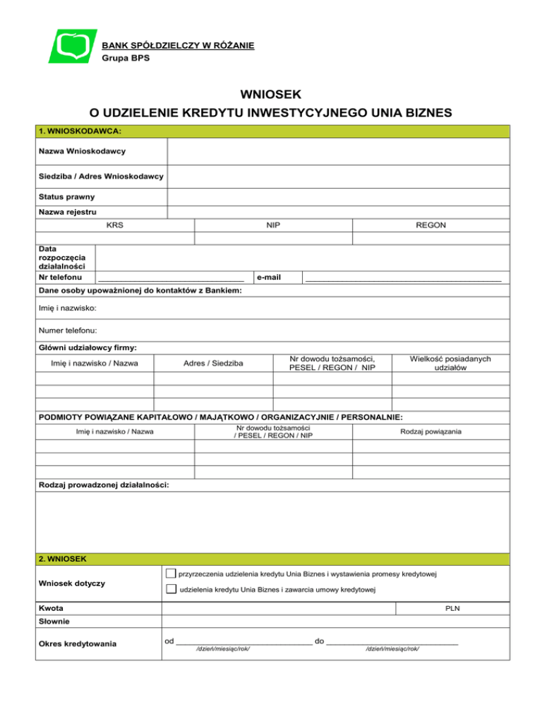 wniosek o udzielenie kredytu inwestycyjnego unia biznes