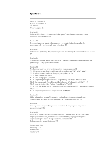Spis treści Table of Contents 7 Wykaz akronimów 9 Od Autora 17 Wprowadzenie 21 Rozdział 1 Dobrowolni migranci ekonomiczni jako specyficzna i autonomiczna prawnie kategoria cudzoziemców 41 Rozdział 2 Proces migracyjny jako źródło zagrożeń i wyzwań dla fundamentalnych, gospodarczych i społecznych praw człowieka 49 Rozdział 3 Podstawowe problemy dotykające migrantów zarobkowych oraz członków ich rodzin 59 Rozdział 4 Migracje nielegalne jako źródło zagrożeń i wyzwań dla prawa międzynarodowego publicznego i sfery praw człowieka 81 Rozdział 5 Mechanizmy ochrony prawnej imigrantów ekonomicznych 91 5.1. Uniwersalne mechanizmy i instytucje współpracy (ONZ, MOP, IOM) 91 5.2. Regionalne mechanizmy i instytucje współpracy 126 5.2.1. Rada Europy (RE) 128 5.2.2. Unia Europejska (UE) 132 5.2.3. Organizacja Bezpieczeństwa i Współpracy w Europie (OBWE) 146 5.2.4. Stowarzyszenie Narodów Azji Południowo-Wschodniej (ASEAN) 149 5.2.5. Liga Arabska (Liga Państw Arabskich, LPA) 152 5.2.6. Unia Afrykańska (UA) oraz mechanizmy współpracy UE z państwami regionu Afryki 153 5.2.7. Organizacja Państw Amerykańskich (OPA) 167 Rozdział 6 Kilka refleksji na temat efektywności regionalnych dokumentów ochrony pracowników migrujących oraz perspektyw rozwoju zagadnienia 169 Rozdział 7 Sektor pozarządowy wobec problemów doświadczanych przez migrantów ekonomicznych 183 Rozdział 8 Pozytywne aspekty transnarodowej mobilności zarobkowej: Międzynarodowe migracje ekonomiczne jako narzędzie wzmocnienia pozycji prawnej oraz indywidualnej wolności i bezpieczeństwa jednostki 191 Podsumowanie i uwagi końcowe 197 Streszczenie 219 Summary 225 Bibliografia 229 Aneksy 245