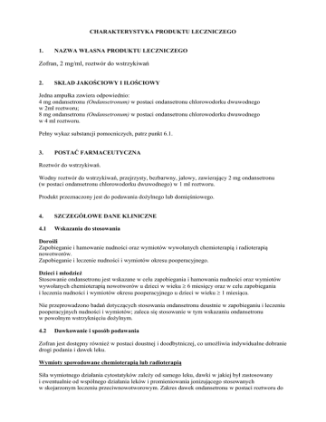 CHARAKTERYSTYKA PRODUKTU LECZNICZEGO 1. NAZWA WŁASNA PRODUKTU LECZNICZEGO Zofran, 2 mg/ml, roztwór do wstrzykiwań 2. SKŁAD JAKOŚCIOWY I ILOŚCIOWY Jedna ampułka zawiera odpowiednio: 4 mg ondansetronu (Ondansetronum) w postaci ondansetronu chlorowodorku dwuwodnego w 2ml roztworu; 8 mg ondansetronu (Ondansetronum) w postaci ondansetronu chlorowodorku dwuwodnego w 4 ml roztworu. Pełny wykaz substancji pomocniczych, patrz punkt 6.1. 3. POSTAĆ FARMACEUTYCZNA Roztwór do wstrzykiwań. Wodny roztwór do wstrzykiwań, przejrzysty, bezbarwny, jałowy, zawierający 2 mg ondansetronu (w postaci ondansetronu chlorowodorku dwuwodnego) w 1 ml roztworu. Produkt przeznaczony jest do podawania dożylnego lub domięśniowego. 4. SZCZEGÓŁOWE DANE KLINICZNE 4.1 Wskazania do stosowania Dorośli Zapobieganie i hamowanie nudności oraz wymiotów wywołanych chemioterapią i radioterapią nowotworów. Zapobieganie i leczenie nudności i wymiotów okresu pooperacyjnego. Dzieci i młodzież Stosowanie ondansetronu jest wskazane w celu zapobiegania i hamowania nudności oraz wymiotów wywołanych chemioterapią nowotworów u dzieci w wieku 6 miesięcy oraz w celu zapobiegania i leczenia nudności i wymiotów okresu pooperacyjnego u dzieci w wieku 1 miesiąca. Nie przeprowadzono badań dotyczących stosowania ondansetronu doustnie w zapobieganiu i leczeniu pooperacyjnych nudności i wymiotów; zaleca się stosowanie w tym wskazaniu ondansetronu w powolnym wstrzyknięciu dożylnym. 4.2 Dawkowanie i sposób podawania Zofran jest dostępny również w postaci doustnej i doodbytniczej, co umożliwia indywidualne dobranie drogi podania i dawek leku. Wymioty spowodowane chemioterapią lub radioterapią Siła wymiotnego działania cytostatyków zależy od samego leku, dawki w jakiej był zastosowany i ewentualnie od wspólnego działania leków i promieniowania jonizującego stosowanych w skojarzonym leczeniu przeciwnowotworowym. Zakres dawek ondansetronu w postaci roztworu do -2wstrzykiwań wynosi od 8 mg do 32 mg na dobę. Wybór dawki i drogi podania zależy od rodzaju radioterapii i chemioterapii. Dorośli Chemioterapia o średnim działaniu wymiotnym i radioterapia: W dniu przeprowadzenia chemioterapii o średnim działaniu wymiotnym lub radioterapii wywołującej wymioty ondansetron można podać pacjentowi doustnie, dożylnie, domięśniowo lub doodbytniczo. Zalecana dawka parenteralna ondansetronu wynosi 8 mg. Dawkę podaje się bezpośrednio przed rozpoczęciem chemioterapii w powolnym wstrzyknięciu dożylnym trwającym nie krócej niż 30 sekund lub we wstrzyknięciu domięśniowym. Po 12 godzinach podaje się kolejną dawkę - 8 mg ondansetronu w postaci doustnej. W okresie od 2 doby do maksymalnie 5 dób od przeprowadzenia chemio- lub radioterapii o działaniu wymiotnym, w celu zapobiegania nudnościom i wymiotom opóźnionym lub przedłużonym, zaleca się kontynuowanie podawania ondansetronu, w postaciach doustnych lub doodbytniczych. Chemioterapia o silnym działaniu wymiotnym: W dniu zastosowania chemioterapeutyku o silnym działaniu wymiotnym, np. dużych dawek cisplatyny, ondansetron można podać pacjentowi dożylnie, domięśniowo lub doodbytniczo. Zofran w postaci roztworu do wstrzykiwań wykazywał skuteczność w następujących schematach dawkowania obejmujących okres 24 godzin, w ciągu których przeprowadzono chemioterapię: pojedyncza dawka 8 mg podana w powolnym wstrzyknięciu dożylnym (w czasie nie krótszym niż 30 sekund) lub domięśniowo bezpośrednio przed chemioterapią; dawka 8 mg ondansetronu podana w powolnym wstrzyknięciu dożylnym (w czasie nie krótszym niż 30 sekund) lub domięśniowo bezpośrednio przed chemioterapią, a następnie dwukrotnie powtórzona w odstępach czterogodzinnych w powolnym wstrzyknięciu dożylnym (w czasie nie krótszym niż 30 sekund) lub domięśniowo, lub jako następująca po pierwszej dawce ciągła infuzja dożylna z szybkością 1 mg ondansetronu na godzinę przez 24 godziny; maksymalna początkowa dawka to 16 mg rozcieńczona w 50 do 100 ml 0,9% roztwór chlorku sodu do wlewów dożylnych lub w innym odpowiednim płynie infuzyjnym (patrz punkt 6.6) i podana w postaci infuzji trwającej nie krócej niż 15 minut bezpośrednio przed chemioterapią. Po zastosowaniu początkowej dawki produktu Zofran można podać w odstępach czterogodzinnych dwie dodatkowe dawki 8 mg dożylnie (we wstrzyknięciu trwającym nie krócej niż 30 sekund) lub domięśniowo. Nie wolno podawać pojedynczych dawek większych niż 16 mg w związku z ryzykiem zależnego od dawki wydłużenia odstępu QT (patrz punkty 4.4, 4.8 i 5.1). Wybór odpowiedniego schematu powinien być uzależniony od przewidywanej siły wymiotnego działania leku (leków). Dawki większe niż 8 mg (do maksymalnej dawki 16 mg) mogą być podane dożylnie tylko po rozcieńczeniu w 50 do 100 ml 0,9% roztwór chlorku sodu do wlewów dożylnych lub w innych odpowiednich płynach infuzyjnych (patrz punkt 6.6) w postaci infuzji trwającej nie krócej niż 15 minut. Dawki 8 mg i mniejsze nie muszą być rozcieńczane i można je podać w postaci powolnego wstrzyknięcia dożylnego (w czasie nie krótszym niż 30 sekund) lub domięśniowo. Przeciwwymiotny skutek działania produktu leczniczego Zofran może być zwiększony przez jednoczesne dodatkowe podanie dożylne 20 mg soli sodowej fosforanu deksametazonu, również bezpośrednio przed rozpoczęciem chemioterapii. -3W okresie od 2 doby do maksymalnie 5 dób od przeprowadzenia chemioterapii o silnym działaniu wymiotnym, w celu zapobiegania nudnościom i wymiotom opóźnionym lub przedłużonym, zaleca się kontynuowanie podawania ondansetronu, w postaciach doustnych lub doodbytniczych. Dzieci i młodzież – nudności i wymioty wywołane chemioterapią nowotworów u dzieci w wieku ≥ 6 miesięcy i u młodzieży Dawkę ondansetronu stosowanego w przypadku nudności oraz wymiotów wywołanych chemioterapią można ustalić albo w przeliczeniu