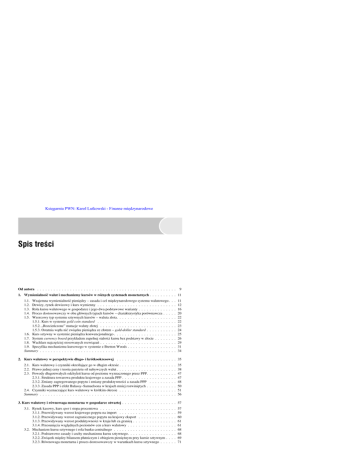 Księgarnia PWN: Karol Lutkowski - Finanse międzynarodowe Spis treœci Od autora . . . . . . . . . . . . . . . . . . . . . . . . . . . . . . . . . . . . . . . . . . . . . . . . . . . 9 1. Wymienialność walut i mechanizmy kursów w różnych systemach monetarnych . . . . . . . . . . 11 1.1. 1.2. 1.3. 1.4. 1.5. Wzajemna wymienialność pieniędzy – zasada i cel międzynarodowego systemu walutowego . Dewizy, rynek dewizowy i kurs wymienny . . . . . . . . . . . . . . . . . . . . . . . . . . . Rola kursu walutowego w gospodarce i jego dwa podstawowe warianty . . . . . . . . . . . . Proces dostosowawczy w obu głównych typach kursów – charakterystyka porównawcza . . . Wzorcowy typ systemu sztywnych kursów – waluta złota . . . . . . . . . . . . . . . . . . . . 1.5.1. Kurs w systemie gold coin standard . . . . . . . . . . . . . . . . . . . . . . . . . . . 1.5.2. „Rozcieńczone” mutacje waluty złotej . . . . . . . . . . . . . . . . . . . . . . . . . . 1.5.3. Ostatnia wątła nić związku pieniądza ze złotem – gold-dollar standard . . . . . . . . . 1.6. Kurs sztywny w systemie pieniądza konwencjonalnego . . . . . . . . . . . . . . . . . . . . . 1.7. System currency board przykładem zupełnej stałości kursu bez podstawy w złocie . . . . . . 1.8. Wachlarz najczęściej stosowanych rozwiązań . . . . . . . . . . . . . . . . . . . . . . . . . . 1.9. Specyfika mechanizmu kursowego w systemie z Bretton Woods . . . . . . . . . . . . . . . . Summary . . . . . . . . . . . . . . . . . . . . . . . . . . . . . . . . . . . . . . . . . . . . . . . . . . . . . . . . . . . . . . . . . . . . . . . . . . 11 12 16 20 22 22 23 24 25 26 29 31 34 2. Kurs walutowy w perspektywie długo- i krótkookresowej . . . . . . . . . . . . . . . . . . . . . . 35 2.1. Kurs walutowy i czynniki określające go w długim okresie . . . . . . . . . . . 2.2. Prawo jednej ceny i teoria parytetu sił nabywczych walut . . . . . . . . . . . . 2.3. Powody długotrwałych odchyleń kursu od poziomu wyznaczonego przez PPP . 2.3.1. Struktura towarowa produktu krajowego a zasada PPP . . . . . . . . . . 2.3.2. Zmiany zagregowanego popytu i zmiany produktywności a zasada PPP 2.3.3. Zasada PPP i efekt Balassy–Samuelsona w krajach mniej rozwiniętych . 2.4. Czynniki wyznaczające kurs walutowy w krótkim okresie . . . . . . . . . . . Summary . . . . . . . . . . . . . . . . . . . . . . . . . . . . . . . . . . . . . . . . . . . . . . . . . . . . . . . . . . . . . . . . . . . . . . . . . . . . . . . . . . . . . . . . . . . . . . . . . . . . . . . . . . . . . . . . . . . . . . . . 35 38 47 47 48 50 51 56 3. Kurs walutowy i równowaga monetarna w gospodarce otwartej . . . . . . . . . . . . . . . . . . . . 57 3.1. Rynek kasowy, kurs spot i stopa procentowa . . . . . . . . . . . . . . . . . . . . . . . . 3.1.1. Przewidywany wzrost krajowego popytu na import . . . . . . . . . . . . . . . . . 3.1.2. Przewidywany wzrost zagranicznego popytu na krajowy eksport . . . . . . . . . . 3.1.3. Przewidywany wzrost produktywności w kraju lub za granicą . . . . . . . . . . . . 3.1.4. Przesunięcia względnych poziomów cen a kurs walutowy . . . . . . . . . . . . . . 3.2. Mechanizm kursu sztywnego i rola banku centralnego . . . . . . . . . . . . . . . . . . . 3.2.1. Podstawowe zasady i cechy mechanizmu kursu sztywnego . . . . . . . . . . . . . . 3.2.2. Związek między bilansem płatniczym i obiegiem pieniężnym przy kursie sztywnym 3.2.3. Równowaga monetarna i proces dostosowawczy w warunkach kursu sztywnego . . . . . . . . . . . . . . . . . . . . . . . . . . . . . . . . . . . . . . 57 59 60 61 61 68 68 69 71 6 Spis treœci 3.2.4. Problem autonomii polityki pieniężnej w warunkach kursu sztywnego. 3.2.5. Kwestia skuteczności sterylizacji rezerw w systemie kursu sztywnego . 3.3. Równowaga monetarna i kurs w dynamicznym modelu gospodarki otwartej . Summary . . . . . . . . . . . . . . . . . . . . . . . . . . . . . . . . . . . . . . . . . . . . . . . . . . . . . . . . . . . . . . . . . . . . . . . . . . . . . . . 76 80 82 84 4. Rynek terminowy i kurs forward . . . . . . . . . . . . . . . . . . . . . . . . . . . . . . . . . . . 86 4.1. Wyjaśnienia wstępne . . . . . . . . . . . . . . . . . . . . . . . . . . . . . . . . . . . . . . . . 86 4.2. Arbitraż odsetkowy i spekulacja . . . . . . . . . . . . . . . . . . . . . . . . . . . . . . . . . . 87 4.3. Kurs forward i jego determinanty – zasada „krytego” parytetu stóp procentowych . . . . . . . . 91 4.3.1. Krzywa arbitrażu odstetkowego . . . . . . . . . . . . . . . . . . . . . . . . . . . . . . . 92 4.3.2. Funkcja „krytego” arbitrażu odsetkowego a globalizacja rynków finansowych . . . . . . 97 4.4. Rola spekulacji w kształtowaniu kursu terminowego . . . . . . . . . . . . . . . . . . . . . . . 98 4.5. Rynek terminowy i kurs terminowy w perspektywie długookresowej – znaczenie racjonalnych oczekiwań . . . . . . . . . . . . . . . . . . . . . . . . . . . . . . . . . . . . . . . . . . . . . . 102 Summary . . . . . . . . . . . . . . . . . . . . . . . . . . . . . . . . . . . . . . . . . . . . . . . . . 106 5. System z Bretton Woods przykładem sztywnych kursów w praktyce . . . . . . . . . . . . . . . 108 5.1. 5.2. 5.3. 5.4. 5.5. Sens i zakres wymienialności walut w systemie z Bretton Woods. . . . . . . . . . . . . Priorytety gospodarcze a mechanizm kursowy systemu z Bretton Woods. . . . . . . . . Charakterystyka systemu z Bretton Woods – głębszy sens przyjętych w nim rozwiązań . Krach systemu z Bretton Woods i rozpowszechnienie się floatingu . . . . . . . . . . . . Niedowład mechanizmu równoważącego prawdziwą przyczyną kryzysu systemu z Bretton Woods . . . . . . . . . . . . . . . . . . . . . . . . . . . . . . . . . . . . . . 5.6. Wielobiegunowy system walutowy i nowa postać problemu płynności . . . . . . . . . Summary . . . . . . . . . . . . . . . . . . . . . . . . . . . . . . . . . . . . . . . . . . . . . . . . . . . . . . . . . . . . . 108 110 113 118 . . .