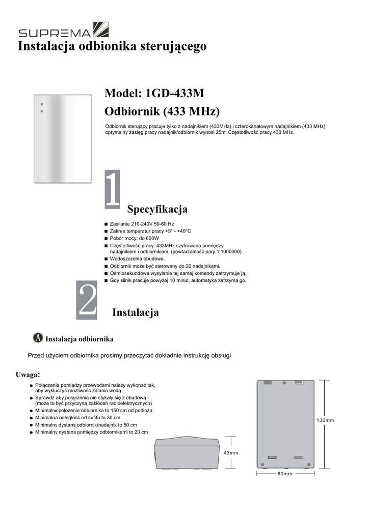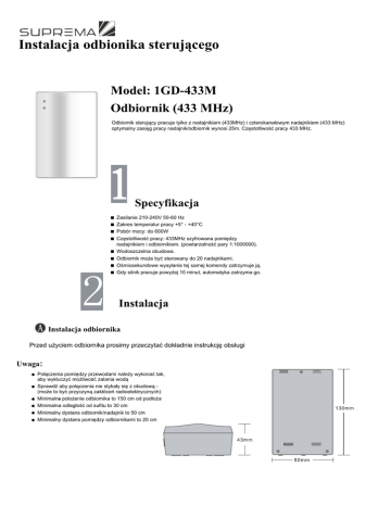Instalacja odbionika sterującego Model: 1GD-433M Odbiornik (433 MHz) Odbiornik sterujący pracuje tylko z nadajnikiem (433MHz) i czterokanałowym nadajnikiem (433 MHz) optymalny zasięg pracy nadajnik/odbiornik wynosi 25m. Częstotliwość pracy 433 MHz. Specyfikacja ■ ■ ■ ■ ■ ■ ■ ■ Zasilanie 210-240V 50-60 Hz Zakres temperatur pracy +5° - +40°C Pobór mocy: do 600W Częstotliwość pracy: 433MHz szyfrowana pomiędzy nadajnikiem i odbiornikiem. (powtarzalność pary 1:1000000). Wodoszczelna obudowa. Odbiornik może być sterowany do 20 nadajnikami. Ośmiosekundowe wysyłanie tej samej komendy zatrzymuje ją. Gdy silnik pracuje powyżej 10 minut, automatyka zatrzyma go. Instalacja Instalacja odbiornika Przed użyciem odbiornika prosimy przeczytać dokładnie instrukcję obsługi Uwaga: ● ● ● ● ● ● Połączenia pomiędzy przewodami należy wykonać tak, aby wykluczyć możliwość zalania wodą Sprawdź aby połączenia nie stykały się z obudową (może to być przyczyną zakłóceń radioelektrycznych) Minimalne położenie odbiornika to 150 cm od podłoża Minimalna odległość od sufitu to 30 cm Minimalny dystans odbiornik/nadajnik to 50 cm Minimalny dystans pomiędzy odbiornikami to 20 cm Instalacja odbionika sterującego Połączenia wewnątrz odbiornika Odbiornik jest zgodny z każdym silnikiem prądu zmiennego. Wykorzystując rysunek dostosuj się do wskazówek ● Przed rozpoczęciem połączeń wyłącz zasilanie ● Wyładowania statyczne mogą uszkodzić elementy wewnętrzne ● Do połączeń używaj linek ● Po wykonaniu wszystkich połączeń upewnij się że długość przewodów jest odpowiednia ● Podłącz uziemienie Przełącznik on/off do wyboru funkcji UP-DOWN do kierunku góra-dół Zmień położenie tego przełącznika gdy kierunek pracy silnika jest nieprawidłowy(bez zmiany połączeń) Połączenia 1. L: faza 2. N: zero 3. E: uziemienie 4. L: Silnik góra/dół 5. R: Silnik dół/góra 6. E: Uziemienie silnika 7. N: Zerowanie silnika BŁĘDY: ZDARZENIE ROZWIĄZANIE Nie świeci się dioda LED gdy naciskasz przycisk na pilocie Sprawdź baterie, ich stan i położenie Wysłana komenda nie jest wykonywana Sprawdź połączenia przewodów i ustawienia. Silnik nie pracuje, dioda LED potwierdza przyjęcie komendy Sprawdź połączenia pomiędzy silnikiem a odbiornikiem sterującym, sprawdź zasilanie. Zasilanie jest podłączone ale dioda "instrukcji" nie świeci i silnik nie pracuje. Sprawdź bezpiecznik po stronie zasilania. PILOT ZDALNEGO STEROWANIA INSTALACJA MODEL: 1GD-433M / 4GD-433M Nadajnik jest kompatybilny z odbiornikiem i pracującym na częstotliwości 433 MHz. SPECYFIKACJA . Bateria 12V, rozmiar 23A Ochrona IP 30 Zakres temperatur: +5°C - +40°C Wygodna obsługa Odporny na standardowe zanieczyszczenia Programowanie PAROWANIE ODBIORNIK/NADAJNIK ODBIORNIK Naciśnij delikatnie przycisk "sw5" LED mruga. Po 10 sekundach odbiornik oczekuje na kod nadajnika. Gdy dioda LED przestaje mrugać komenda jest skasowana. Odbiornik pracuje maksymalnie na 20 kanałach. Jeśli wyślesz komendę 21 kanału, Twoja komenda zostanie zignorowana i dioda LED w odbiorniku nie będzie mrugać. WYKASOWANIE KANAŁÓW Z PAMIĘCI ODBIORNIK Nieznacznie naciśnij przycisk "sw5" dioda LED zaczyna mrugać. Po minucie odbiornik czeka na komendę wykaso wania kanału w kontrolerze. Dioda przestaje mrugać po około minucie. NADAJNIK Nadajnik: naciśnij przycisk "down", dioda LED przestanie mrugać. Odbiornik wykasowuje adres kodu i teraz jest możliwe ustawianie. Nadajnik czterokanałowy: Naciśnij okragły przycisk i wybierz właściwy kanał. Naciśnij przycisk "down", dioda LED przestanie mrugać. Odbiornik wykasowuje adres kodu i jest możliwe ustawianie. PILOT ZDALNEGO STEROWANIA INSTALACJA FORMATOWANIE PAMIĘCI ODBIORNIKA Naciśnij przycisk "sw5" dioda LED przyśpieszy mruganie. Teraz naciśnij (przez 2 sekundy) jeszcze raz "sw5" dla potwierdzenia (innaczej funkcja nie zadziała). Pamięć odbiornika jest wyczyszczona. Używanie A. NADAJNIK Naciśnij wybrany przycisk UP/DOWN/STOP. Odbiornik wykona komendę. B. CZTEROKANAŁOWY NADAJNIK Wybierz kanał. Naciśnij okrągły przycisk, aby "nagrać" wybraną komendę. Naciśnij wybrany przycisk UP/DOWN/STOP. Odbiornik wykona komendę. C. ŻYWOTNOŚĆ BATERII Przy średnim użyciu nadajnika (około 4 razy dziennie) baterie powinny wystarczyć na 2 lata pracy. Gdy bateria jest rozładowana, LED nie mruga i komendy nie są wysyłane do odbiornika. D. WYMIANA BATERII Przesuń w dół osłonę baterii znajdującą się na odwrocie pilota. Wyjmij zużytą baterię. Załóż nową baterię. Uwaga: Zużyte baterie, należy składować w oddzielnych pojemnikach przeznaczonych specjalnie do tego celu. WARUNKI GWARANCJI 1. Okres gwarancji wynosi 12 miesiący od daty sprzedaĪy podanej na oryginale dowodu zakupu . 2. W okresie gwarancji Gwarant zobowiązuje siĊ do bezpáatnej naprawy urządzenia jeĪeli uszkodzenie powstaáo wyáącznie na skutek wad powstaáych z przyczyn tkwiących w urządzeniu (wady produkcyjne) i nie zostaáo spowodowane przez UĪytkownika. 3. Gwarancja nie obejmuje elementów podlegających naturalnemu zuĪyciu (baterie itp.), a takĪe czĊĞci i elementów uszkodzonych przez UĪytkownika. 4. Gwarancją nie są objĊte uszkodzenia, które powstaáy wskutek: a)niewáaĞciwego lub niezgodnego z instrukcją obsáugi uĪytkowania, b)niewáaĞciwego przechowywania lub transportu, c)skokowych zmian napiĊcia w sieci zasilającej (dotyczy ekranów elektrycznych). 5. Usterki ujawnione w okresie gwarancji bĊdą usuniĊte przez GWARANTA w terminie nie dáuĪszym niĪ 21 dni liczonych od daty przyjĊcia produktu do naprawy przez serwis.