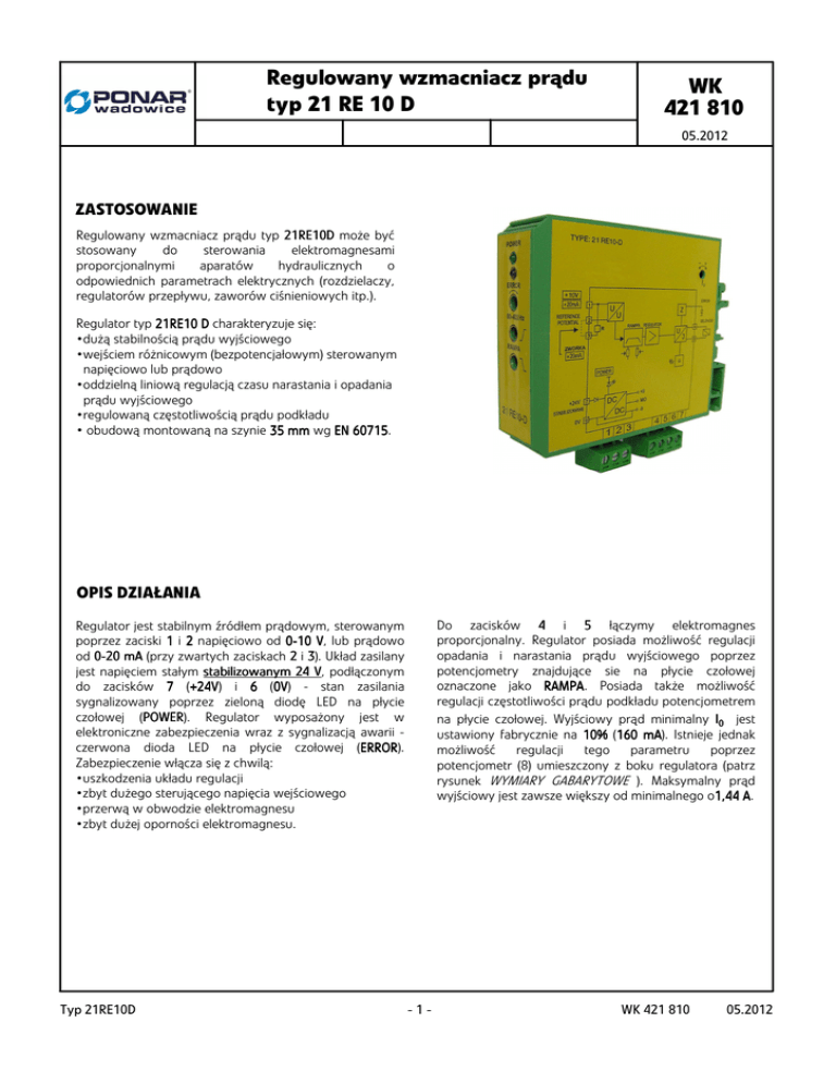 Regulowany wzmacniacz prądu typ 21 RE 10 D WK 421 810 05.2012 ZASTOSOWANIE Regulowany wzmacniacz prądu typ 21RE10 21RE10D 10D może być stosowany do sterowania elektromagnesami proporcjonalnymi aparatów hydraulicznych o odpowiednich parametrach elektrycznych (rozdzielaczy, regulatorów przepływu, zaworów ciśnieniowych itp.). Regulator typ 21RE10 D charakteryzuje się: •dużą stabilnością prądu wyjściowego •wejściem różnicowym (bezpotencjałowym) sterowanym napięciowo lub prądowo •oddzielną liniową regulacją czasu narastania i opadania prądu wyjściowego •regulowaną częstotliwością prądu podkładu • obudową montowaną na szynie 35 mm wg EN 60715. 60715 OPIS DZIAŁANIA Do zacisków 4 i 5 łączymy elektromagnes proporcjonalny. Regulator posiada możliwość regulacji opadania i narastania prądu wyjściowego poprzez potencjometry znajdujące sie na płycie czołowej oznaczone jako RAMPA. RAMPA Posiada także możliwość regulacji częstotliwości prądu podkładu potencjometrem na płycie czołowej. Wyjściowy prąd minimalny I0 jest ustawiony fabrycznie na 10% (160 160 mA). mA Istnieje jednak możliwość regulacji tego parametru poprzez potencjometr (8) umieszczony z boku regulatora (patrz rysunek WYMIARY GABARYTOWE ). Maksymalny prąd wyjściowy jest zawsze większy od minimalnego o1,44 1,44 A. Regulator jest stabilnym źródłem prądowym, sterowanym poprzez zaciski 1 i 2 napięciowo od 0-10 V, lub prądowo od 0-20 mA (przy zwartych zaciskach 2 i 3). Układ zasilany jest napięciem stałym stabilizowanym 24 V, podłączonym do zacisków 7 (+24V +24V) 0V) +24V i 6 (0V 0V - stan zasilania sygnalizowany poprzez zieloną diodę LED na płycie czołowej (POWER POWER). Regulator wyposażony jest w POWER elektroniczne zabezpieczenia wraz z sygnalizacją awarii czerwona dioda LED na płycie czołowej (ERROR ERROR). ERROR Zabezpieczenie włącza się z chwilą: •uszkodzenia układu regulacji •zbyt dużego sterującego napięcia wejściowego •przerwą w obwodzie elektromagnesu •zbyt dużej oporności elektromagnesu. Typ 21RE10D -1- WK 421 810 05.2012 SCHEMAT BLOKOWY 21 RE 10 D ERROR + 10V +20mA POTENCJAŁ ODNIESIENIA 1 Z U U 2 RAMPA REGULATOR R 4 U 3 ZWORKA +20mA I POWER +24V 7 STABILIZOWANE 0V 6 G DC DC 5 ELEKTROMAGNES PROPORCJONALNY -9V MO -9V DANE TECHNICZNE Napięcie zasilania Napięcie apięcie lub prąd prąd steruj sterujący Czas rampy (narastanie, opadanie) Prąd Prąd wyjścio wyjści owy min mi nima imalny Prąd Prąd wyjścio wyjści owy ma m aksymal syma lny Częst zęstotliw tliwo prąd u po podkł dkładu adu iwość prądu Stopień ochrony obudowy Dopuszczalna temperatura pracy Rodzaj mocowania Wymiary (D x W x S) Masa WK 421 810 05.2012 24 V stabi stabili abiliz lizowane wane 0-10 V lub 0-20 mA (zwarte zaciski 2 i 3) 0-5 s 160 mA przy zerowej wartości zadanej 1,6 A przy max. wartości zadanej 80-420 Hz (ust ustawien awienie ienie fabrycz f abryczne abrycz ne 180 Hz) IP 20 (PN-EN 60529:2003) o 0 - 50 C szyna nośna 35x7.5x1 mm (wg EN 60715) 102 x 96 x 22,4 mm 0,11 kg -2- Typ 21RE10D WYMIARY GABARYTOWE Szyna montażowa 35 mm wg EN 60715 102 22,4 91 1 2 8 82 3 96 4 5 7 1 2 3 4 5 6 7 6 1 2 3 4 5 6 7 8 Zielona dioda LED zasilanie (POWER) Czerwona dioda LED awaria (ERRO RROR) Potencjometr regulacji częstotliwości prądu podkładu Regulacja prądu narastania Regulacja prądu opadania Zaciski przyłączeniowe (tab. poniżej) Szyna montażowa 35 mm wg EN 60715 Regulacja prądu minimalnego (I0) PODŁĄCZENIE ZACISKÓW ZACI ZAC ISK 1 2 OPI S 3 4 5 Sterujące napięcie +10 V lub prąd +20 mA Potencjał odniesienia Zworka z zaciskiem 2 przy ster. prądowym Elektromagnes proporcjonalny 6 7 Zasilanie 0 V stab. Zasilanie +24 V stab. Typ 21RE10D -3- WK 421 810 05.2012 SPOSÓB ZAMAWIANIA Wzmacniacz należy zamawiać wg niżej przedstawionego kodu. 21 RE10 D * Ewentualne dodatkowe wymagania określone w sposób opisowy (uzgodnione z producentem, np. przystosowanie do niskich temperatur) UWA UWAGI: Jakiekolwiek prace przyłączeniowe lub regulacyjne należy przeprowadzać przy odłączonym zasilaniu. Odległość od urządzeń radiowych powinna wynosić minimum 1m. Kabel z sygnałem sterującym powinien być ekranowany. Przewodów do elektromagnesu nie należy prowadzić razem z przewodami sygnałów sterujących. Wzmacniacz prądu 21RE10D należy połączyć z elektromagnesem proporcjonalnym i zaciskami sterującymi zgodnie ze schematem blokowym. PONAR Wadowice S.A. ul. Wojska Polskiego 29 34-100 Wadowice tel. +48 33 488 29 00 fax.+48 33 488 21 03 www.ponar-wadowice.pl WK 421 810 05.2012 -4- Typ 21RE10D
