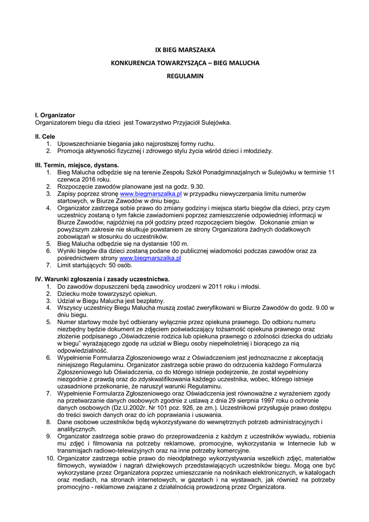 IX BIEG MARSZAŁKA KONKURENCJA TOWARZYSZĄCA – BIEG MALUCHA REGULAMIN I. Organizator Organizatorem biegu dla dzieci jest Towarzystwo Przyjaciół Sulejówka. II. Cele 1. Upowszechnianie biegania jako najprostszej formy ruchu. 2. Promocja aktywności fizycznej i zdrowego stylu życia wśród dzieci i młodzieży. III. Termin, miejsce, dystans. 1. Bieg Malucha odbędzie się na terenie Zespołu Szkół Ponadgimnazjalnych w Sulejówku w terminie 11 czerwca 2016 roku. 2. Rozpoczęcie zawodów planowane jest na godz. 9.30. 3. Zapisy poprzez stronę www.biegmarszalka.pl w przypadku niewyczerpania limitu numerów startowych, w Biurze Zawodów w dniu biegu. 4. Organizator zastrzega sobie prawo do zmiany godziny i miejsca startu biegów dla dzieci, przy czym uczestnicy zostaną o tym fakcie zawiadomieni poprzez zamieszczenie odpowiedniej informacji w Biurze Zawodów, najpóźniej na pół godziny przed rozpoczęciem biegów. Dokonanie zmian w powyższym zakresie nie skutkuje powstaniem ze strony Organizatora żadnych dodatkowych zobowiązań w stosunku do uczestników. 5. Bieg Malucha odbędzie się na dystansie 100 m. 6. Wyniki biegów dla dzieci zostaną podane do publicznej wiadomości podczas zawodów oraz za pośrednictwem strony www.biegmarszalka.pl 7. Limit startujących: 50 osób. IV. Warunki zgłoszenia i zasady uczestnictwa. 1. Do zawodów dopuszczeni będą zawodnicy urodzeni w 2011 roku i młodsi. 2. Dziecku może towarzyszyć opiekun. 3. Udział w Biegu Malucha jest bezpłatny. 4. Wszyscy uczestnicy Biegu Malucha muszą zostać zweryfikowani w Biurze Zawodów do godz. 9.00 w dniu biegu. 5. Numer startowy może być odbierany wyłącznie przez opiekuna prawnego. Do odbioru numeru niezbędny będzie dokument ze zdjęciem poświadczający tożsamość opiekuna prawnego oraz złożenie podpisanego „Oświadczenie rodzica lub opiekuna prawnego o zdolności dziecka do udziału w biegu” wyrażającego zgodę na udział w Biegu osoby niepełnoletniej i biorącego za nią odpowiedzialność. 6. Wypełnienie Formularza Zgłoszeniowego wraz z Oświadczeniem jest jednoznaczne z akceptacją niniejszego Regulaminu. Organizator zastrzega sobie prawo do odrzucenia każdego Formularza Zgłoszeniowego lub Oświadczenia, co do którego istnieje podejrzenie, że został wypełniony niezgodnie z prawdą oraz do zdyskwalifikowania każdego uczestnika, wobec, którego istnieje uzasadnione przekonanie, że naruszył warunki Regulaminu. 7. Wypełnienie Formularza Zgłoszeniowego oraz Oświadczenia jest równoważne z wyrażeniem zgody na przetwarzanie danych osobowych zgodnie z ustawą z dnia 29 sierpnia 1997 roku o ochronie danych osobowych (Dz.U.2002r. Nr 101 poz. 926, ze zm.). Uczestnikowi przysługuje prawo dostępu do treści swoich danych oraz do ich poprawiania i usuwania. 8. Dane osobowe uczestników będą wykorzystywane do wewnętrznych potrzeb administracyjnych i analitycznych. 9. Organizator zastrzega sobie prawo do przeprowadzenia z każdym z uczestników wywiadu, robienia mu zdjęć i filmowania na potrzeby reklamowe, promocyjne, wykorzystania w Internecie lub w transmisjach radiowo-telewizyjnych oraz na inne potrzeby komercyjne. 10. Organizator zastrzega sobie prawo do nieodpłatnego wykorzystywania wszelkich zdjęć, materiałów filmowych, wywiadów i nagrań dźwiękowych przedstawiających uczestników biegu. Mogą one być wykorzystane przez Organizatora poprzez umieszczanie na nośnikach elektronicznych, w katalogach oraz mediach, na stronach internetowych, w gazetach i na wystawach, jak również na potrzeby promocyjno - reklamowe związane z działalnością prowadzoną przez Organizatora. V. Klasyfikacje i nagrody 1. Ze względu na zabawowy charakter imprezy, Organizator nie przewiduje pomiaru czasu dla wszystkich uczestników biegu. Dla trzech pierwszych zawodników oraz trzech pierwszych zawodniczek na mecie, mierzony będzie czas brutto stoperem. 2. Wszyscy uczestnicy Biegu Malucha otrzymają na mecie pamiątkowy medal IX Biegu Marszałka. VI. Uwagi końcowe 1. Rodzice (lub opiekunowie) biorą pełną odpowiedzialność za dziecko – uczestnika. Organizator nie ponosi odpowiedzialności za ewentualne kolizje i wypadki na trasie. Uczestnicy nie są objęci ubezpieczeniem. 2. Organizator nie odpowiada za rzeczy wartościowe pozostawione podczas imprezy. 3. Jeżeli którekolwiek z postanowień Regulaminu uznane zostanie w całości lub części za nieważne lub niemożliwe do wyegzekwowania, to wszelkie inne postanowienia (w całości bądź części) zachowają ważność i wykonalność. 4. Organizator zastrzega sobie prawo do wprowadzenie ewentualnych zmian w Regulaminie. Wiążąca i ostateczna interpretacja Regulaminu należy do Organizatora. O zmianach w Regulaminie Organizator będzie informował na stronie www.biegmarszalka.pl 5. W sprawach nieujętych Regulaminem rozstrzyga Organizator. ORGANIZATOR