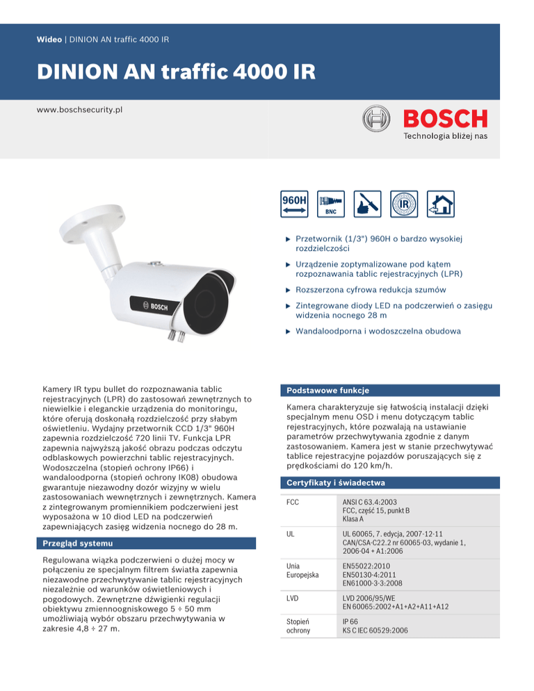 Wideo | DINION AN traffic 4000 IR DINION AN traffic 4000 IR www.boschsecurity.pl 960H Kamery IR typu bullet do rozpoznawania tablic rejestracyjnych (LPR) do zastosowań zewnętrznych to niewielkie i eleganckie urządzenia do monitoringu, które oferują doskonałą rozdzielczość przy słabym oświetleniu. Wydajny przetwornik CCD 1/3" 960H zapewnia rozdzielczość 720 linii TV. Funkcja LPR zapewnia najwyższą jakość obrazu podczas odczytu odblaskowych powierzchni tablic rejestracyjnych. Wodoszczelna (stopień ochrony IP66) i wandaloodporna (stopień ochrony IK08) obudowa gwarantuje niezawodny dozór wizyjny w wielu zastosowaniach wewnętrznych i zewnętrznych. Kamera z zintegrowanym promiennikiem podczerwieni jest wyposażona w 10 diod LED na podczerwień zapewniających zasięg widzenia nocnego do 28 m. Przegląd systemu Regulowana wiązka podczerwieni o dużej mocy w połączeniu ze specjalnym filtrem światła zapewnia niezawodne przechwytywanie tablic rejestracyjnych niezależnie od warunków oświetleniowych i pogodowych. Zewnętrzne dźwigienki regulacji obiektywu zmiennoogniskowego 5 ÷ 50 mm umożliwiają wybór obszaru przechwytywania w zakresie 4,8 ÷ 27 m. u Przetwornik (1/3") 960H o bardzo wysokiej rozdzielczości u Urządzenie zoptymalizowane pod kątem rozpoznawania tablic rejestracyjnych (LPR) u Rozszerzona cyfrowa redukcja szumów u Zintegrowane diody LED na podczerwień o zasięgu widzenia nocnego 28 m u Wandaloodporna i wodoszczelna obudowa Podstawowe funkcje Kamera charakteryzuje się łatwością instalacji dzięki specjalnym menu OSD i menu dotyczącym tablic rejestracyjnych, które pozwalają na ustawianie parametrów przechwytywania zgodnie z danym zastosowaniem. Kamera jest w stanie przechwytywać tablice rejestracyjne pojazdów poruszających się z prędkościami do 120 km/h. Certyfikaty i świadectwa FCC ANSI C 63.4:2003 FCC, część 15, punkt B Klasa A UL UL 60065, 7. edycja, 2007-12-11 CAN/CSA-C22.2 nr 60065-03, wydanie 1, 2006-04 + A1:2006 Unia Europejska EN55022:2010 EN50130-4:2011 EN61000-3-3:2008 LVD LVD 2006/95/WE EN 60065:2002+A1+A2+A11+A12 Stopień ochrony IP 66 KS C IEC 60529:2006 2 | DINION AN traffic 4000 IR Region Certyfikacja Europa CE Dane techniczne Stopień ochrony przed wodą i kurzem IP66 Odporność na uderzenia IK08 Temperatura pracy -30 ÷ 50ºC Przetwornik obrazu 960H, CCD 1/3", rozdzielczość 720 linii TV Temperatura przechowywania -20 ÷ 60°C System PAL lub NTSC 20 ÷ 90%, względna Liczba pikseli obrazu (poz. x pion.) 1020 x 596 (PAL) 1020 x 508 (NTSC) Wilgotność względna przechowywania Aktywne piksele (poz. x pion.) 976 x 582 (PAL) 976 x 494 (NTSC) Rodzaj obiektywu Wbudowany obiektyw zmiennoogniskowy z automatyczną przysłoną Kamera IR typu bullet 960H do rozpoznawania tablic rejestracyjnych, do zastosowań zewnętrznych, obiektyw zmiennoogniskowy 5 ÷ 50 mm, 12 VDC/ 24 VAC, PAL Długość ogniskowej 5 ÷ 50 mm Numer zamówienia VLR-4075-V511 Apertura obiektywu F1.4 – 360 DINION AN traffic 4000 IR Regulacja obiektywu Zewn. Wyjście wizyjne Całkowity sygnał wizyjny: 1 Vpp, 75 Ω Zasilanie 12 VDC lub 24 VAC Pobór mocy Maks. 600 mA (12 VDC) Maks. 7,7 W (24 VAC) Synchronizacja Synchronizacja wewnętrzna Stosunek sygnał/szum (wyłączona automatyczna regulacja wzmocnienia) Min. 50 dB Czułość Tryb monochromatyczny (z podczerwienią) 0,0 lx Migawka elektroniczna 1/250 ÷ 1/100 000 Oświetlenie w podczerwieni 10 wbudowanych diod LED na podczerwień, 850 nm Zakres w podczerwieni Do 28 m Kąt promieniowania podczerwieni 24°/24° (poz./pion.) Maksymalna prędkość przechwytywanych obiektów 120 km/h Język menu ekranowego Angielski, niemiecki, francuski, rosyjski, portugalski, hiszpański Montaż W zestawie uchwyt mocujący z prowadnikiem przewodów Wymiary (Ø x wys.) 95 x 150 mm Ciężar (z uchwytem) 1,9 kg Obudowa Odlew aluminium/aluminium obrabiane Kolor Kamera/uchwyt: RAL9003 Zamówienia - informacje DINION AN traffic 4000 IR Kamera IR typu bullet 960H do rozpoznawania tablic rejestracyjnych, do zastosowań zewnętrznych, obiektyw zmiennoogniskowy 5 ÷ 50 mm, 12 VDC/ 24 VAC, NTSC Numer zamówienia VLR-4075-V521 3 | DINION AN traffic 4000 IR Reprezentowana przez: Poland Robert Bosch Sp. z o.o. Jutrzenki 105 str. 02-231 Warszawa Phone: +48 22 715 4101 Fax: +48 22 715 4105 [email protected] www.boschsecurity.pl © Robert Bosch Sp. z o.o./ Security Systems 2014 | Zastrzega się możliwość wprowadzania zmian 11158242955 | pl, V7, 22. Kwi 2014