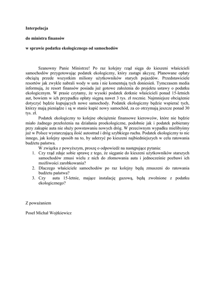 Interpelacja do ministra finansów w sprawie podatku ekologicznego od samochodów Szanowny Panie Ministrze! Po raz kolejny rząd sięga do kieszeni właścicieli samochodów przygotowując podatek ekologiczny, który zastąpi akcyzę. Planowane opłaty obciąŜą przede wszystkim miliony uŜytkowników starych pojazdów. Przedstawiciele resortów jak zwykle nabrali wody w usta i nie komentują tych doniesień. Tymczasem media informują, Ŝe resort finansów posiada juŜ gotowe załoŜenia do projektu ustawy o podatku ekologicznym. W prasie czytamy, Ŝe wysoki podatek dotknie właścicieli ponad 15-letnich aut, bowiem w ich przypadku opłaty sięgną nawet 3 tys. zł rocznie. Najmniejsze obciąŜenie dotyczyć będzie kupujących nowe samochody. Podatek ekologiczny będzie wspierać tych, którzy mają pieniądze i są w stanie kupić nowy samochód, za co otrzymają jeszcze ponad 30 tys. zł. Podatek ekologiczny to kolejne obciąŜenie finansowe kierowców, które nie będzie miało Ŝadnego przełoŜenia na działania proekologiczne, podobnie jak i podatek pobierany przy zakupie auta nie słuŜy powstawaniu nowych dróg. W przeciwnym wypadku mielibyśmy juŜ w Polsce wystarczającą ilość autostrad i dróg szybkiego ruchu. Podatek ekologiczny to nic innego, jak kolejny sposób na to, by uderzyć po kieszeni najbiedniejszych w celu ratowania budŜetu państwa. W związku z powyŜszym, proszę o odpowiedź na następujące pytania: 1. Czy rząd zdaje sobie sprawę z tego, Ŝe sięganie do kieszeni uŜytkowników starszych samochodów zmusi wielu z nich do złomowania auta i jednocześnie pozbawi ich moŜliwości zarobkowania? 2. Dlaczego właściciele samochodów po raz kolejny będą zmuszeni do ratowania budŜetu państwa? 3. Czy auta 15-letnie, mające instalację gazową, będą zwolnione z podatku ekologicznego? Z powaŜaniem Poseł Michał Wojtkiewicz