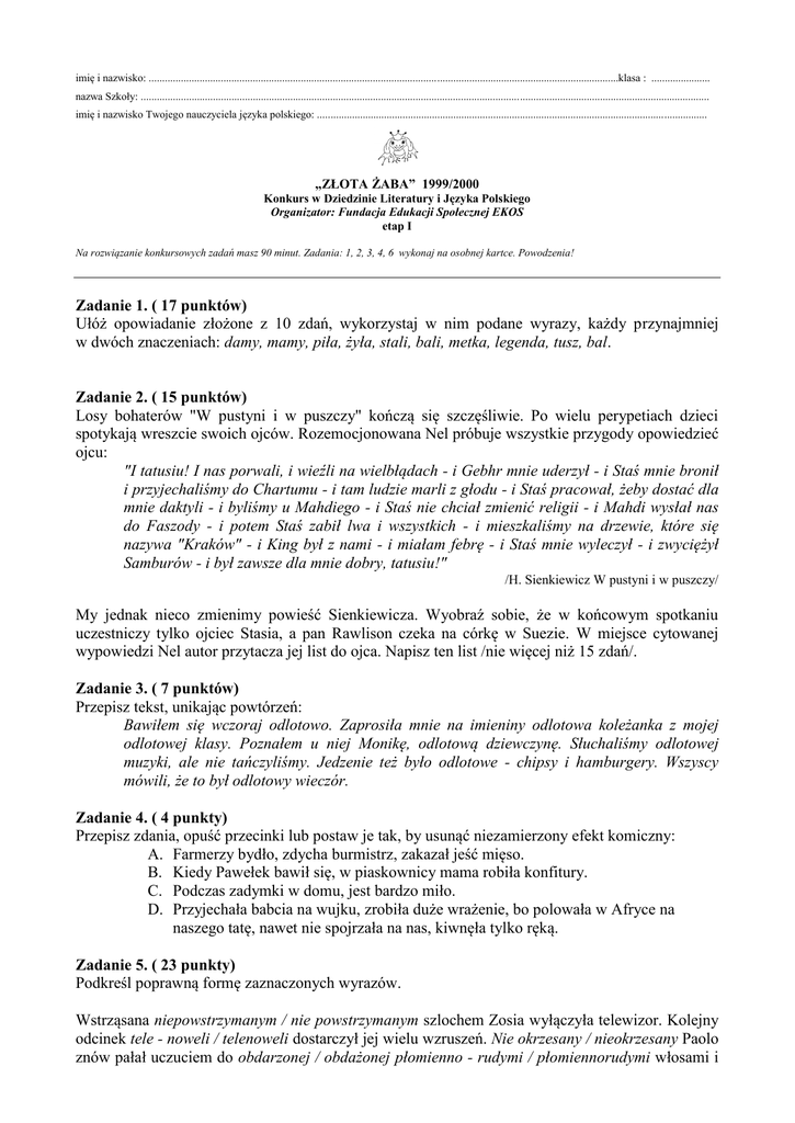 imię i nazwisko: ................................................................................................................................................................................klasa : ...................... nazwa Szkoły: ..................................................................................................................................................................................................................... imię i nazwisko Twojego nauczyciela języka polskiego: .................................................................................................................................................. „ZŁOTA ŻABA” 1999/2000 Konkurs w Dziedzinie Literatury i Języka Polskiego Organizator: Fundacja Edukacji Społecznej EKOS etap I Na rozwiązanie konkursowych zadań masz 90 minut. Zadania: 1, 2, 3, 4, 6 wykonaj na osobnej kartce. Powodzenia! Zadanie 1. ( 17 punktów) Ułóż opowiadanie złożone z 10 zdań, wykorzystaj w nim podane wyrazy, każdy przynajmniej w dwóch znaczeniach: damy, mamy, piła, żyła, stali, bali, metka, legenda, tusz, bal. Zadanie 2. ( 15 punktów) Losy bohaterów "W pustyni i w puszczy" kończą się szczęśliwie. Po wielu perypetiach dzieci spotykają wreszcie swoich ojców. Rozemocjonowana Nel próbuje wszystkie przygody opowiedzieć ojcu: "I tatusiu! I nas porwali, i wieźli na wielbłądach - i Gebhr mnie uderzył - i Staś mnie bronił i przyjechaliśmy do Chartumu - i tam ludzie marli z głodu - i Staś pracował, żeby dostać dla mnie daktyli - i byliśmy u Mahdiego - i Staś nie chciał zmienić religii - i Mahdi wysłał nas do Faszody - i potem Staś zabił lwa i wszystkich - i mieszkaliśmy na drzewie, które się nazywa "Kraków" - i King był z nami - i miałam febrę - i Staś mnie wyleczył - i zwyciężył Samburów - i był zawsze dla mnie dobry, tatusiu!" /H. Sienkiewicz W pustyni i w puszczy/ My jednak nieco zmienimy powieść Sienkiewicza. Wyobraź sobie, że w końcowym spotkaniu uczestniczy tylko ojciec Stasia, a pan Rawlison czeka na córkę w Suezie. W miejsce cytowanej wypowiedzi Nel autor przytacza jej list do ojca. Napisz ten list /nie więcej niż 15 zdań/. Zadanie 3. ( 7 punktów) Przepisz tekst, unikając powtórzeń: Bawiłem się wczoraj odlotowo. Zaprosiła mnie na imieniny odlotowa koleżanka z mojej odlotowej klasy. Poznałem u niej Monikę, odlotową dziewczynę. Słuchaliśmy odlotowej muzyki, ale nie tańczyliśmy. Jedzenie też było odlotowe - chipsy i hamburgery. Wszyscy mówili, że to był odlotowy wieczór. Zadanie 4. ( 4 punkty) Przepisz zdania, opuść przecinki lub postaw je tak, by usunąć niezamierzony efekt komiczny: A. Farmerzy bydło, zdycha burmistrz, zakazał jeść mięso. B. Kiedy Pawełek bawił się, w piaskownicy mama robiła konfitury. C. Podczas zadymki w domu, jest bardzo miło. D. Przyjechała babcia na wujku, zrobiła duże wrażenie, bo polowała w Afryce na naszego tatę, nawet nie spojrzała na nas, kiwnęła tylko ręką. Zadanie 5. ( 23 punkty) Podkreśl poprawną formę zaznaczonych wyrazów. Wstrząsana niepowstrzymanym / nie powstrzymanym szlochem Zosia wyłączyła telewizor. Kolejny odcinek tele - noweli / telenoweli dostarczył jej wielu wzruszeń. Nie okrzesany / nieokrzesany Paolo znów pałał uczuciem do obdarzonej / obdażonej płomienno - rudymi / płomiennorudymi włosami i nie okiełznanym / nieokiełznanym temperamentem Pameli. Zosia tłumiąc łkanie i nucąc rock and rolla / rockandrolla powędrowała do swojego pokoju. Jej miejsce przed ekranem zajął / zajoł Marek. "Czas na tele - konkurs / telekonkurs! Lubię te ekstra zmagania / ekstrazmagania!" pomyślał chłopiec, sadowiąc się wygodnie. Pytania o staro - niemieckie / staroniemieckie dialekty i rozróżnianie hitynowych / chitynowych pancerzyków rohatyńców / rochatyńców to ulubione zajęcie chłopca zajadającego popcorn / pop corn przed telewizorem. Nie darmo / niedarmo przeczytał co niemiara / co nie miara popularno - naukowych / popularnonaukowych książek. Co chwilę rozlegały się jego ohy / ochy i ahy / achy. Zwyciężczyni / zwycięzczyni konkursu, Katowiczanka / katowiczanka o urodzie półtatarki / pół -Tatarki, zeszła ze sceny żegnana oklaskami. Marek obiecał sobie, że on będzie następnym tryumfatorem / triumfatorem. Zadanie 6. ( 20 punktów) Przerysuj tabelkę, podane związki wyrazowe wpisz do odpowiednich rubryk, dzieląc je według pochodzenia: koń trojański, wdowi grosz, oko za oko, męki Tantala, arka przymierza, manna z nieba, syzyfowe prace, puszka Pandory, pięta Achillesa, judaszowe srebrniki, urwać łeb hydrze, kraina mlekiem i miodem plynąca, ciemności egipskie, nić Ariadny, wyrok Salomonowy, stajnia Augiasza, strzała Amora, miecz obosieczny, palec boży, ztote runo. BIBLIA MITOLOGIA Zadanie 7. ( 14 punktów) Rozwiąż krzyżówkę, której hasła tworzą związki frazeologiczne zawierające wyraz ręka lub ręce. Odczytaj rozwiązanie, którym jest frazeologizm z wyrazem ręka. Wyjaśnij jego znaczenie: 1. Dać komuś swobodę działania, pozwolić na dokonywanie wyboru. 2. Zrzekać się odpowiedzialności. 3. Uwzględniać czyjeś potrzeby, życzenia. 4. Uderzyć kogoś, zadać cios. 5. Być leniwym i niezaradnym. 6. Proponować kobiecie małżeństwo. 7. Ustąpić natychmiast, bez śladu. 8. Współdziałać z kimś, wspierać się wzajemnie. 9. Brać udział w czymś, czuwać nad czymś. 10. Wtrącać się do czegoś, kontrolować coś. 11. Wyjść bez szwanku, szczęśliwie z jakiejś opresji. 12. Zrezygnować z działania, być biernym. HASŁO: ZNACZENIE: ...............................................................................................................................