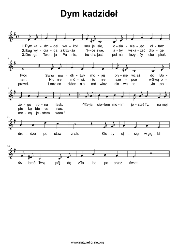 Dym kadzideł dzi cią Two snu je się, rę ce swe, tru dna jest, o sła a by peł na 1. Dym ka 2. Bóg wy 3. Dro ga deł wo kół ga z krzy ża ja Pa nie, nia jąc oł wska zać dro krzy ży, cier tarz gę pień, 4 Twój. nam. prawd. Sznur mo Nic nie Lecz co dli mó dzien twy wi, nie mo nic mó jej nie wisz pły nie wciąż sze pce sło wa te: do Bo w Swą o ,,Ja po 7 że pie mo go tro nu kę bie rze cą je stem Przy ja łask. nas. wam." cie lem mo im je steś Ty, na mej 11 dro dze po staw znak. Kie dy uj rzę w głę bi 14 do broć Twą pój dę z To bą www.nuty.religijne.org po przez świat.