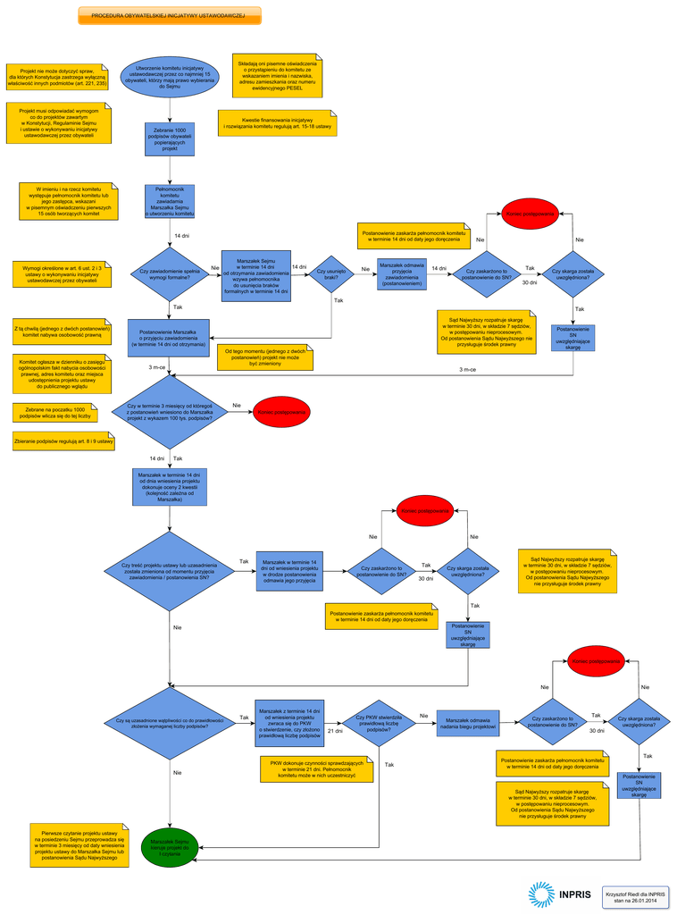 PROCEDURAMOBYWATELSKIEJMINICJATYWYMUSTAWODAWCZEJ UtworzenieMkomitetuMinicjatywy ustawodawczejMprzezMcoMnajmniejMT6 obywateli2MktórzyMmająMprawoMwybierania doMSejmu ProjektMnieMmożeMdotyczyćMspraw2 dlaMktórychMKonstytucjaMzastrzegaMwyłączną właściwośćMinnychMpodmiotówMNartWMEET2MEL6K ProjektMmusiModpowiadaćMwymogom coMdoMprojektówMzawartym wMKonstytucji2MRegulaminieMSejmu iMustawieMoMwykonywaniuMinicjatywy ustawodawczejMprzezMobywateli KwestieMfinansowaniaMinicjatywy iMrozwiązaniaMkomitetuMregulująMartWMT6/T8Mustawy ZebranieMT--podpisówMobywateli popierających projekt WMimieniuMiMnaMrzeczMkomitetu występujeMpełnomocnikMkomitetuMlub jegoMzastępca2Mwskazani wMpisemnymMoświadczeniuMpierwszych T6MosóbMtworzącychMkomitet SkładająMoniMpisemneMoświadczenia oMprzystąpieniuMdoMkomitetuMze wskazaniemMimieniaMiMnazwiska2 adresuMzamieszkaniaMorazMnumeru ewidencyjnegoMPESEL Pełnomocnik komitetu zawiadamia MarszałkaMSejmu oMutworzeniuMkomitetu KoniecMpostępowania PostanowienieMzaskarżaMpełnomocnikMkomitetu wMterminieMTRMdniModMdatyMjegoMdoręczenia TRMdni WymogiMokreśloneMwMartWM7MustWMEMiML ustawyMoMwykonywaniuMinicjatywy ustawodawczejMprzezMobywateli CzyMzawiadomienieMspełnia wymogiMformalne? MarszałekMSejmu TRMdni wMterminieMTRMdniM Nie odMotrzymaniaMzawiadomienia wzywaMpełnomocnika doMusunięciaMbraków formalnychMwMterminieMTRMdni CzyMusunięto braki? Nie MarszałekModmawia przyjęcia zawiadomienia NpostanowieniemK TRMdni Nie Nie CzyMzaskarżonoMto postanowienieMdoMSN? Tak CzyMskargaMzostała uwzględniona? L-Mdni Tak Tak ZMtąMchwiląMNjednegoMzMdwóchMpostanowieńK komitetMnabywaMosobowośćMprawną Tak SądMNajwyższyMrozpatrujeMskargęM wMterminieML-Mdni2MwMskładzieMOMsędziów2 wMpostępowaniuMnieprocesowymWM OdMpostanowieniaMSąduMNajwyższegoMnie przysługujeMśrodekMprawny PostanowienieMMarszałkaM oMprzyjęciuMzawiadomienia NwMterminieMTRMdniModMotrzymaniaK KomitetMogłaszaMwMdziennikuMoMzasięgu ogólnopolskimMfaktMnabyciaMosobowości prawnej2MadresMkomitetuMorazMmiejsca udostępnieniaMprojektuMustawy doMpublicznegoMwglądu OdMtegoMmomentuMNjednegoMzMdwóch postanowieńKMprojektMnieMmoże byćMzmieniony LMm/ce LMm/ce CzyMwMterminieMLMmiesięcyModMktóregoś zMpostanowieńMwniesionoMdoMMarszałka projektMzMwykazemMT--MtysWMpodpisów? ZebraneMnaMpoczatkuMT--podpisówMwliczaMsięMdoMtejMliczby Postanowienie SN uwzględniające skargę Nie KoniecMpostępowania ZbieranieMpodpisówMregulująMartWM8MiM9Mustawy TRMdni Tak MarszałekMwMterminieMTRMdniM odMdniaMwniesieniaMprojektu dokonujeMocenyMEMkwestii NkolejnośćMzależnaMod MarszałkaK KoniecMpostępowania Nie CzyMtreśćMprojektuMustawyMlubMuzasadnienia zostałaMzmienionaModMmomentuMprzyjęcia zawiadomieniaMIMpostanowieniaMSN? Tak MarszałekMwMterminieMTR dniModMwniesieniaMprojektu wMdrodzeMpostanowienia odmawiaMjegoMprzyjęcia Nie CzyMzaskarżonoMto postanowienieMdoMSN? Tak L-Mdni CzyMskargaMzostała uwzględniona? SądMNajwyższyMrozpatrujeMskargę wMterminieML-Mdni2MwMskładzieMOMsędziów2 wMpostępowaniuMnieprocesowymWM OdMpostanowieniaMSąduMNajwyższego nieMprzysługujeMśrodekMprawny Tak PostanowienieMzaskarżaMpełnomocnikMkomitetu wMterminieMTRMdniModMdatyMjegoMdoręczenia Postanowienie SN uwzględniające skargę Nie KoniecMpostępowania Nie CzyMsąMuzasadnioneMwątpliwościMcoMdoMprawidłowości złożeniaMwymaganejMliczbyMpodpisów? Nie Tak MarszałekMzMterminieMTRMdni odMwniesieniaMprojektu zwracaMsięMdoMPKW oMstwierdzenie2MczyMzłożono prawidłowąMliczbęMpodpisów ETMdni CzyMPKWMstwierdziła prawidłowąMliczbę podpisów? PKWMdokonujeMczynnościMsprawdzających wMterminieMETMdniWMPełnomocnik komitetuMmożeMwMnichMuczestniczyć Tak Nie MarszałekModmawia nadaniaMbieguMprojektowi CzyMzaskarżonoMto postanowienieMdoMSN? Nie Tak L-Mdni PostanowienieMzaskarżaMpełnomocnikMkomitetu wMterminieMTRMdniModMdatyMjegoMdoręczenia SądMNajwyższyMrozpatrujeMskargęM wMterminieML-Mdni2MwMskładzieMOMsędziów2 wMpostępowaniuMnieprocesowymW OdMpostanowieniaMSąduMNajwyższego nieMprzysługujeMśrodekMprawny PierwszeMczytanieMprojektuMustawy naMposiedzeniuMSejmuMprzeprowadzaMsię wMterminieMLMmiesięcyModMdatyMwniesienia projektuMustawyMdoMMarszałkaMSejmuMlub postanowieniaMSąduMNajwyższego CzyMskargaMzostała uwzględniona? Tak Postanowienie SN uwzględniające skargę MarszałekMSejmu kierujeMprojektMdo IMczytania KrzysztofMRiedlMdlaMINPRIS stanMnaME7W-TWE-TR