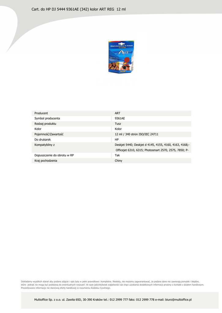 Cart. do HP DJ 5444 9361AE (342) kolor ART REG 12 ml Producent ART Symbol producenta 9361AE Rodzaj produktu Tusz Kolor Kolor Pojemność/Zawartość 12 ml / 340 stron ISO/IEC 24711 Do drukarek HP Kompatybilny z Deskjet 5440; Deskjet d 4145, 4155, 4160, 4163, 4168;Officejet 6310, 6315; Photosmart 2570, 2575, 7850; P- Dopuszczenie do obrotu w RP Tak Kraj pochodzenia Chiny Dokładamy wszelkich starań aby podane zdjęcie i opis były w pełni prawidłowe i kompletne. Niestety, nie możemy zagwarantować, że podane dane nie zawierają pomyłek i błędów, które jednak nie mogą być podstawą do ewentualnych roszczeń. W razie jakichkolwiek wątpliwości lub chęci uzyskania dodatkowych informacji prosimy o kontakt z działem handlowym. Prezentowane informacje nie stanowią oferty handlowej w rozumieniu Kodeksu Cywilnego. Multioffice Sp. z o.o. ul. Zawiła 65D, 30-390 Kraków tel.: 012 2999 777 faks: 012 2999 778 e-mail: [email protected]
