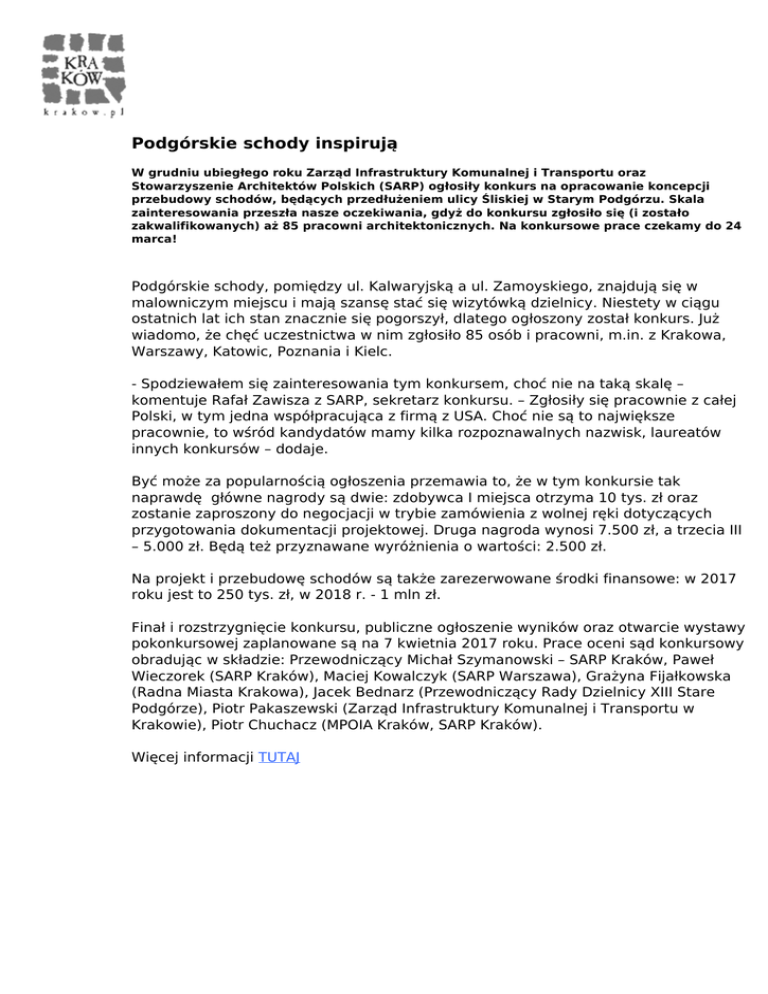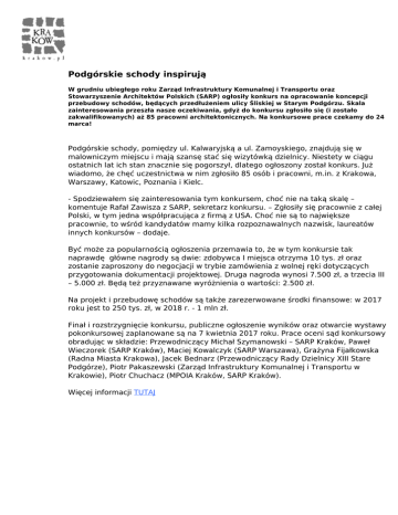 Podgórskie schody inspirują W grudniu ubiegłego roku Zarząd Infrastruktury Komunalnej i Transportu oraz Stowarzyszenie Architektów Polskich (SARP) ogłosiły konkurs na opracowanie koncepcji przebudowy schodów, będących przedłużeniem ulicy Śliskiej w Starym Podgórzu. Skala zainteresowania przeszła nasze oczekiwania, gdyż do konkursu zgłosiło się (i zostało zakwalifikowanych) aż 85 pracowni architektonicznych. Na konkursowe prace czekamy do 24 marca! Podgórskie schody, pomiędzy ul. Kalwaryjską a ul. Zamoyskiego, znajdują się w malowniczym miejscu i mają szansę stać się wizytówką dzielnicy. Niestety w ciągu ostatnich lat ich stan znacznie się pogorszył, dlatego ogłoszony został konkurs. Już wiadomo, że chęć uczestnictwa w nim zgłosiło 85 osób i pracowni, m.in. z Krakowa, Warszawy, Katowic, Poznania i Kielc. - Spodziewałem się zainteresowania tym konkursem, choć nie na taką skalę – komentuje Rafał Zawisza z SARP, sekretarz konkursu. – Zgłosiły się pracownie z całej Polski, w tym jedna współpracująca z firmą z USA. Choć nie są to największe pracownie, to wśród kandydatów mamy kilka rozpoznawalnych nazwisk, laureatów innych konkursów – dodaje. Być może za popularnością ogłoszenia przemawia to, że w tym konkursie tak naprawdę główne nagrody są dwie: zdobywca I miejsca otrzyma 10 tys. zł oraz zostanie zaproszony do negocjacji w trybie zamówienia z wolnej ręki dotyczących przygotowania dokumentacji projektowej. Druga nagroda wynosi 7.500 zł, a trzecia III – 5.000 zł. Będą też przyznawane wyróżnienia o wartości: 2.500 zł. Na projekt i przebudowę schodów są także zarezerwowane środki finansowe: w 2017 roku jest to 250 tys. zł, w 2018 r. - 1 mln zł. Finał i rozstrzygnięcie konkursu, publiczne ogłoszenie wyników oraz otwarcie wystawy pokonkursowej zaplanowane są na 7 kwietnia 2017 roku. Prace oceni sąd konkursowy obradując w składzie: Przewodniczący Michał Szymanowski – SARP Kraków, Paweł Wieczorek (SARP Kraków), Maciej Kowalczyk (SARP Warszawa), Grażyna Fijałkowska (Radna Miasta Krakowa), Jacek Bednarz (Przewodniczący Rady Dzielnicy XIII Stare Podgórze), Piotr Pakaszewski (Zarząd Infrastruktury Komunalnej i Transportu w Krakowie), Piotr Chuchacz (MPOIA Kraków, SARP Kraków). Więcej informacji TUTAJ Powered by TCPDF (www.tcpdf.org)