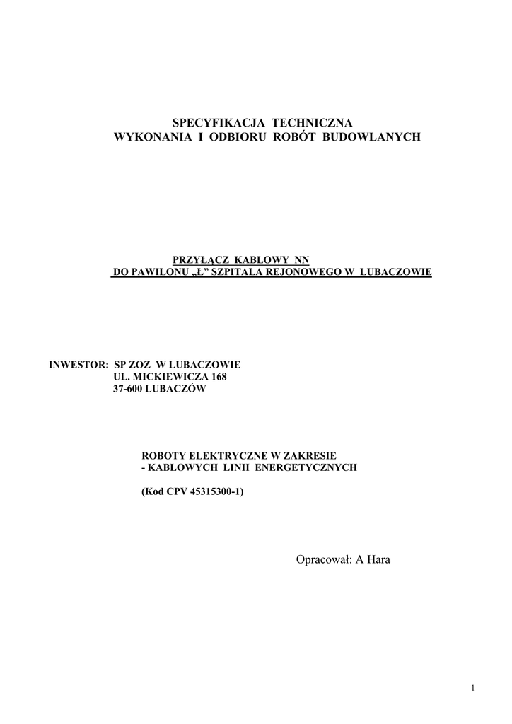 SPECYFIKACJA TECHNICZNA WYKONANIA I ODBIORU ROBÓT BUDOWLANYCH PRZYŁĄCZ KABLOWY NN DO PAWILONU „Ł” SZPITALA REJONOWEGO W LUBACZOWIE INWESTOR: SP ZOZ W LUBACZOWIE UL. MICKIEWICZA 168 37-600 LUBACZÓW ROBOTY ELEKTRYCZNE W ZAKRESIE - KABLOWYCH LINII ENERGETYCZNYCH (Kod CPV 45315300-1) Opracował: A Hara 1 SPIS TREŚCI 1. CZĘŚĆ OGÓLNA 1.1. Nazwa nadana zamówieniu przez zamawiającego 1.2. Przedmiot ST 1.3. Zakres stosowania ST 1.4. Przedmiot i zakres robót objętych ST 1.5. Określenia podstawowe, definicje 1.6. Ogólne wymagania dotyczące robót 1.7. Dokumentacja robót montażowych i prefabrykacyjnych 1.8. Nazwy i kody 2. WYMAGANIA DOTYCZĄCE WŁAŚCIWOŚCI MATERIAŁÓW 3. WYMAGANIA DOTYCZĄCE SPRZĘTU, MASZYN I NARZĘDZI 4. WYMAGANIA DOTYCZĄCE TRANSPORTU 5. WYMAGANIA DOTYCZĄCE WYKONANIA ROBÓT 6. KONTROLA JAKOŚCI ROBÓT 7. WYMAGANIA DOTYCZĄCE PRZEDMIARU I OBMIARU ROBÓT 8. SPOSÓB ODBIORU ROBÓT 9. PODSTAWA ROZLICZENIA ROBÓT 10. DOKUMENTY ODNIESIENIA 2 1. CZĘŚĆ OGÓLNA. 1.1. Nazwa nadana zamówieniu przez zamawiającego. Przyłącz kablowy do Pawilonu „Ł” Rejonowego Szpitala w Lubaczowie –Linia kablowa 0,4kV. 1.2. Przedmiot ST Przedmiotem niniejszej Specyfikacji Technicznej są wymagania dotyczące wykonania i odbioru robót związanych z budową linii kablowej 0,4kV. 1. 3. Zakres stosowania ST ST jest stosowana jako dokument przetargowy i kontraktowy przy zlecaniu i realizacji robót wymienionych pkt. 1.1. 1. 4. Zakres robót objętych ST Roboty, których dotyczy Specyfikacja obejmują wszystkie czynności umożliwiające i mające na celu wykonanie budowy linii kablowej 0,4kV do pawilonu ”Ł”. 1. 5. Określenia podstawowe Określenia podane w ST są zgodne z odpowiednimi normami i określeniami podanymi w ST „Wymagania ogólne” kod CPV 45000000-7 a także podanymi niżej. 1. 5.1 Linia kablowa - kabel wielożyłowy lub wiązka kabli jednożyłowych w układzie wielofazowym albo kilka kabli jedno lub wielożyłowych połączonych równolegle łącznie z osprzętem, ułożone na wspólnej trasie i łączące zaciski tych samych dwóch urządzeń elektrycznych jedno lub wielofazowych 1. 5.2 Trasa kablowa - pas terenu w którym ułożone są jedna lub więcej linii kablowych. 1.5.3 Napięcie znamionowe linii - napięcie międzyprzewodowe na które linia kablowa została zbudowana 1. 5.4 Osprzęt linii kablowej - zbiór elementów przeznaczonych do łączenia, rozgałęzienia lub zakończenia kabli. 1. 5.5 Osłona kabla - konstrukcja przeznaczona do ochrony kabla przed uszkodzeniami mechanicznymi, chemicznymi i działaniem łuku elektrycznego. 1. 5.6 Przykrycie - osłona ułożona nad kablem w celu ochrony przed mechanicznym uszkodzeniem od góry. 1.5.7 Zbliżenie - takie miejsce na trasie linii kablowej, w którym odległość między linią kablową, urządzeniem podziemnym lub drogą komunikacyjną itp. jest mniejsza niż odległość dopuszczalna dla danych warunków układania bez stosowania przegród lub 3 osłon zabezpieczających i w którym nie występuje skrzyżowanie. 1.5.8 Przepust kablowy - konstrukcja o przekroju najczęściej okrągłym przeznaczona do ochrony kabla przed uszkodzeniami mechanicznymi, chemicznymi i działaniem łuku elektrycznego 1.5.9 Dodatkowa ochrona przeciwporażeniowa - ochrona części przewodzących, dostępnych w wypadku pojawienia się na nich napięcia w warunkach zakłóceniowych. 1.6 Ogólne wymagania dotyczące robót. Wykonawca robót jest odpowiedzialny za jakość ich wykonania oraz za zgodność z Dokumentacją Projektową, Specyfikacją Techniczną i poleceniami Inspektora nadzoru Ogólne wymagania dotyczące robót podano w ST „Wymagania ogólne” kod CPV 45000000-7. 1.7 Dokumentacja robót montażowych i prefabrykacyjnych. Dokumentację robót montażowych linii kablowej stanowią - projekt budowlany i wykonawczy w zakresie wynikającym z rozporządzenia Ministra Infrastruktury z 02.09.2004 r. w sprawie szczegółowego zakresu i formy dokumentacji projektowej, specyfikacji technicznych wykonania i odbioru robót budowlanych oraz programu funkcjonalno-użytkowego (Dz. U. z 2004 r. Nr 202, poz. 2072 ze zmianami Dz. U. z 2005 r. Nr 75, poz. 664), - specyfikacje techniczne wykonania i odbioru robót (obligatoryjne w przypadku zamówień publicznych), sporządzone zgodnie z rozporządzeniem Ministra Infrastruktury z dnia 02.09.2004 r. w sprawie szczegółowego zakresu i formy dokumentacji projektowej, specyfikacji technicznych wykonania i odbioru robót budowlanych oraz programu funkcjonalno-użytkowego (Dz. U. z 2004 r. Nr 202, poz. 2072 zmian Dz. U. z 2005 r. Nr 75, poz. 664), - dziennik budowy prowadzony zgodnie z rozporządzeniem Ministra Infrastruktury z dnia 26 czerwca 2002 r. w sprawie dziennika budowy, montażu i rozbiórki, tablicy informacyjnej oraz ogłoszenia zawierającego dane dotyczące bezpieczeństwa pracy i ochrony zdrowia (Dz. U. z 2002 r. Nr 108, poz. 953 z późniejszymi zmianami), - dokumenty świadczące o dopuszczeniu do obrotu i powszechnego lub jednostkowego zastosowania użytych wyrobów budowlanych, zgodnie z ustawą z 16 kwietnia 2004 r. o wyrobach 4 budowlanych (Dz. U. z 2004 r. Nr 92, poz. 881), karty techniczne wyrobów lub zalecenia producentów dotyczące stosowania wyrobów, protokoły odbiorów częściowych, końcowych oraz robót zanikających i ulegających zakryciu z załączonymi protokołami z badań kontrolnych, - dokumentacja powykonawcza (zgodnie z art. 3, pkt 14 ustawy Prawo budowlane z dnia 7 lipca 1994 r. - Dz. U. z 2003 r. Nr 207, poz. 2016 z późniejszymi zmianami). Montaż elementów instalacji linii energetycznych należy wykonywać na podstawie dokumentacji projektowej i szczegółowej specyfikacji technicznej wykonania i odbioru robót montażowych i instalacyjnych, opracowanych dla konkretnego przedmiotu zamówienia. 1.8 Nazwa i kody . Kod 45231400-9 roboty w zakresie linii kablowych Kod 45315300-1 roboty w zakresie linii energetycznych 2. MATERIAŁY 2.