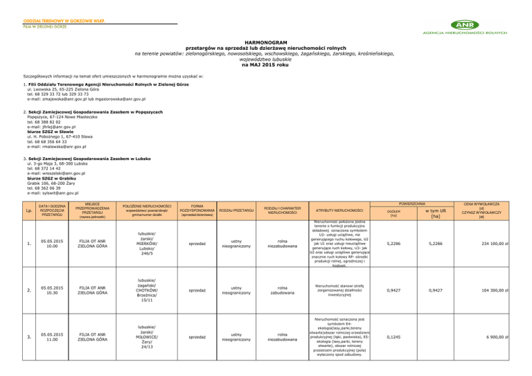 ODDZIAŁ TERENOWY W GORZOWIE WLKP. FILIA W ZIELONEJ GÓRZE HARMONOGRAM przetargów na sprzedaż lub dzierżawę nieruchomości rolnych na terenie powiatów: zielonogórskiego, nowosolskiego, wschowskiego, żagańskiego, żarskiego, krośnieńskiego, województwo lubuskie na MAJ 2015 roku Szczegółowych informacji na temat ofert umieszczonych w harmonogramie można uzyskać w: 1. Filii Oddziału Terenowego Agencji Nieruchomości Rolnych w Zielonej Górze ul. Lwowska 25, 65-225 Zielona Góra tel. 68 329 33 72 lub 329 33 73 e-mail: [email protected] lub [email protected] 2. Sekcji Zamiejscowej Gospodarowania Zasobem w Popęszycach Popęszyce, 67-124 Nowe Miasteczko tel. 68 388 82 02 e-mail: [email protected] biurze SZGZ w Sławie ul. H. Pobożnego 1, 67-410 Sława tel. 68 68 356 64 33 e-mail: [email protected] 3. Sekcji Zamiejscowej Gospodarowania Zasobem w Lubsko ul. 3-go Maja 3, 68-300 Lubsko tel. 68 372 14 42 e-mail: [email protected] biurze SZGZ w Grabiku Grabik 106, 68-200 Żary tel. 68 362 06 39 e-mail: [email protected] Lp. DATA I GODZINA ROZPOCZĘCIA PRZETARGU MIEJSCE PRZEPROWADZENIA PRZETARGU (nazwa jednostki) POŁOŻENIE NIERUCHOMOŚCI województwo/ powiat/obręb/ gmina/numer działki FORMA ROZDYSPONOWANIA (sprzedaż/dzierżawa) POWIERZCHNIA RODZAJ PRZETARGU RODZAJ I CHARAKTER NIERUCHOMOŚCI ATRYBUTY NIERUCHOMOŚCI w tym UR [ha] 5,2286 5,2286 234 100,00 zł 0,9427 104 300,00 zł 1. 05.05.2015 10.00 FILIA OT ANR ZIELONA GÓRA lubuskie/ żarski/ MIERKÓW/ Lubsko/ 246/5 sprzedaż ustny nieograniczony rolna niezabudowana Nieruchomość położona jestna terenie o fumkcji produkcyjno składowej oznaczona symbolem U2- usługi uciążliwe, nie generującego ruchu kołowego, U2 jak U1 oraz usługi nieuciążliwe generujące ruch kołowy, U3- jak U2 oraz usługi uciążliwe generujące znacznie ruch kołowy RP- ośrodki produkcji rolnej, ogrodniczej i hodowli. 2. 05.05.2015 10.30 FILIA OT ANR ZIELONA GÓRA lubuskie/ żagański/ CHOTKÓW/ Brzeźnica/ 15/11 sprzedaż ustny nieograniczony rolna zabudowana Nieruchomość stanowi strefę zorganizowanej działlności inwestycyjnej 0,9427 rolna niezabudowana Nieruchomość oznaczona jest symbolem E4ekologia(lasy,parki,tereny otwarte)obszar rolniczej orzestzreni produkcyjnej (łąki, pastwiska), E5ekologia (lasy,parki, tereny otwarte), obszar rolniczej przestrzeni produkcyjnej (pola) wyłaczony spod zabudowy. 0,1245 3. 05.05.2015 11.00 FILIA OT ANR ZIELONA GÓRA lubuskie/ żarski/ MIŁOWICE/ Żary/ 24/13 sprzedaż ustny nieograniczony CENA WYWOŁAWCZA [zł] CZYNSZ WYWOŁAWCZY [dt] OGÓŁEM [ha] 6 900,00 zł sprzedaż ustny nieograniczony rolna niezabudowana Nieruchomość oznaczona jest symbolem E4,E5- Ekologia : obszar rolnicej p-rzestrzeni produkcyjnej (łąki,pola i pastwiska) wyłączony z zabudowy. Położona jet w obszarze parku krajobrazowego"Łuk Murzakowa" lubuskie/ żarski/ SIEMIRADZ/ Trzebiel/ 3 sprzedaż ustny nieograniczony rolna niezabudowana Nieruchomość oznaczona jest symbolem E4,,E5- ekologia; obszar rolniczej przestrzeni produkcyjnej (łąki, pastwiska pola) wyłaczony z zabudowy. 5,2286 5,2286 71 100,00 zł FILIA OT ANR ZIELONA GÓRA lubuskie/ zielonogórskii/ PIERZWIN/ Nowogród Bobrzański/ 41/15 sprzedaż ustny nieograniczony rolna niezabudowana Nieruchomość stanowi strefę osadniczo- rolną (obszar wiejski) 3,8462 3,6462 80 500,00 zł SZGZ w POPĘSZYCACH lubuskie/ nowosolski/ POPĘSZYCE/ Nowe Miasteczko/ 184 sprzedaż ustny nieograniczony rolna niezabudowana 0,8800 0,8800 15 000,00 zł SZGZ w POPĘSZYCACH lubuskie/ nowosolski/ GOŁASZYN/ Nowe Miasteczko/ 14, 15 sprzedaż ustny nieograniczony rolna niezabudowana 1,2000 1,2000 19 600,00 zł 9. 05.05.2015 10.00 SZGZ w POPĘSZYCACH lubuskie/ nowosolski/ RADWANÓW/ Kożuchów/ 280 sprzedaż ustny nieograniczony rolna niezabudowana 2,3100 2,3100 41 900,00 zł 10. 05.05.2015 10.00 SZGZ w LUBSKU biuro w Grabiku lubuskie/ żarski/ ŁAZ/ Żary dz.171/3 sprzedaż ustny nieograniczony rolna niezabudowana nieruchomość rolna, na której nie planuje się żadnych zmian inwestycyjnych 0,0300 0,0300 4 610,00 zł 11. 05.05.2015 10.30 SZGZ w LUBSKU biuro w Grabiku lubuskie/ żarski/ LIPINKI ŁUŻYCKIE/ Lipinki Łużyckie dz. 184/2 sprzedaż ustny nieograniczony rolna niezabudowana nieruchomość rolna, na której nie planuje się żadnych zmian inwestycyjnych 0,3000 0,3000 7 500,00 zł 4. 05.05.2015 12.00 FILIA OT ANR ZIELONA GÓRA lubuskie/ żarski/ MIESZKÓW / Trzebiel/ 13/12 5. 05.05.2015 12.30 FILIA OT ANR ZIELONA GÓRA 6. 05.05.2015 13.00 7. 05.05.2015 8.30 8. 05.05.2015 9.00 1,6300 1,4800 45 500,00 zł 12. 05.05.2015 11.00 SZGZ w LUBSKU biuro w Grabiku lubuskie/ żarski / ŁUKÓW/ Trzebiel dz. 102, 105, 111, 112, 114, 115/1, 119, 122/1, 124/1 13. 05.05.2015 11.30 SZGZ w LUBSKU biuro w Grabiku lubuskie/ żarski/ BIENIÓW/ Żary dz. 55/7, 55/3 sprzedaż ustny nieograniczony rolna niezabudowana nieruchomość rolna, na której nie planuje się żadnych zmian inwestycyjnych 5,8900 5,8900 89 900,00 zł 14. 05.05.2015 12.00 SZGZ w LUBSKU biuro w Grabiku lubuskie/ żarski/ BORUSZYN/ Lipinki Łużyckie dz.145/12 sprzedaż ustny nieograniczony rolna niezabudowana nieruchomość rolna, na której nie planuje się żadnych zmian inwestycyjnych 5,1000 5,1000 101 600,00 zł 15. 05.05.2015 12.30 SZGZ w LUBSKU biuro w Grabiku lubuskie/ żarski/MIELNO/ Przewóz dz. 158/7, 158/8 sprzedaż ustny nieograniczony rolna niezabudowana nieruchomość rolna, na której nie planuje się żadnych zmian inwestycyjnych 6,4300 6,4300 146 900,00 zł 16. 05.05.2015 13.00 SZGZ w LUBSKU biuro w Grabiku lubuskie/ żarski/ ŁUKÓW/ Trzebiel dz. 40/1, 40/2, 42 sprzedaż ustny nieograniczony rolna niezabudowana nieruchomość rolna, na której nie planuje się żadnych zmian inwestycyjnych 2,3200 2,3200 43 040,00 zł 17. 05.05.2015 13.30 SZGZ w LUBSKU biuro w Grabiku lubuskie/ żarski/ Straszów/ Przewóz dz. 254/2 sprzedaż ustny nieograniczony rolna niezabudowana nieruchomość rolna, na której nie planuje się ża