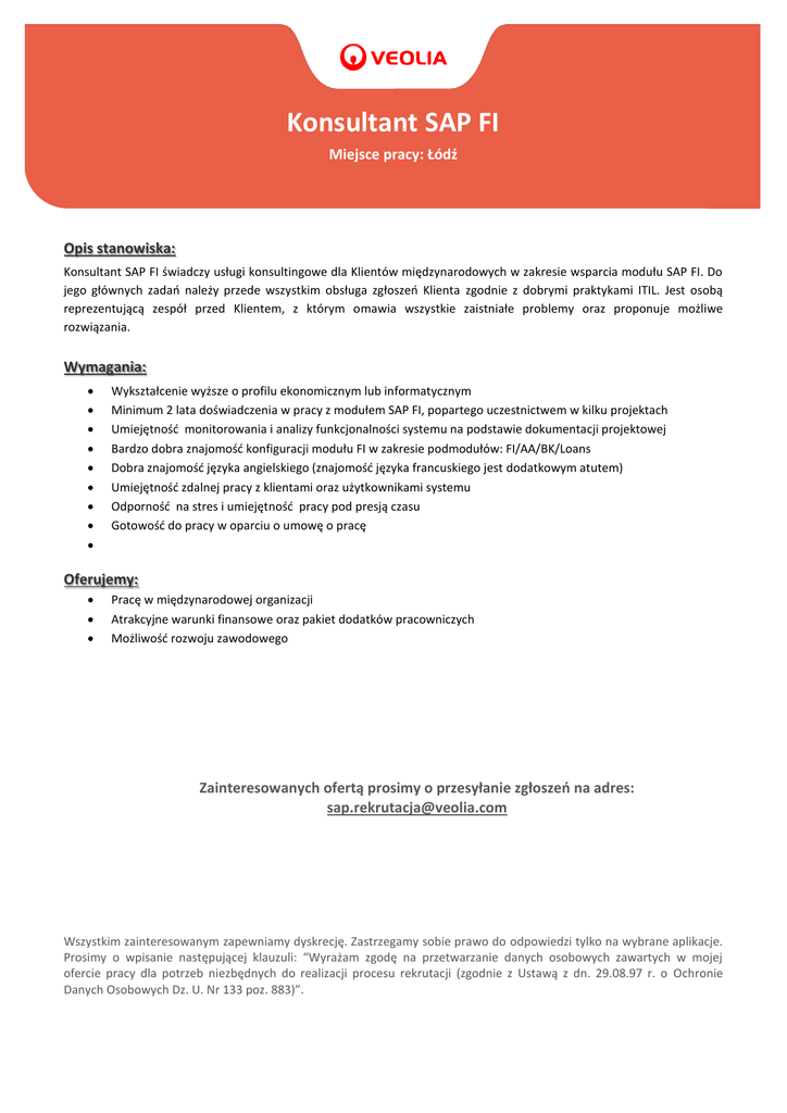 Konsultant SAP FI Miejsce pracy: Łódź Opis stanowiska: Konsultant SAP FI świadczy usługi konsultingowe dla Klientów międzynarodowych w zakresie wsparcia modułu SAP FI. Do jego głównych zadań należy przede wszystkim obsługa zgłoszeń Klienta zgodnie z dobrymi praktykami ITIL. Jest osobą reprezentującą zespół przed Klientem, z którym omawia wszystkie zaistniałe problemy oraz proponuje możliwe rozwiązania. Wymagania: Wykształcenie wyższe o profilu ekonomicznym lub informatycznym Minimum 2 lata doświadczenia w pracy z modułem SAP FI, popartego uczestnictwem w kilku projektach Umiejętność monitorowania i analizy funkcjonalności systemu na podstawie dokumentacji projektowej Bardzo dobra znajomość konfiguracji modułu FI w zakresie podmodułów: FI/AA/BK/Loans Dobra znajomość języka angielskiego (znajomość języka francuskiego jest dodatkowym atutem) Umiejętność zdalnej pracy z klientami oraz użytkownikami systemu Odporność na stres i umiejętność pracy pod presją czasu Gotowość do pracy w oparciu o umowę o pracę Oferujemy: Pracę w międzynarodowej organizacji Atrakcyjne warunki finansowe oraz pakiet dodatków pracowniczych Możliwość rozwoju zawodowego Zainteresowanych ofertą prosimy o przesyłanie zgłoszeń na adres: [email protected] Wszystkim zainteresowanym zapewniamy dyskrecję. Zastrzegamy sobie prawo do odpowiedzi tylko na wybrane aplikacje. Prosimy o wpisanie następującej klauzuli: “Wyrażam zgodę na przetwarzanie danych osobowych zawartych w mojej ofercie pracy dla potrzeb niezbędnych do realizacji procesu rekrutacji (zgodnie z Ustawą z dn. 29.08.97 r. o Ochronie Danych Osobowych Dz. U. Nr 133 poz. 883)”.