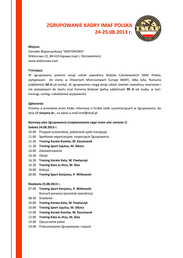 ZGRUPOWANIE KADRY IMAF POLSKA 24-25.08.2013 r. Miejsce: Ośrodek Wypoczynkowy "WIKTOROWO" Wiktorowo 22, 88-410 Gąsawa (nad J. Ostrowieckim) www.wiktorowo.com Trenujący: W zgrupowaniu powinni wziąć udział zawodnicy Klubów Członkowskich IMAF Polska, wytypowani do startu w Otwartych Mistrzostwach Europy IMAFE, Alba Iulia, Rumunia (odpłatność 60 zł od osoby). W zgrupowaniu mogą wziąć udział również zawodnicy rezerwowi i nie wytypowani do startu oraz trenerzy klubowi (pełna odpłatność 90 zł od osoby, w tym: treningi, nocleg i całodzienne wyżywienie). Zgłoszenia: Prosimy o przesłanie przez Kluby informacji o liczbie osób uczestniczących w Zgrupowaniu, do dnia 17 sierpnia br., na adres e-mail [email protected]. Ramowy plan Zgrupowania (rozplanowanie zajęć może ulec zmianie !): Sobota 24.08.2013 r. 10.00 Przyjazd uczestników, pobieranie opłat (recepcja) 11.00 Spotkanie organizacyjne, rozpoczęcie Zgrupowania 11.30 Trening Karate Kumite, M. Kaczmarek 11.30 Trening Sport Jujutsu, M. Sikora 14.00 Zakwaterowanie 14.30 Obiad 16.30 Trening Karate Kata, M. Pawlaczyk 16.30 Trening Kata Ju Jitsu, M. Glaz 19.00 Kolacja 20.00 Trening Sport Kenjutsu, P. Witkowski Niedziela 25.08.2013 r. 07.00 Trening Sport Kenjutsu, P. Witkowski Rozruch poranny (pozostali zawodnicy) 08.30 Śniadanie 10.00 Trening Karate Kata, M. Pawlaczyk 10.00 Trening Sport Jujutsu, M. Sikora 12.00 Trening Karate Kumite, M. Kaczmarek 12.00 Trening Kata Ju Jitsu, M. Glaz 14.00 Opuszczenie pokoi 14.00 Podsumowanie Zgrupowania i wyjazd Sprawy organizacyjne: Ze względu na obłożenie Ośrodka w okresie wakacyjnym doba hotelowa ustalona została na godz. 14.00 – 14.00 dnia następnego. Dlatego też zakwaterowanie nastąpi dopiero po pierwszym treningu, natomiast pokoje powinny zostać opuszczone bezwzględnie do godz. 14.00 w niedzielę. Podczas Zgrupowania będzie możliwe zakupienie emblematu IMAF Polska oraz zamówienie legitymacji Budo Pass IMAF Europe. Osoby zamawiające Budo Pass powinny dostarczyć zdjęcie legitymacyjne. Podczas Zgrupowania będzie możliwe dokonanie nostryfikacji stopnia kyu karate / ju jitsu, uzyskanego poza IMAF Polska (po przedstawieniu oryginału lub kserokopii dyplomu poświadczającego posiadany stopień). Uczestnicy Zgrupowania powinni posiadać kompletne wyposażenie, właściwe dla danej konkurencji (komplet ochraniaczy w kumite i sport jujutsu, atrapy broni w kata ju jitsu, w miarę możliwości kaski i miecze piankowe w sport kenjutsu). Zgodnie z ustaleniami zawartymi we wcześniejszym Informatorze (w formie przypomnienia, Informator w załączeniu), wraz ze zgłoszeniem liczby osób biorących udział w Zgrupowaniu prosimy o podanie nazw kata, jakie przygotowują zawodnicy startujący w konkurencji Karate Kata (mając przy tym na uwadze podział dla poszczególnych stopni kyu / dan, narzucony przez IMAFE). Kontakt z Organizatorem: Shihan Piotr Witkowski, tel. 608 728 982, e-mail: [email protected]