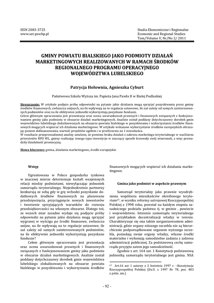 ISSN 2083-3725 www.ser.pswbp.pl Studia Ekonomiczne i Regionalne Economic and Regional Studies Tom/Volume V, Nr/No 2/ 2011 GMINY POWIATU BIALSKIEGO JAKO PODMIOTY DZIAŁAŃ MARKETINGOWYCH REALIZOWANYCH W RAMACH ŚRODKÓW REGIONALNEGO PROGRAMU OPERACYJNEGO WOJEWÓDZTWA LUBELSKIEGO Patrycja Hołownia, Agnieszka Cyburt Państwowa Szkoła Wyższa im. Papieża Jana Pawła II w Białej Podlaskiej Streszczenie: W artykule podjęto próbę odpowiedzi na pytanie jakie działania mogą sprzyjać pozyskiwaniu przez gminy środków finansowych, zwłaszcza unijnych, na ile wpływają na to regulacje ustawowe, ile zaś zależy od samych zainteresowanych podmiotów oraz na ile efektywnie jednostki wykorzystują pozyskane fundusze. Celem głównym opracowania jest prezentacja oraz ocena uwarunkowań prawnych i finansowych związanych z funkcjonowaniem gminy jako podmiotu w obszarze działań marketingowych. Analizie został poddany dotychczasowy dorobek gmin województwa lubelskiego zlokalizowanych na obszarze powiatu bialskiego w pozyskiwaniu i wykorzystaniu środków finansowych mogących wspierać ich działania marketingowe. W artykule wskazano wykorzystanie środków europejskich obrazując poziom dofinansowania, wartość projektów ogółem i w przeliczeniu na 1 mieszkańca. W rezultacie przeprowadzonej analizy ustalono, że pomimo braku działań z zakresu marketingu terytorialnego w wachlarzu priorytetów RPO WL, gminy realizując innego typu inwestycje w znaczący sposób kreowały swój wizerunek, a więc prowadziły działalność promocyjną. Słowa kluczowe: gmina, działania marketingowe, środki europejskie Wstęp finansowych mogących wspierać ich działania marketingowe. Ugruntowana w Polsce gospodarka rynkowa w znacznej mierze determinuje kształt wzajemnych relacji miedzy podmiotami, niewyłączając jednostek samorządu terytorialnego. Niejednokrotnie partnerzy konkurują ze sobą gdy w grę wchodzi pozyskanie dodatkowych środków finansowych na planowane przedsięwzięcia, przyciągnięcie nowych inwestorów i tworzenie sprzyjających warunków do rozwoju przedsiębiorczości na własnym obszarze. Dlatego też, ze wszech miar zasadne wydaje się podjęcie próby odpowiedzi na pytanie jakie działania mogą sprzyjać wygranej w wyścigu po środki finansowe, zwłaszcza unijne, na ile wpływają na to regulacje ustawowe, ile zaś zależy od samych zainteresowanych podmiotów, na ile efektywnie jednostki wykorzystują pozyskane fundusze? Celem głównym opracowania jest prezentacja oraz ocena uwarunkowań prawnych i finansowych związanych z funkcjonowaniem gminy jako podmiotu w obszarze działań marketingowych. Analizie został poddany dotychczasowy dorobek gmin województwa lubelskiego zlokalizowanych na obszarze powiatu bialskiego w pozyskiwaniu i wykorzystaniu środków Gmina jako podmiot w aspekcie prawnym Samorząd terytorialny jako prawnie wyodrębniona wspólnota mieszkańców określonego terytorium67, w wyniku reformy ustrojowej Rzeczypospolitej Polskiej z 1998 roku, powstał na każdym stopniu zasadniczego podziału państwa tj. w gminie , powiecie i województwie. Istnienie samorządu terytorialnego jest przykładem decentralizacji władzy w terenie. Charakteryzuje się ona takim zorganizowaniem administracji, gdzie organy niższego szczebla nie są hierarchicznie podporządkowane organom wyższego szczebla, posiadają swoje organy władzy, własne środki materialne i wykonują samodzielne zadania z zakresu administracji publicznej. Za podstawową cechę samorządu przyjęto zatem jego samodzielność. Zgodnie z art. 164 ust. 1 Konstytucji podstawową jednostką samorządu terytorialnego jest gmina. NSA Art.16 ust 1 ustawy z 2 kwietnia 1997 r. –Konstytucja Rzeczypospolitej Polskiej (Dz.U. z 1997 Nr 78, poz. 483 z późn. zm.) 67 - 92 - Studia Ekonomiczne i Regionalne Nr 2 (V) 2011 określił iż, istota samodzielności gminy wyraża się w tym, że w granicach wynikających z ustaw nie jest ona podporządkowana czyjejkolwiek woli oraz że w tych sprawach podejmuje czynności prawne i faktyczne, kierując się wyłącznie własną wolą wyrażoną przez jej organy pochodzące z wyboru. Konkludując samodzielność ta wynika z granic ustawowych, precyzujących jej zakres przedmiotowy68. Ustawa o samorządzie gminnym69 przyznaje gminie, odrębną od państwa, osobowość prawną podlegającą ochronie sądowej. To upodmiotowienie pozwala wykonywać gminie zadania publiczne w imieniu własnym i na własną odpowiedzialność. Samodzielność tej jednostki samorządowej przejawia się tu w dwóch aspektach: publicznoprawnym oraz prywatnoprawnym. Pierwszy aspekt wiąże się z tym, iż do zakresu działania gminy należą wszystkie sprawy publiczne o znaczeniu lokalnym, czyli służące zbiorowości lokalnej, zaś w drugim przypadku gmina może być również podmiotem prawa prywatnego, a zatem być uczestnikiem obrotu gospodarczego (Dolnicki 2009). Gmina wykonuje zarówno zadania własne jak i zlecone, przy czym zadania własne realizowane są z własnych środków, a w ich ramach można wyodrębnić zadania obligatoryjne i fakultatywne. O obowiązkowym charakterze zadań decydują ustawy szczególne, w konsekwencji od ich realizacji gmina nie może się uchylić. Ma to duże znaczenie z uwagi na konieczność zapewnienia pewnego minimum świadczeń społeczności lokalnej, ale jednocześnie oznacza, że pewne zadania ważne z punktu widzenia wspólnoty gminnej mogą nie być realizowane z uwagi na brak funduszy, warunków materialnych czy kadrowych (Leoński 2008). Z tej perspektywy szczególnie istotne wydaje się pozyskiwanie środków z innych źródeł, zwłaszcza z funduszy unijnych. Ustawa o samorządzie gminnym określając zakres zadań gminy posługuje się klauzulą generalną, polegającą na domniemaniu właściwości gminy we wszystkich sprawach o znaczeniu lokalnym, niezastrzeżonych ustawami na rzecz innych podmiotów. Wyliczenie zadań własnych ma tu chara