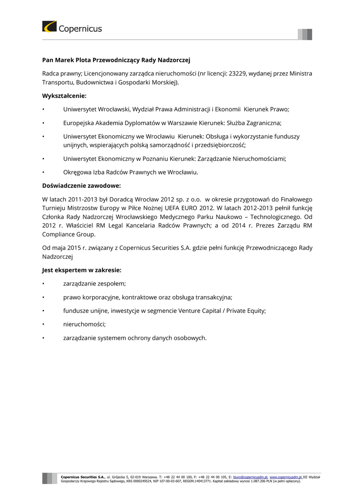 Pan Marek Plota Przewodniczący Rady Nadzorczej Radca prawny; Licencjonowany zarządca nieruchomości (nr licencji: 23229, wydanej przez Ministra Transportu, Budownictwa i Gospodarki Morskiej). Wykształcenie: • Uniwersytet Wrocławski, Wydział Prawa Administracji i Ekonomii Kierunek Prawo; • Europejska Akademia Dyplomatów w Warszawie Kierunek: Służba Zagraniczna; • Uniwersytet Ekonomiczny we Wrocławiu Kierunek: Obsługa i wykorzystanie funduszy unijnych, wspierających polską samorządność i przedsiębiorczość; • Uniwersytet Ekonomiczny w Poznaniu Kierunek: Zarządzanie Nieruchomościami; • Okręgowa Izba Radców Prawnych we Wrocławiu. Doświadczenie zawodowe: W latach 2011-2013 był Doradcą Wrocław 2012 sp. z o.o. w okresie przygotowań do Finałowego Turnieju Mistrzostw Europy w Piłce Nożnej UEFA EURO 2012. W latach 2012-2013 pełnił funkcję Członka Rady Nadzorczej Wrocławskiego Medycznego Parku Naukowo – Technologicznego. Od 2012 r. Właściciel RM Legal Kancelaria Radców Prawnych; a od 2014 r. Prezes Zarządu RM Compliance Group. Od maja 2015 r. związany z Copernicus Securities S.A. gdzie pełni funkcję Przewodniczącego Rady Nadzorczej Jest ekspertem w zakresie: • zarządzanie zespołem; • prawo korporacyjne, kontraktowe oraz obsługa transakcyjna; • fundusze unijne, inwestycje w segmencie Venture Capital / Private Equity; • nieruchomości; • zarządzanie systemem ochrony danych osobowych. Copernicus Securities S.A., ul. Grójecka 5, 02-019 Warszawa. T: +48 22 44 00 100, F: +48 22 44 00 105, E: [email protected], www.copernicusdm.pl XII Wydział Gospodarczy Krajowego Rejestru Sądowego, KRS 0000249524, NIP 107-00-03-607, REGON:140413771. Kapitał zakładowy wynosi 1.087.206 PLN (w pełni opłacony).