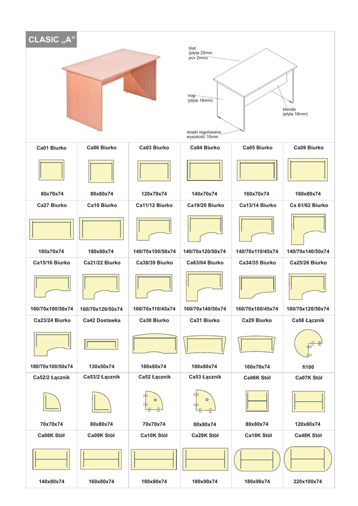 CLASIC „A” blat (płyta 25mm pcv 2mm) nogi (płyta 18mm) blenda (płyta 18mm) stopki regulowane wysokość 10mm Ca01 Biurko Ca06 Biurko Ca03 Biurko Ca04 Biurko Ca05 Biurko Ca09 Biurko 80x70x74 80x80x74 120x70x74 140x70x74 160x70x74 160x80x74 Ca27 Biurko Ca10 Biurko Ca11/12 Biurko Ca19/20 Biurko Ca13/14 Biurko Ca 61/62 Biurko 180x70x74 180x80x74 140/70x100/50x74 140/70x120/50x74 140/70x110/45x74 140/70x140/50x74 Ca15/16 Biurko Ca21/22 Biurko Ca38/39 Biurko Ca63/64 Biurko Ca34/35 Biurko Ca25/26 Biurko 160/70x100/50x74 160/70x120/50x74 160/70x110/45x74 160/70x140/50x74 160/70x100/45x74 180/70x120/50x74 Ca23/24 Biurko Ca42 Dostawka Ca30 Biurko Ca31 Biurko Ca29 Biurko Ca58 Łącznik 180/70x100/50x74 130x50x74 180x80x74 180x80x74 160x70x74 fi100 Ca52/2 Łącznik Ca53/2 Łącznik Ca52 Łącznik Ca53 Łącznik Ca06K Stół Ca07K Stół 70x70x74 80x80x74 70x70x74 80x80x74 80x80x74 120x80x74 Ca08K Stół Ca09K Stół Ca10K Stół Ca28K Stół Ca18K Stół Ca48K Stół 140x80x74 160x80x74 180x80x74 180x90x74 180x90x74 220x100x74 CLASIC „B” blat (płyta 25mm pcv 2mm) nogi (płyta 25mm) blenda (płyta 18mm) stopki regulowane wysokość 10mm Cb01 Biurko Cb06 Biurko Cb03 Biurko Cb04 Biurko Cb05 Biurko Cb09 Biurko 80x70x74 80x80x74 120x70x74 140x70x74 160x70x74 160x80x74 Cb27 Biurko Cb10 Biurko Cb11/12 Biurko Cb19/20 Biurko Cb13/14 Biurko Cb 61/62 Biurko 180x70x74 180x80x74 140/70x100/50x74 140/70x120/50x74 140/70x110/45x74 140/70x140/50x74 Cb15/16 Biurko Cb21/22 Biurko Cb38/39 Biurko Cb63/64 Biurko Cb34/35 Biurko Cb25/26 Biurko 160/70x100/50x74 160/70x120/50x74 160/70x110/45x74 160/70x140/50x74 160/70x100/45x74 180/70x120/50x74 Cb23/24 Biurko Cb42 Dostawka Cb30 Biurko Cb31 Biurko Cb29 Biurko Cb58 Łącznik 180/70x100/50x74 130x50x74 180x80x74 180x80x74 160x70x74 fi100 Cb52/2 Łącznik Cb53/2 Łącznik Cb52 Łącznik Cb53 Łącznik Cb06K Stół Cb07K Stół 70x70x74 80x80x74 70x70x74 80x80x74 80x80x74 120x80x74 Cb08K Stół Cb09K Stół Cb10K Stół Cb28K Stół Cb18K Stół Cb48K Stół 140x80x74 160x80x74 180x80x74 180x90x74 180x90x74 220x100x74 CLASIC „D” blat (płyta 36mm pcv 2mm) nogi (płyta 36mm) blenda (płyta 18mm) stopki regulowane wysokość 10mm Cd01 Biurko Cd06 Biurko Cd03 Biurko Cd04 Biurko Cd05 Biurko Cd09 Biurko 80x70x74 80x80x74 120x70x74 140x70x74 160x70x74 160x80x74 Cd27 Biurko Cd10 Biurko Cd11/12 Biurko Cd19/20 Biurko Cd13/14 Biurko Cd 61/62 Biurko 180x70x74 180x80x74 140/70x100/50x74 140/70x120/50x74 140/70x110/45x74 140/70x140/50x74 Cd15/16 Biurko Cd21/22 Biurko Cd38/39 Biurko Cd63/64 Biurko Cd34/35 Biurko Cd25/26 Biurko 160/70x100/50x74 160/70x120/50x74 160/70x110/45x74 160/70x140/50x74 160/70x100/45x74 180/70x120/50x74 Cd23/24 Biurko Cd42 Dostawka Cd30 Biurko Cd31 Biurko Cd29 Biurko Cd58 Łącznik 180/70x100/50x74 130x50x74 180x80x74 180x80x74 160x70x74 fi100 Cd52/2 Łącznik Cd53/2 Łącznik Cd52 Łącznik Cd53 Łącznik Cd06K Stół Cd07K Stół 70x70x74 80x80x74 70x70x74 80x80x74 80x80x74 120x80x74 Cd08K Stół Cd09K Stół Cd10K Stół Cd28K Stół Cd18K Stół Cd48K Stół 140x80x74 160x80x74 180x80x74 180x90x74 180x90x74 220x100x74 CLASIC „E” blat (płyta 25mm pcv 2mm) dystans aluminowy (przekrój 25x25) nogi (płyta 25mm) blenda (płyta 18mm) stopki regulowane wysokość 10mm Ce01 Biurko Ce06 Biurko Ce03 Biurko Ce04 Biurko Ce05 Biurko Ce09 Biurko 80x70x74 80x80x74 120x70x74 140x70x74 160x70x74 160x80x74 Ce27 Biurko Ce10 Biurko Ce11/12 Biurko Ce19/20 Biurko Ce13/14 Biurko Ce 61/62 Biurko 180x70x74 180x80x74 140/70x100/50x74 140/70x120/50x74 140/70x110/45x74 140/70x140/50x74 Ce15/16 Biurko Ce21/22 Biurko Ce38/39 Biurko Ce63/64 Biurko Ce34/35 Biurko Ce25/26 Biurko 160/70x100/50x74 160/70x120/50x74 160/70x110/45x74 160/70x140/50x74 160/70x100/45x74 180/70x120/50x74 Ce23/24 Biurko Ce42 Dostawka Ce30 Biurko Ce31 Biurko Ce29 Biurko Ce58 Łącznik 180/70x100/50x74 130x50x74 180x80x74 180x80x74 160x70x74 fi100 Ce52/2 Łącznik Ce53/2 Łącznik Ce52 Łącznik Ce53 Łącznik Ce06K Stół Ce07K Stół 70x70x74 80x80x74 70x70x74 80x80x74 80x80x74 120x80x74 Ce08K Stół Ce09K Stół Ce10K Stół Ce28K Stół Ce18K Stół Ce48K Stół 140x80x74 160x80x74 180x80x74 180x90x74 180x90x74 220x100x74 FORUM blat typu sandwich (płyta 44mm pcv 2mm) nogi (płyta 36mm) blenda (płyta 18mm) stopki regulowane wysokość 15mm F01 Biurko F06 Biurko F03 Biurko F04 Biurko 80x70x74 80x80x74 120x70x74 140x70x74 160x70x74 F27 Biurko F10 Biurko F11/12 Biurko F19/20 Biurko F13/14 Biurko 180x70x74 F15/16 Biurko 160/70x100/50x74 F23/24 Biurko 180/70x100/50x74 F52/2 Łącznik 180x80x74 F21/22 Biurko 160/70x120/50x74 F42 Dostawka 130x50x74 F53/2 Łącznik 140/70x100/50x74 140/70x120/50x74 F05 Biurko 140/70x110/45x74 F09 Biurko 160x80x74 F61/62 Biurko 140/70x140/50x74 F38/39 Biurko F63/64 Biurko 160/70x110/45x74 160/70x140/50x74 160/70x100/45x74 180/70x120/50x74 F30 Biurko F31 Biurko F29 Biurko F58 Łącznik 180x80x74 180x80x74 160x70x74 fi100 F52 Łącznik F53 Łącznik F06K Stół 80x80x74 F34/35 Biurko F25/26 Biurko F07K Stół 70x70x74 80x80x74 70x70x74 80x80x74 120x80x74 F08K Stół F09K Stół F10K Stół F28K Stół F18K Stół F48K Stół 140x80x74 160x80x74 180x80x74 180x90x74 180x90x74 220x100x74