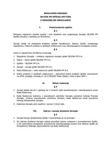 REGULAMIN ZARZĄDU SELENA FM SPÓŁKA AKCYJNA Z SIEDZIBĄ WE WROCŁAWIU I. Postanowienia ogólne §1 Niniejszy regulamin określa zasady i tryb działania oraz organizację Zarządu SELENA FM Spółka Akcyjna z siedzibą we Wrocławiu. §2 Zarząd działa na podstawie Kodeksu Spółek Handlowych, Statutu Spółki, niniejszego regulaminu, Dobrych praktyk w spółkach publicznych oraz obowiązujących przepisów prawa. §3 UŜyte w regulaminie określenia oznaczają: 1. Regulamin Zarządu – niniejszy regulamin zarządu spółki SELENA FM S.A. 2. Statut – statut spółki SELENA FM S.A. 3. Spółka – SELENA FM S.A. 4. Zarząd – zarząd spółki SELENA FM S.A. 5. Rada Nadzorcza – rada nadzorcza spółki SELENA FM S.A. 6. Dobre praktyki w spółkach publicznych – dokument Dobre praktyki spółek notowanych na GPW, przyjęty uchwałą nr 12/1170/2007 Rady Giełdy z dnia 4 lipca 2007 r. II. Skład, kadencja §4 1. Zarząd składa się od 1 (jednej) do 3 (trzech) osób powoływanych i odwoływanych przez Radę Nadzorczą. 2. Rada Nadzorcza jednemu z powołanych członków Zarządu powierza funkcję Prezesa Zarządu. Innemu powołanemu członkowi Zarządu, Rada Nadzorcza moŜe powierzyć funkcję Wiceprezesa Zarządu. 3. Kadencja Zarządu jest wspólna i wynosi 3 (trzy) lata. III. Zakres i zasady działania Zarządu §5 1. Zarząd kieruje działalnością Spółki i reprezentuje ją na zewnątrz. 2. Do zakresu działania Zarządu naleŜą wszystkie sprawy związane z prowadzeniem Spółki, a nie zastrzeŜone przepisami powszechnie obowiązującego prawa oraz Statutu Spółki do kompetencji Walnego Zgromadzenia lub Rady Nadzorczej. §6 Prowadzenie spraw Spółki 1. W sprawach nie przekraczających zwykłego zarządu kaŜdy z członków Zarządu moŜe prowadzić sprawy Spółki samodzielnie. 2. W sprawach przekraczających zwykły zarząd konieczne jest podjęcie uchwały Zarządu. 3. Ponadto Zarząd podejmuje uchwały na Ŝądanie chociaŜby jednego członka Zarządu. 4. Zarząd podejmuje uchwały, a w szczególności w sprawach: 1) sprawozdań, wniosków i innych spraw przedkładanych Radzie Nadzorczej i Walnemu Zgromadzeniu, 2) udzielania prokury, 3) zwoływania zwyczajnych i nadzwyczajnych posiedzeń Walnego Zgromadzenia z własnej inicjatywy lub na pisemny wniosek Rady Nadzorczej lub innych podmiotów uprawnionych stosownymi przepisami prawa lub postanowieniami Statutu oraz ustalenia porządku obrad Walnego Zgromadzenia. §7 Reprezentacja 1. W przypadku zarządu wieloosobowego do składania oświadczeń woli i podpisywania dokumentów w imieniu Spółki upowaŜnieni są: - dwaj członkowie Zarządu łącznie lub, - członek Zarządu łącznie z prokurentem. 2. Oświadczenia kierowane do Spółki, tudzieŜ doręczenia pism mogą być dokonywane wobec jednego członka Zarządu lub prokurenta. IV. Posiedzenia Zarządu §8 1. Na posiedzeniach Zarządu omawiane są bieŜące sprawy Spółki. Ponadto, na posiedzenia Zarządu kierowane są, w szczególności sprawy wymagające podjęcia decyzji w formie uchwały Zarządu a takŜe sprawy nietypowe lub istotne w opinii członków Zarządu. 2. Posiedzenia Zarządu odbywają w terminach ustalanych na bieŜąco, w zaleŜności od potrzeb, nie rzadziej jednak niŜ raz w miesiącu. 3. Posiedzenia Zarządu odbywają się w siedzibie Spółki lub poza nią. §9 Zawiadomienie o posiedzeniu Zarządu 1. Dla waŜności uchwał Zarządu wymagane jest prawidłowe zawiadomienie o posiedzeniu wszystkich członków Zarządu. 2. Posiedzenie Zarządu, zwołuje w drodze zawiadomienia Prezes Zarządu. Zawiadomienie powinno określać datę, godzinę, miejsce posiedzenia oraz porządek obrad. 3. Zawiadomienie powinno być dokonane najpóźniej na 48 godzin przed posiedzeniem, z zastrzeŜeniem pkt. 5 poniŜej. Regulamin Zarządu Selena FM S.A. 2 4. Zawiadomienie o posiedzeniu Zarządu przekazywane jest za pośrednictwem firmowej poczty elektronicznej. Wyjątkowo zawiadomienie o posiedzeniu Zarządu moŜe być przekazane telefonicznie, faksem lub za pośrednictwem innego środka porozumiewania się na odległość. 5. W sprawach niecierpiących zwłoki, nagłych, lub w innych szczególnych okolicznościach posiedzenie Zarządu moŜe odbyć się bez zachowania wymogu określonego w pkt. 3 i 4. Posiedzenie jest waŜne, jeŜeli spełnione są łącznie następujące warunki: a) na posiedzeniu obecni są wszyscy członkowie Zarządu, b) Ŝaden z członków Zarządu nie zgłasza sprzeciwu dotyczącego odbycia posiedzenia Zarządu, c) Ŝaden z członków Zarządu nie zgłasza sprzeciwu dotyczącego zaproponowanego przez Prezesa Zarządu porządku obrad. § 10 Podejmowanie uchwał 1. Uchwały Zarządu zapadają bezwzględną większością głosów. 2. Uchwały Zarządu mogą być podejmowane takŜe: a) za pośrednictwem środków bezpośredniego porozumiewania się na odległość (telekonferencja, videokonferencja, fax), b) w trybie obiegowym pisemnym. 3. Uchwały podejmowane w trybie obiegowym pisemnym lub za pośrednictwem środków bezpośredniego porozumiewania się na odległość są waŜne jeŜeli wszyscy członkowie Zarządu zostali zawiadomieni o podejmowaniu i treści uchwały w trybie określonym w § 9. 4. W przypadku równości głosów podczas głosowania na posiedzeniu Zarządu, głos Prezesa Zarządu decyduje o wyniku głosowania. § 11 Uczestnictwo w posiedzeniu 1. Udział członków Zarządu w posiedzeniu jest obowiązkowy, a ich nieobecność powinna być odpowiednio usprawiedliwiona. 2. W posiedzeniach Zarządu mogą brać udział z głosem doradczym osoby zaproszone przez Prezesa Zarządu. 3. Posiedzeniom Zarządu przewodniczy Prezes Zarządu. § 12 Opinie, wnioski, zmiana porządku obrad 1. KaŜdemu uczestnikowi posiedzenia Zarządu przysługuje prawo przedstawienia opinii w sprawach znajdujących się w porządku obrad oraz prawo do zgłaszania wniosków w tych sprawach. Wnioski mogą być zgłaszane ustnie lub pisemnie. 2. Członkowie Zarządu w