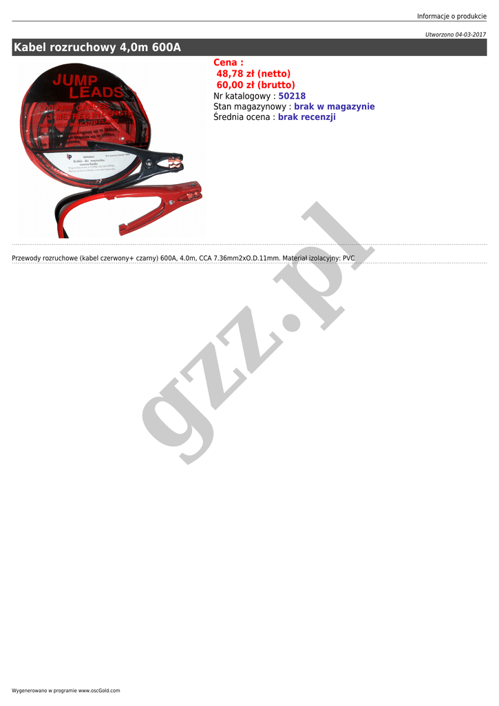 Informacje o produkcie Utworzono 04-03-2017 Kabel rozruchowy 4,0m 600A Cena : 48,78 zł (netto) 60,00 zł (brutto) .p l Nr katalogowy : 50218 Stan magazynowy : brak w magazynie Średnia ocena : brak recenzji gz z Przewody rozruchowe (kabel czerwony+ czarny) 600A, 4.0m, CCA 7.36mm2xO.D.11mm. Materiał izolacyjny: PVC Wygenerowano w programie www.oscGold.com