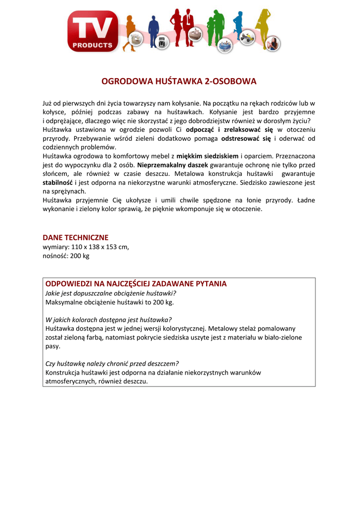 OGRODOWA HUŚTAWKA 2-OSOBOWA Już od pierwszych dni życia towarzyszy nam kołysanie. Na początku na rękach rodziców lub w kołysce, później podczas zabawy na huśtawkach. Kołysanie jest bardzo przyjemne i odprężające, dlaczego więc nie skorzystać z jego dobrodziejstw również w dorosłym życiu? Huśtawka ustawiona w ogrodzie pozwoli Ci odpocząć i zrelaksować się w otoczeniu przyrody. Przebywanie wśród zieleni dodatkowo pomaga odstresować się i oderwać od codziennych problemów. Huśtawka ogrodowa to komfortowy mebel z miękkim siedziskiem i oparciem. Przeznaczona jest do wypoczynku dla 2 osób. Nieprzemakalny daszek gwarantuje ochronę nie tylko przed słońcem, ale również w czasie deszczu. Metalowa konstrukcja huśtawki gwarantuje stabilność i jest odporna na niekorzystne warunki atmosferyczne. Siedzisko zawieszone jest na sprężynach. Huśtawka przyjemnie Cię ukołysze i umili chwile spędzone na łonie przyrody. Ładne wykonanie i zielony kolor sprawią, że pięknie wkomponuje się w otoczenie. DANE TECHNICZNE wymiary: 110 x 138 x 153 cm, nośność: 200 kg ODPOWIEDZI NA NAJCZĘŚCIEJ ZADAWANE PYTANIA Jakie jest dopuszczalne obciążenie huśtawki? Maksymalne obciążenie huśtawki to 200 kg. W jakich kolorach dostępna jest huśtawka? Huśtawka dostępna jest w jednej wersji kolorystycznej. Metalowy stelaż pomalowany został zieloną farbą, natomiast pokrycie siedziska uszyte jest z materiału w biało-zielone pasy. Czy huśtawkę należy chronić przed deszczem? Konstrukcja huśtawki jest odporna na działanie niekorzystnych warunków atmosferycznych, również deszczu.
