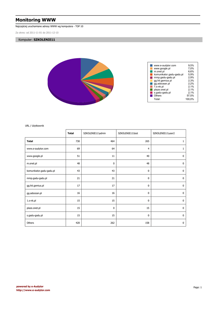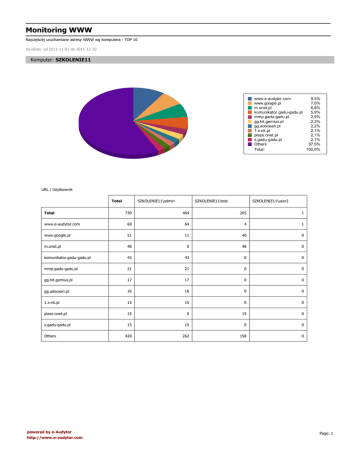 Monitoring WWW Najczęściej uruchamiane adresy WWW wg komputera - TOP 10 Za okres: od 2011-11-01 do 2011-12-10 Komputer: SZKOLENIE11 www.e-audytor.com 9,5% www.google.pl 7,0% m.onet.pl 6,6% komunikator.gadu-gadu.pl 5,9% mmp.gadu-gadu.pl 2,9% gg.hit.gemius.pl 2,3% gg.adocean.pl 2,2% 1.s-nk.pl 2,1% plaze.onet.pl 2,1% s.gadu-gadu.pl 2,1% Others 57,5% Total: 100,0% URL / Użytkownik Total SZKOLENIE11\admin SZKOLENIE11\test SZKOLENIE11\user2 730 464 265 1 www.e-audytor.com 69 64 4 1 www.google.pl 51 11 40 0 m.onet.pl 48 0 48 0 komunikator.gadu-gadu.pl 43 43 0 0 mmp.gadu-gadu.pl 21 21 0 0 gg.hit.gemius.pl 17 17 0 0 gg.adocean.pl 16 16 0 0 1.s-nk.pl 15 15 0 0 plaze.onet.pl 15 0 15 0 s.gadu-gadu.pl 15 15 0 0 420 262 158 0 Total Others powered by e-Audytor http://www.e-audytor.com Page: 1 Monitoring WWW Najczęściej uruchamiane adresy WWW wg komputera - TOP 10 Za okres: od 2011-11-01 do 2011-12-10 Komputer: BTC-PP bi.gazeta.pl 10,8% www.google.pl 9,5% www.e-audytor.com 9,3% www.google-analytics.com 9,0% gazeta.hit.gemius.pl 5,4% googleads.g.doubleclick .net 4,6% analytics.gazeta.pl 3,6% msn.gazeta.pl 3,6% www.googleadservices .com 3,6% www.gazeta.pl 3,1% Others 37,5% Total: 100,0% URL / Użytkownik Total btcp\admin 389 389 bi.gazeta.pl 42 42 www.google.pl 37 37 www.e-audytor.com 36 36 www.google-analytics.com 35 35 gazeta.hit.gemius.pl 21 21 googleads.g.doubleclick.net 18 18 analytics.gazeta.pl 14 14 msn.gazeta.pl 14 14 www.googleadservices.com 14 14 www.gazeta.pl 12 12 146 146 Total Others powered by e-Audytor http://www.e-audytor.com Page: 2