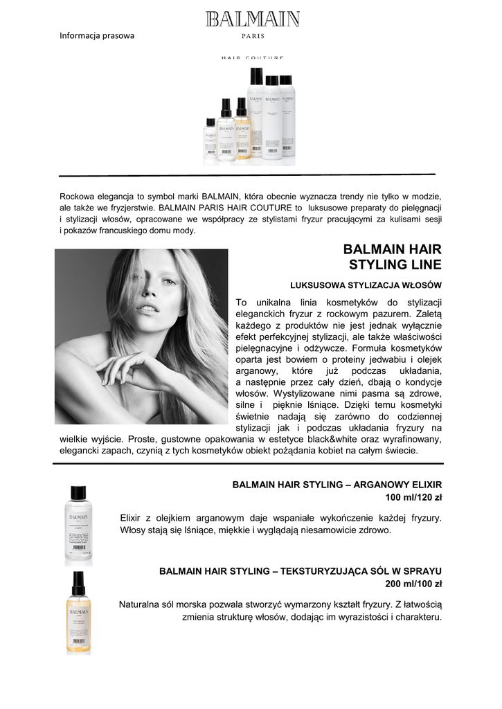 Informacja prasowa Rockowa elegancja to symbol marki BALMAIN, która obecnie wyznacza trendy nie tylko w modzie, ale także we fryzjerstwie. BALMAIN PARIS HAIR COUTURE to luksusowe preparaty do pielęgnacji i stylizacji włosów, opracowane we współpracy ze stylistami fryzur pracującymi za kulisami sesji i pokazów francuskiego domu mody. BALMAIN HAIR STYLING LINE LUKSUSOWA STYLIZACJA WŁOSÓW To unikalna linia kosmetyków do stylizacji eleganckich fryzur z rockowym pazurem. Zaletą każdego z produktów nie jest jednak wyłącznie efekt perfekcyjnej stylizacji, ale także właściwości pielęgnacyjne i odżywcze. Formuła kosmetyków oparta jest bowiem o proteiny jedwabiu i olejek arganowy, które już podczas układania, a następnie przez cały dzień, dbają o kondycje włosów. Wystylizowane nimi pasma są zdrowe, silne i pięknie lśniące. Dzięki temu kosmetyki świetnie nadają się zarówno do codziennej stylizacji jak i podczas układania fryzury na wielkie wyjście. Proste, gustowne opakowania w estetyce black&white oraz wyrafinowany, elegancki zapach, czynią z tych kosmetyków obiekt pożądania kobiet na całym świecie. BALMAIN HAIR STYLING – ARGANOWY ELIXIR 100 ml/120 zł Elixir z olejkiem arganowym daje wspaniałe wykończenie każdej fryzury. Włosy stają się lśniące, miękkie i wyglądają niesamowicie zdrowo. BALMAIN HAIR STYLING – TEKSTURYZUJĄCA SÓL W SPRAYU 200 ml/100 zł Naturalna sól morska pozwala stworzyć wymarzony kształt fryzury. Z łatwością zmienia strukturę włosów, dodając im wyrazistości i charakteru. Informacja prasowa BALMAIN HAIR STYLING – JEDWABNE PERFUMY 200 ml/130 zł (pompka 50 zł) To sekret zza kulis pokazów Balmain. Perfumy z olejem arganowym i proteinami jedwabiu sprawiają, że włosy modelek wyglądają niesamowicie lekko, świeżo, a przy tym uwodzą blaskiem i kuszącym zapachem. BALMAIN HAIR STYLING – LAKIER 300 ml/90 zł Spray utrwalający fryzurę. W zależności od upragnionego efektu i skomplikowania fryzury do wyboru mamy dwa stopnie utrwalenia: strong i medium. BALMAIN HAIR STYLING – PIANKA 300 ml/90 zł Pianka jest pierwszym krokiem wielu stylizacji. To silna podstawa dla perfekcyjnej fryzury, która przetrwa cały dzień. .