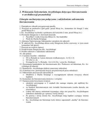 24 Nauczanie biskupów o liturgii 2. Wskazania Sekretariatu Arcybiskupa dotyczące bierzmowania w archidiecezji poznańskiej Liturgia eucharystyczna połączona z udzieleniem sakramentu bierzmowania 1. Pamiątkowe obrazki przygotowuje parafia 2. Przyjazd na probostwo (pół godz. przed Mszą św.; komentarz do liturgii 3 min. przed Mszą św.) 3. Ks. Arcybiskup wychodzi z probostwa do kościoła (3 min. przed Mszą św.) 4. Powitanie liturgiczne w drzwiach kościoła: • Pacyfikał i woda święcona (Msza św. bez kadzidła) • Pieśń do Ducha Świętego 5. Adoracja Najświętszego Sakramentu i przejście do zakrystii 6. W zakrystii Ks. Arcybiskup ubiera szaty liturgiczne (kolor czerwony; w tym czasie komentarz lub śpiew) 7. Procesja na wejście (śpiew) 8. Pozdrowienie liturgiczne (Ks. Arcybiskup) 9. Prośba rodziców o udzielenie sakramentu 10. Akt pokuty 11. Czytania mszalne - młodzież • ST (z Rytuału nr 2 poza okresem wielkanocnym - Iz 42,1-3) • NT (Dz 2,1-4) • Ewangelia (nr 5 z Rytuału - Łk 4,16-22a / czyta Ks. Dziekan) 12. Prezentacja kandydatów do bierzmowania (Ks. Proboszcz od lektorium, Ks. Arcybiskup od ołtarza) 13. Homilia Ks. Arcybiskupa (dobrze ustawiony mikrofon) 14. (Fakultatywnie: poświęcenie krzyży przyniesionych przez młodzież) 15. Odnowienie przyrzeczeń chrzcielnych • Modlitwa o Ducha Świętego z wyciągniętymi rękoma (wszyscy obecni kapłani) 16. Komentarz do bierzmowania (treściwy i zwięzły) 17. Namaszczenie krzyżmem świętym • młodzież przystępuje w 2 rzędach (do samego stopnia, jak najbliżej Ks. Arcybiskupa) • za każdym bierzmowanym stoi świadek bierzmowania (osoba dorosła, nie rówieśnicy) • Lektor lub starszy ministrant trzymający oleje stoi przed Ks. Arcybiskupem (młodzież obchodzi go z prawej i lewej strony) • Po prawej i lewej stronie Ks. Arcybiskupa stoją kapłani czytający imiona bierzmowanych • Ks. Arcybiskup nie bierzmuje tych, którzy zapomnieli „kartkę” do bierzmowania Wskazania dotyczące bierzmowania 25 • Dwaj ministranci rozdają obrazki przy ławkach, tak aby nie blokować młodzieży, która przyjęła sakrament bierzmowania • W czasie udzielania sakramentu modlitwy do Ducha Świętego lub śpiew (delikatny, nie wrzaskliwy) 18. Obmycie rąk (ciepła woda, mydło i ręcznik) 19. Modlitwa powszechna (5 wezwań; czyta młodzież) 20. Komentarz zwięzły do procesji z darami (młodzież) 21. Procesja z darami (rusza „żywo” wraz z początkiem komentarza) • świece, kielich, patena z hostią, wino i woda, kwiaty 22. Liturgia eucharystyczna 23. Komunia święta: • Ks. Arcybiskup rozdaje bierzmowanym (przystępują w dwóch rzędach do samych stopni) • W tym samym czasie księża rozdają Komunię św. pozostałym wiernym; wpierw w bocznych nawach, potem pomagają w nawie głównej. • Śpiew dziękczynny 24. Modlitwa po Komunii świętej • reprezentanci młodzieży dziękują za otrzymany Sakrament. 25. Uroczyste błogosławieństwo (z Rytuału) 26. Powrót do zakrystii • Pieśń na wyjście (ustawienie bierzmowanych do procesji w głównym ganku kościoła) 27. Adoratio Sanctissimi • Ks. Arcybiskup klęka, w tym czasie bierzmowani ruszają do wyjścia 28. Powrót na probostwo (razem z młodzieżą) (na podstawie strony internetowej archidiecezji poznańskiej Sekretariat Arcybiskupa http://www.archpoznan.org.pl/default.htm ) 3. List pasterski bpa Zbigniewa Kiernikowskiego o przeżywaniu tajemnicy paschalnej na Triduum Paschalne 2003 Biskup siedlecki Zbigniew Kiernikowski w dniu 6 kwietnia 2003 r. ogłosił List pasterski o przeżywaniu tajemnicy paschalnej na Triduum Paschalne 2003. Jego tekst opublikowany zostanie w „Anamnesis” 2004 nr 2 (37).