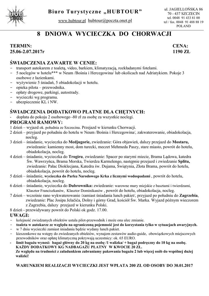 Biuro Tury styczne „ HUBTOUR” ul. JAGIELLOŃSKA 86 70 - 437 SZCZECIN www.hubtour.pl [email protected] tel. 0048 91 433 81 00 tel / fax. 0048 91 488 88 19 POLAND 8 DNIOWA WYCIECZKA DO CHORWACJI TERMIN: 25.06-2.07.2017r CENA: 1190 ZŁ ŚWIADCZENIA ZAWARTE W CENIE: - transport autokarem z toaletą, video, barkiem, klimatyzacją, rozkładanymi fotelami. - 5 noclegów w hotelu*** w Neum /Bośnia i Hercegowina/ lub okolicach nad Adriatykiem. Pokoje 3 osobowe z łazienkami. - wyżywienie 5 śniadań, 5 obiadokolacji w hotelu. - opieka pilota – przewodnika. - opłaty drogowe, parkingi, autostrady. - wycieczki wg programu. - ubezpieczenie KL i NW. ŚWIADCZENIA DODATKOWO PŁATNE DLA CHĘTNYCH: - dopłata do pokoju 2 osobowego -80 zł za osobę za wszystkie noclegi. PROGRAM RAMOWY: 1 dzień – wyjazd ok. południa ze Szczecina. Przejazd w kierunku Chorwacji. 2 dzień – przyjazd po południu do hotelu w Neum /Bośnia i Hercegowina/, zakwaterowanie, obiadokolacja, nocleg. 3 dzień – śniadanie, wycieczka do Medjugorie, zwiedzanie: Góra objawień, dalszy przejazd do Mostaru, zwiedzanie: kamienny most, dom turecki, meczet Mehmeda Paszy, stare miasto, powrót do hotelu, obiadokolacja, nocleg. 4 dzień – śniadanie, wycieczka do Trogiru, zwiedzanie: Spacer po starymi miecie, Brama Lądowa, katedra Św. Wawrzyńca, Brama Morska, Twierdza Karmelengo, następnie przejazd i zwiedzanie Splitu, zwiedzanie: Pałac Dioklecjana, Katedra św. Dujama, Świątynia, Złota Brama, powrót do hotelu, obiadokolacja, powrót do hotelu, nocleg. 5 dzień – śniadanie, wycieczka do Parku Narodowego Krka z licznymi wodospadami , powrót do hotelu, obiadokolacja, nocleg. 6 dzień – śniadanie, wycieczka do Dubrownika: zwiedzanie: warowne mury miejskie z basztami i twierdzami, Klasztor Franciszkanów, Klasztor Dominikanów , powrót do hotelu, obiadokolacja, nocleg. 7 dzień – wcześnie rano wykwaterowanie /zamiast śniadania lunch pakiet/, przyjazd po południu do Zagrzebia, zwiedzanie: Plac Josipa Jelačića, Dolny i górny Grad, kościół Św. Marka. Wyjazd późnym wieczorem z Zagrzebia, dalszy przejazd w kierunku Polski. 8 dzień - przewidywany powrót do Polski ok godz. 17.00. UWAGI: - kolejność zwiedzanych obiektów ustala pilot-przewodnik i może ona ulec zmianie. toaleta w autokarze ze względu na ograniczoną pojemność jest do korzystania tylko w sytuacjach awaryjnych. w 7 dniu wycieczki zamiast śniadania będzie wydany lunch pakiet. kieszonkowe na wstępy do zwiedzanych obiektów, wynajem zestawów audio-guide, obowiązkowych miejscowych przewodników oraz opłatę klimatyczną pokrywają uczestnicy: ok. 65 EURO. limit bagażu wynosi: bagaż główny do 20 kg na osobę /1 walizka/ + bagaż podręczny do 10 kg na osobę. KAŻDY DODATKOWY KG NADBAGAŻU PŁATNY W KWOCIE 20 ZŁ. Ze względu na trudności z załadunkiem zabraniamy pakowania bagażu 2 lub więcej osób do wspólnej dużej walizki! WARUNKIEM REALIZACJI WYCIECZKI JEST WPŁATA 200 ZŁ OD OSOBY DO 30.01.2017