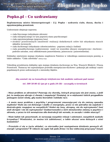 Popko.pl - Co uzdrawiamy Dyplomowany mistrz bioenergoterapii - Z.J. Popko - uzdrawia ciało, duszę, ducha i egzystencjalną przestrzeń. Uzdrawianie obejmuje naprawę: ciała fizycznego (odzyskanie zdrowia) ciała energetycznego (w tym poprawę stanu psychicznego) ciała egzystencjalnego (poprawa losu) struktur przestrzennych (możliwość realizacji dodatkowych celów lub odzyskania starych układów życiowych) ciała duchowego (odzyskanie człowieczeństwa - poprawa relacji z ludźmi) ciała ponadduchowego (uaktywnienie wejść we wszystkie obszary energetyczne i duchowe podróże astralne, oraz odblokowanie jasnowidzenia, jasnoczucia i jasnowiedzenia). Dokładne omówienie mojego działania znajdziecie Państwo w videoblogu zamieszczonym poniżej, a także zakładce: "Ciała człowieka" (kliknij tutaj) Videoblog przedstawia dokładny opis mojego działania duchowego na Was, Waszych Bliskich i Waszą Przestrzeń. Tłumaczy też najważniejsze prawidła energetyczno-duchowe i pokazuje jak uniknąć często popełnianych przez uzdrawianych z niewiedzy błędów. Aby umówić się na konsultacje telefoniczne lub osobiste zadzwoń pod numer tel. 509 58 00 42 (pn-pt w godz.10-18) - szczegóły w terminach - Masz problem ze zdrowiem? Pożerają cię choroby, których przyczyna nie jest znana, a jeśli już, to medycyna oferuje ci chemię i amputację? Pamiętaj, że w większości takich przypadków pomagam nawet wtedy, gdy nauka bezradnie rozkłada ręce. - A może masz problem z psychiką i programami zmuszającymi cię do zmiany sposobu myślenia? Stało się coś dziwnego i siadła ci energetyka, przez co nie potrafisz się uspokoić i destrukcyjnie reagujesz na wszystkich? Stałeś się inny, okropny, nie do wytrzymania? Inni stali okropni i nie do wytrzymania? Zaobserwowałeś u nich nienaturalne zmiany w psychice i zdrowiu, a przez to ich wewnętrzna siła destrukcji tak wzrosła, że zaczęła i ciebie niszczyć? - Może ludzie tak powariowali, że naruszają wszystkie relacje i zależności, wszystkich naokoło krzywdząc? Wiedziałeś, że można ich zablokować, a tobie ukazać sens dalszych z nimi kontaktów? - Przestało ci się w życiu układać, co nierzadko jest następstwem działania pewnych sił, energii i programów? W robocie się sypie lub pada firma i to bez widocznej przyczyny? Innym Strona: 1/4 http://www.popko.pl/zakres,uzdrawiania,page.xhtml [2017-03-04 06:38:45] na tym samym terenie wychodzi, a ty się bez przerwy potykasz? Sądzisz, że to ma związek z konkretnymi ludźmi lub wydarzeniami? Z przeszłością lub z zablokowaniem ruchów w przyszłości? - Atakują cię siły i istoty z innych wymiarów? Ktoś lub coś steruje twoimi myślami i emocjami, a nawet zaczyna się bawić twoim własnym życiem? Ktoś lub coś pozbawia cię energii lub sił witalnych? Raz jesteś chory, to znów zdrowy? Przychodzą bóle i niekontrolowane zmiany nastroju? Podejrzewasz, że ktoś z żywych cię przeklął lub że działa coś zza grobu lub z poziomu pasm wrogich twojej egzystencji? Czujesz, że ktoś cię zamyka w czarnej dziurze i że lada moment odechce ci się wszystkiego? - A może chcesz odbudować więzi międzyludzkie lub zmienić układ sił energetycznych tak, by narzucić własne cele? Może chcesz po prostu wiedzieć, czy dany związek ma sens, czy ktoś cię nie oszukuje i nie wykorzystuje, czy w pracy i miłości możesz czuć się bezpiecznie i czy warto o coś walczyć, bo takie są twoje potrzeby i kierunkowane starania? - A może szukasz wyzwolenia od naleciałości karmicznych (Księga Cieni i cienie przeszłości) lub chcesz zrzucić z siebie jarzmo kodu karmicznego, który stopuje moc, jasnowidzenie, jasnoczucie, jasnowiedzenie, zdolności uzdrowicielskie i w zawieszeniu utrzymuje wszystkie rodzaje twojej inteligencji oraz wręcz daremnym czyni wysiłki zmierzające do eksploracji światów innowymiarowych? Czyżby nadszedł czas twojego przebudzenia i potrzeba ci nie oszukańczych słów, od których puchnie ezoteryka i nadęty Kościół, tylko pomocnej dłoni, która wstawi cię w pasma duchowe i pokaże, jak samemu, już bez udziału ludzi wzrastać? - A może nie tylko przestało ci się w życiu układać, ale i czujesz całym sobą, że ktoś na zawsze zamknął ci drzwi do szczęśliwej lub bardziej udanej przyszłości? Jesteś przekonany, że działają tu czynniki, które nikomu nie są jeszcze znane - ? (Podpowiem: skoro udaje mi się blokować większość nadajników UFO, umieszczanych w ciele ludzkim, to może i twój przypadek nie jest taki beznadziejny?) Cokolwiek cię męczy i niepokoi, ma swoją przyczynę w układach fizycznych, energetycznych i duchowych, które zawsze można prześwietlić, zmodyfikować i najczęściej tak ustawić, by "wolny" od ograniczeń człowiek już sam dalej sobie radził. To wszystko można zrobić dla twojego szczęścia, zdrowia i radości. Nie martw się, odbuduję ci nie tylko ciało egzystencjalne, ale i tkaną przez nie strukturę przestrzeni. Oczywiście możesz ją na powrót uszkodzić, zdewastować, ale i równie dobrze możesz ją potem sam naprawić i wzmocnić. Wszystkie informacje na ten temat znajdziesz na tej stronie. Nie ma tu znaczenia, czy pada ci firma, czy dziesięć firm, czy tylko przestało ci wychodzić proste polskie życie, bowiem wszystko, co do tej pory robiłeś, można odtworzyć i utrzymać. To wszystko jest do osiągnięcia. To wszystko zawiera się w modyfikowalnej strukturze przestrzeni. Niewielu wie, że najwyżej w 20% sytuacji życiowych tworzymy potęgą myśli i siłą mięśni, że aż w 80% nasz sukces zależy od energetyki, od pasm, których istnienia nawet w sobie nie podejrzewamy. Wystarczą niewielkie niekorzystne zmiany w osobistych polach energetycznych, by posypało się zdrowie, finanse, relacje z ludźmi, a nawet runęła cała egzystencja. Jestem właśnie po to, by wyrównywać te pola, by odzyskiwać utracone pasma, by Strona: 2/4 http://www.popko.p