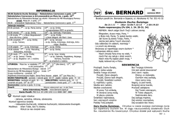 INFORMACJA 30 08.06 Zesłanie Ducha Świętego – Nabożeństwo Czerwcowe o godz. 17 Nabożeństwo Czerwcowe w dni powszednie po Mszy św. o godz. 1825 Nabożeństwa do Miłosierdzia Bożego we wtorki i Nowenna do MB Nieustającej Pomocy przed Mszą św. o godz. 1745 08.06 – Uroczystość Najświętszej Trójcy - Nabożeństwo Czerwcowe o godz. 1730 Intencje mszalne: 09.06 poniedz. 730 – za śp. Marię Janinę 1800 – za śp. Emilię - wynagradzająca NSPJ za grzechy 10.06 wtorek.: 700 – za śp. Emilię 1800 – śp. Gertrudę i Franciszka 00 11.06 środa: 7 – o Boże błogosławień- 1800 – za śp. Emilię stwo dla Anny i Jacka - o Boże błogosł. dla Marii i Jana 12.06 czwartek: 700 - za śp. Emilię 1800 – za śp. Janusza - za śp. Tamarę - za śp. Emilię, Antoniego, Andrzeja, Antoniego i Rodzinę 13.06 piątek: 700 - za śp. Antoniego 1800 – za śp. Emilię 14.06 sobota: 700 - za śp. Marcelinę, 1800 – za śp. Emilię Aleksandra, Andrzeja 15.06 niedz.: 730 – za śp. Emilię 900 – za śp. Jana i Anielę 00 10 – za śp. Janinę i Teresę 1115 – za śp. Gabrielę, Magdalenę, Alojzego, 30 12 – za śp. Bogdana i zm. z rodziny Barbarę, Ryszarda 1800 – za zmarłych z rodziny LITURGIA: Msze św. w niedzielę: 730, 900, 10oo, 1115 (dla dzieci), 1230, 1800 w dni powszednie: 700, 1800 Nabożeństwo do Miłosierdzia Bożego: wtorek 1745 Nowenna do MB Nieustającej Pomocy: środa 1745 Grupa modlitewna: czwartek 2000 Wspólnota Intronizacyjna Najśw. Serca Pana Jezusa: piątek 18 30 (po Mszy św.) BIURO PARAFIALNE: poniedz. i wtorek godz. 16-17; piątek i sobota godz. 9 – 10 WIDEOTEKA: niedziela od godz. 10 – 11, BIBLIOTEKA: niedziela godz. 10 - 12 czwartek od godz. 1830 do 1900. poniedziałek i środa godz. 1730 – do 18-tej Kawiarenka: czynna w godz. 9-13-tej Zmarli: Wieczny odpoczynek racz im dać Panie Adres internetowy Parafii: www.bernard.sopot.pl Konto Parafii: PKO S.A. 54 1240 1242 1111 0000 1587 2885 Wymień części różańca: - żałosna, samotna, miłosna, oświecenia. Wymień tajemnice światła: - Ustawienie Eucharystii, Ustalenie Eucharystii, Ustanowienie Ewangelii. Modlitwa: Ufam Tobie, boś Ty biedny. Któryś za nas cierpiał rano. 707 św. BERNARD 08. czerwca 2014 Biuletyn parafii św. Bernarda w Sopocie, ul. Abrahama 41 Tel. 551-41-32 Zesłanie Ducha Świętego Dz 2:1-11 * 1Kor 12:3b-7.12-13 * J 20:19-23 Psalm responsoryjny (Ps 104, 1. 24. 29-31. 34) REFREN: Niech zstąpi Duch Twój i odnowi ziemię. Błogosław, duszo moja, Pana, * o Boże mój, Panie, Ty jesteś bardzo wielki. Jak liczne są dzieła Twoje, Panie, * ziemia jest pełna Twych stworzeń. Gdy odbierasz im oddech, marnieją * i w proch się obracają. Stwarzasz je napełniając swym duchem * i odnawiasz oblicze ziemi. Niech chwała Pana trwa na wieki, * niech Pan się raduje z dzieł swoich. Niech miła Mu będzie pieśń moja, * będę radował się w Panu. SEKWENCJA Przybądź, Duchu Święty, Ześlij z nieba wzięty Światła Twego strumień. Przyjdź, Ojcze ubogich, Przyjdź, Dawco łask drogich, Przyjdź, Światłości sumień. O, najmilszy z gości, Słodka serc radości, Słodkie orzeźwienie. W pracy Tyś ochłodą, W skwarze żywą wodą, W płaczu utulenie. Światłości najświętsza, Serc wierzących wnętrza Poddaj Twej potędze. Bez Twojego tchnienia Cóż jest wśród stworzenia? Jeno cierń i nędze. Obmyj, co nieświęte, Oschłym wlej zachętę, Ulecz serca ranę. Nagnij, co jest harde, Rozgrzej serca twarde, Prowadź zabłąkane. Daj Twoim wierzącym, W Tobie ufającym, Siedmiorakie dary. Daj zasługę męstwa, Daj wieniec zwycięstwa, Daj szczęście bez miary. Dary Ducha Świętego. Chrystus w czasie swojego ziemskiego życia był napełniony Duchem Św. W ciągu nauczycielskiej działalności Duch Św. nieustannie Mu towarzyszył. Chrystus działał pod wpływem Ducha 707 - 1 Św. i ostatecznie przez Ducha św. ofiarował samego siebie Ojcu za nasze grzechy . Co to znaczy dla nas, dzieci Bożych, wyznawców Chrystusa? Chrystus obiecuje swemu Kościołowi, czyli nam, Ducha Św., abyśmy byli przez Niego prowadzeni, abyśmy byli Mu posłuszni, abyśmy pełnili wolę Ojca tak, jak On sam, po to się narodził aby pełnić wolę Ojca. Sam Duch Św. jest pierwszorzędnym darem, posłany przez Ojca i Syna. Jest Duch Św. Darem samym w sobie danym Kościołowi i dla Kościoła. W tymże Duchu otrzymujemy inne dary: miłości, mądrości, rady, męstwa, zrozumienia, wiedzy i bojaźni Bożej. Przez dar miłości, grzeszna, słaba osoba ludzka jest wewnętrznie przemieniana, transformowana w umiłowane dziecko Boże. I to jest podstawowe znaczenie wszystkich darów Ducha Świętego. Trzeba jednak pamiętać, że Duch Św. nie jest udzielany indywidualnie każdemu z nas i dla każdego z nas oddzielnie, prywatnie. Raczej należy rozumieć, że jest to Dar Chrystusa dla Kościoła i w Kościele. Dlatego też wszystkie dary Ducha Św. muszą i powinny być używane dla dobra, dla budowania Kościoła i w Kościele, bo Kościołowi Chrystus obiecał posłać Ducha Świętego, a nie indywidualnym jednostkom. Kto chciałby sobie w jakikolwiek sposób „przywłaszczyć Ducha Św.” ten nadużywa i ostatecznie sprzeciwia się Duchowi Świętemu, Który jest Duchem Jedności i Miłości. A wszystko, co nie służy jedności, nie pochodzi od Ducha Świętego, bo owocem Ducha jest jedność. Tylko w tym kontekście możemy w pełni zrozumieć wydarzenie, które opisują dzisiejsze czytania liturgiczne i samemu przygotować się na przyjęcie Ducha Świętego i Jego darów. Warto też w tym kontekście pokusić się o zrozumienie owych siedmiu darów Ducha Świętego, udzielanych wiernym w Kościele i dla Kościoła. Jak wtedy wygląda dar miłości w moim życiu? Dar miłości do Kościoła, umiłowania Kościoła, i dar miłości Boga i bliźniego. Jak wygląda dar mądrości, rady, zrozumienia i wiedzy? Czy korzystam z tych darów? Czy też mądrość zastąpiłem przeb